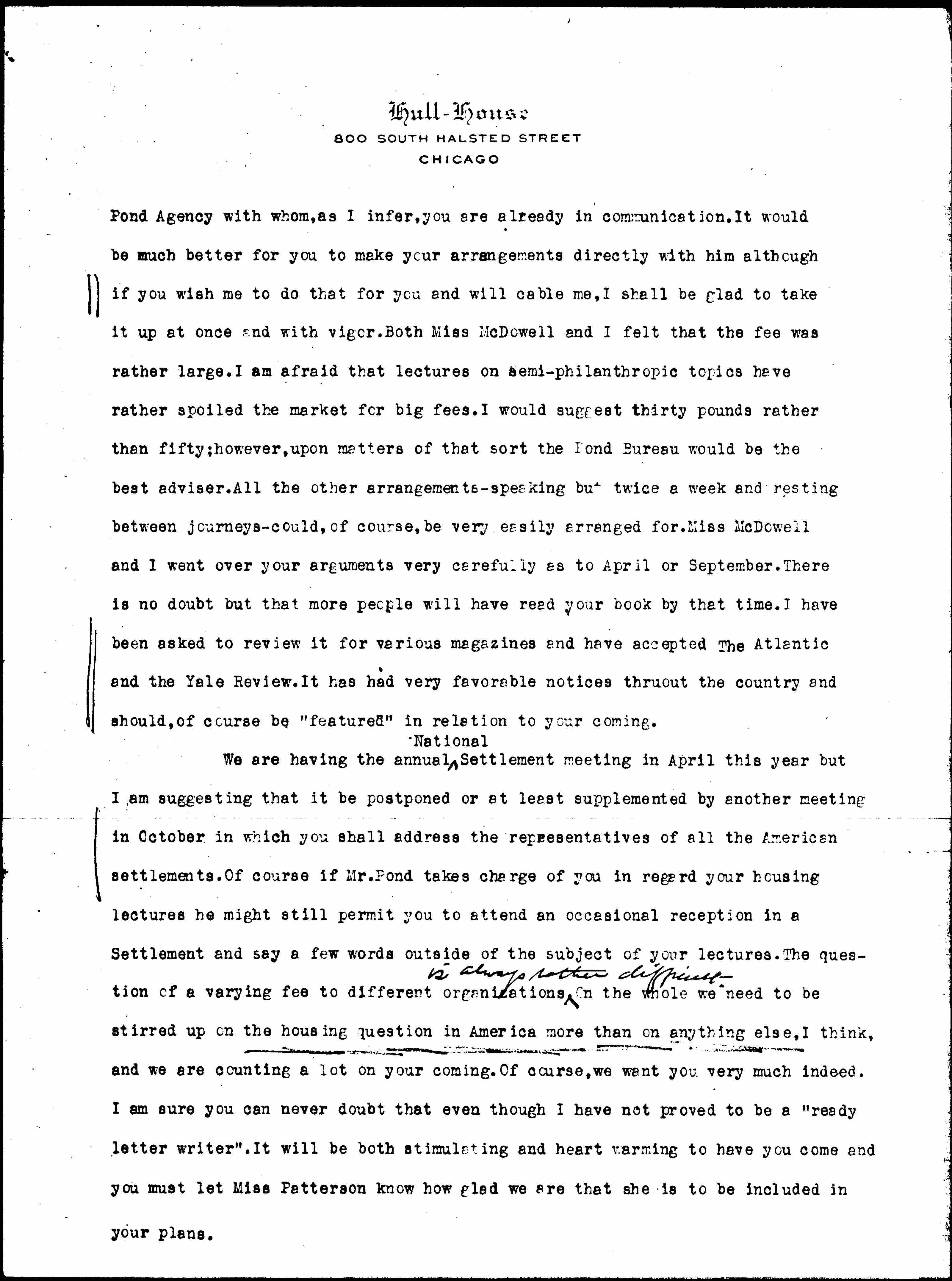 We are having the annual ↑National↓ Settlement meeting in April this year but I am suggesting that it be postponed or at least supplemented by another meeting in October in which you shall address the representatives of all the American settlements. Of course if Mr. Pond takes charge of you in regard your housing lectures he might still permit you to attend an occasional reception in a Settlement and say a few words outside of the subject of your lectures. The question of a varying fee to different organizations ↑is always rather difficult.↓ On the whole we need to be stirred up on the housing question in America more than anything else, I think, and we are counting a lot on your coming. Of course, we want you very much indeed. I am sure you can never doubt that even though I have not proved to be a "ready letter writer". It will be both stimulating and heart warming to have you come and you must let Miss Patterson know how glad we are that she is to be included in your plans. [page 3]