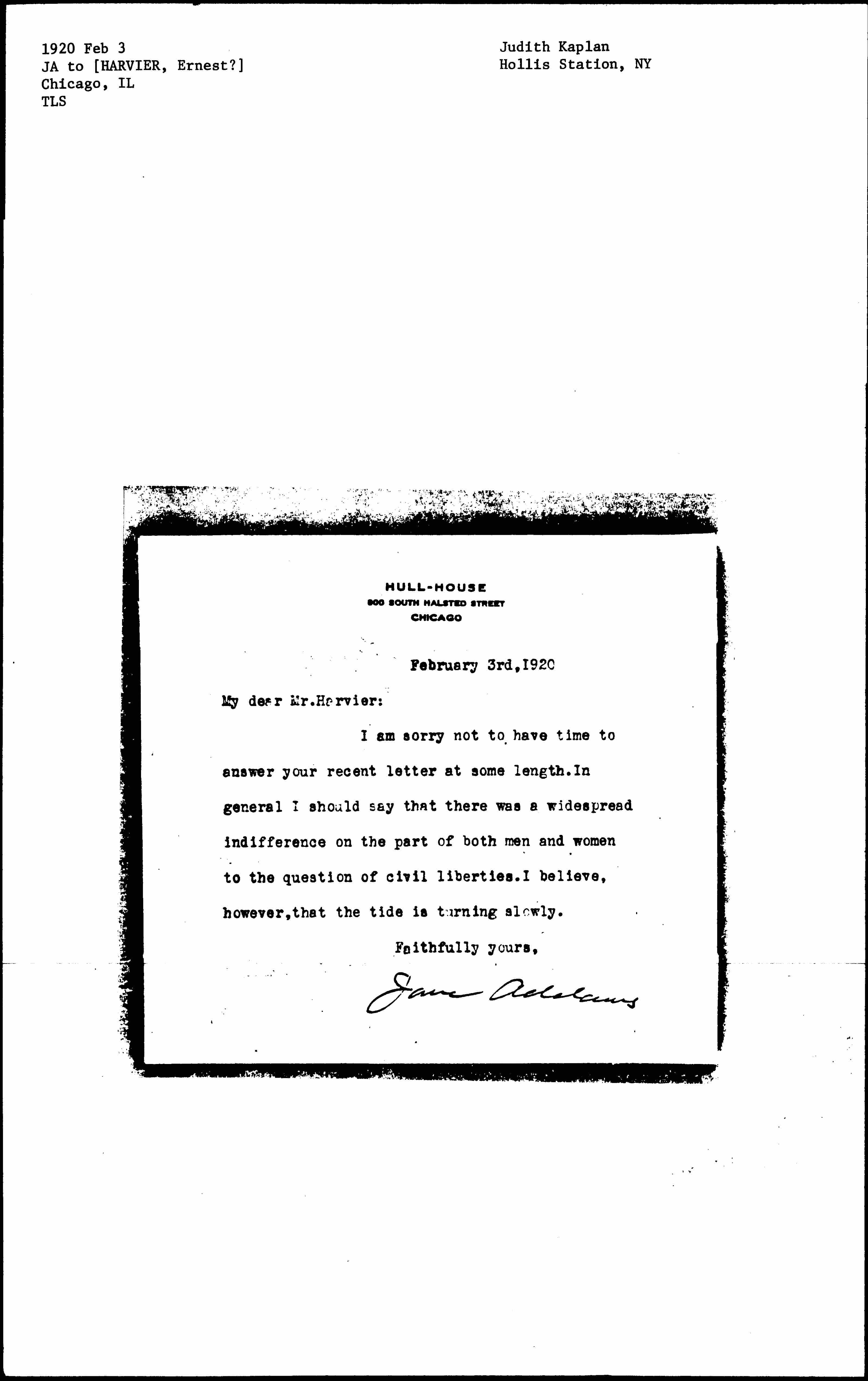 I am sorry not to have time to answer your recent letter at some length. In general I should say that there was a widespread indifference on the part of both men and women to the question of civil liberties. I believe, however, that the tide is turning slowly.