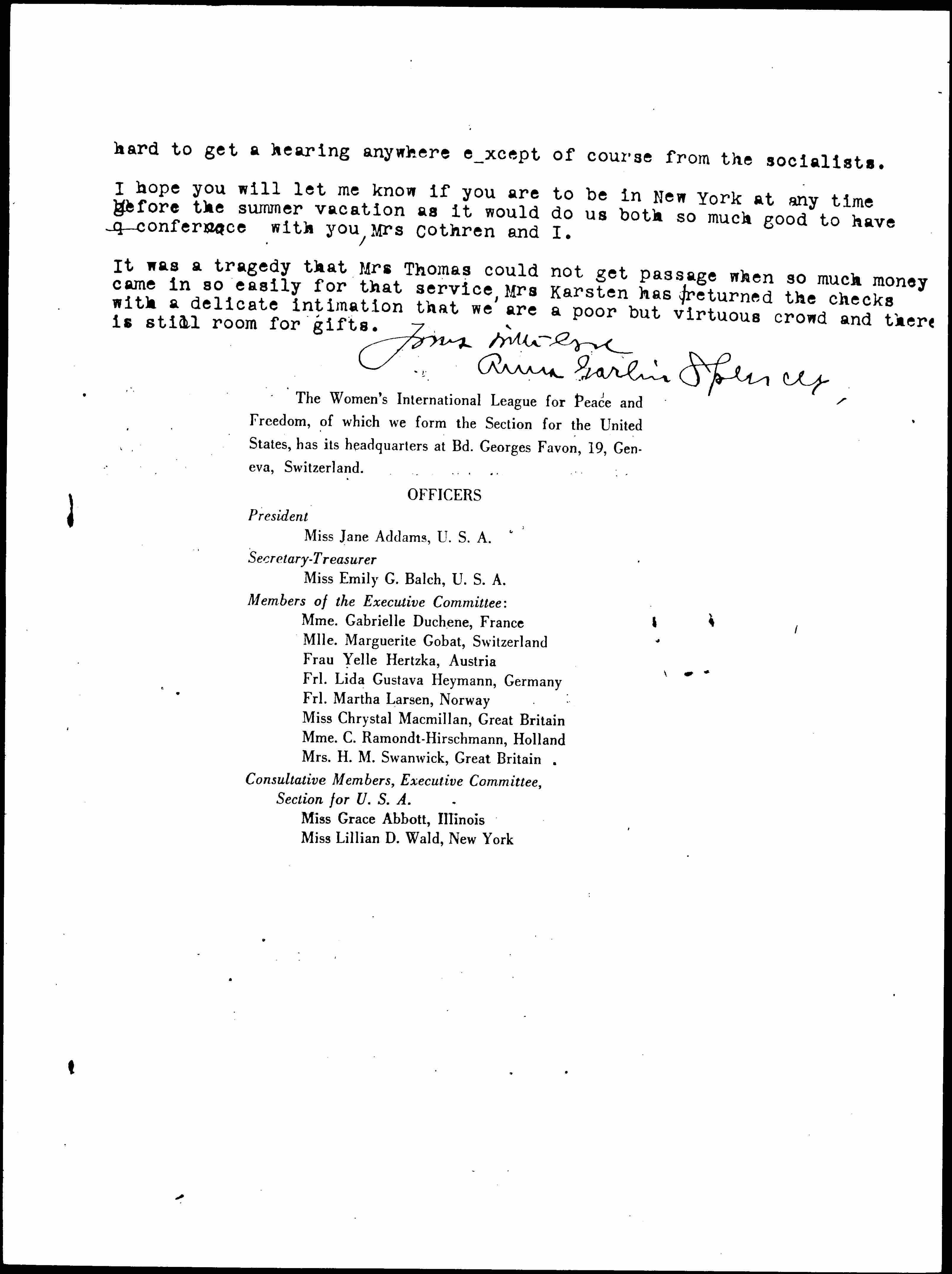 It was a tragedy that Mrs Thomas could not get passage when so much money came in so easily for that service. Mrs Karsten has returned the checks with a delicate intimation that we are a poor but virtuous crowd and there is still room for gifts.