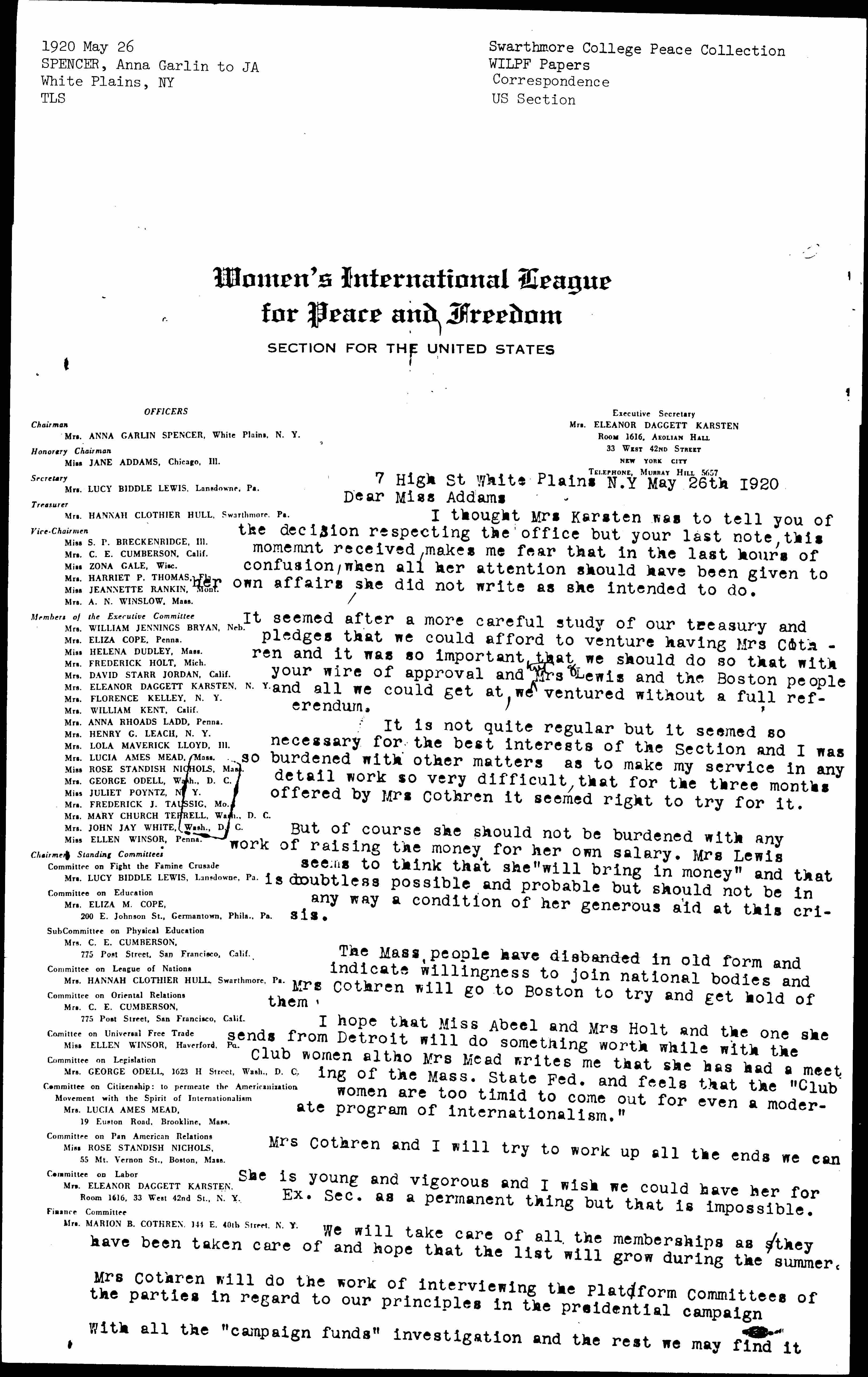 I hope that Miss Abeel and Mrs Holt and the one she sends from Detroit will do something [worthwhile] with the Club women [although] Mrs Mead writes me that she has had a meeting of the Mass. State Fed. and feels that the "Club women are too timid to come out for even a moderate program of internationalism."
