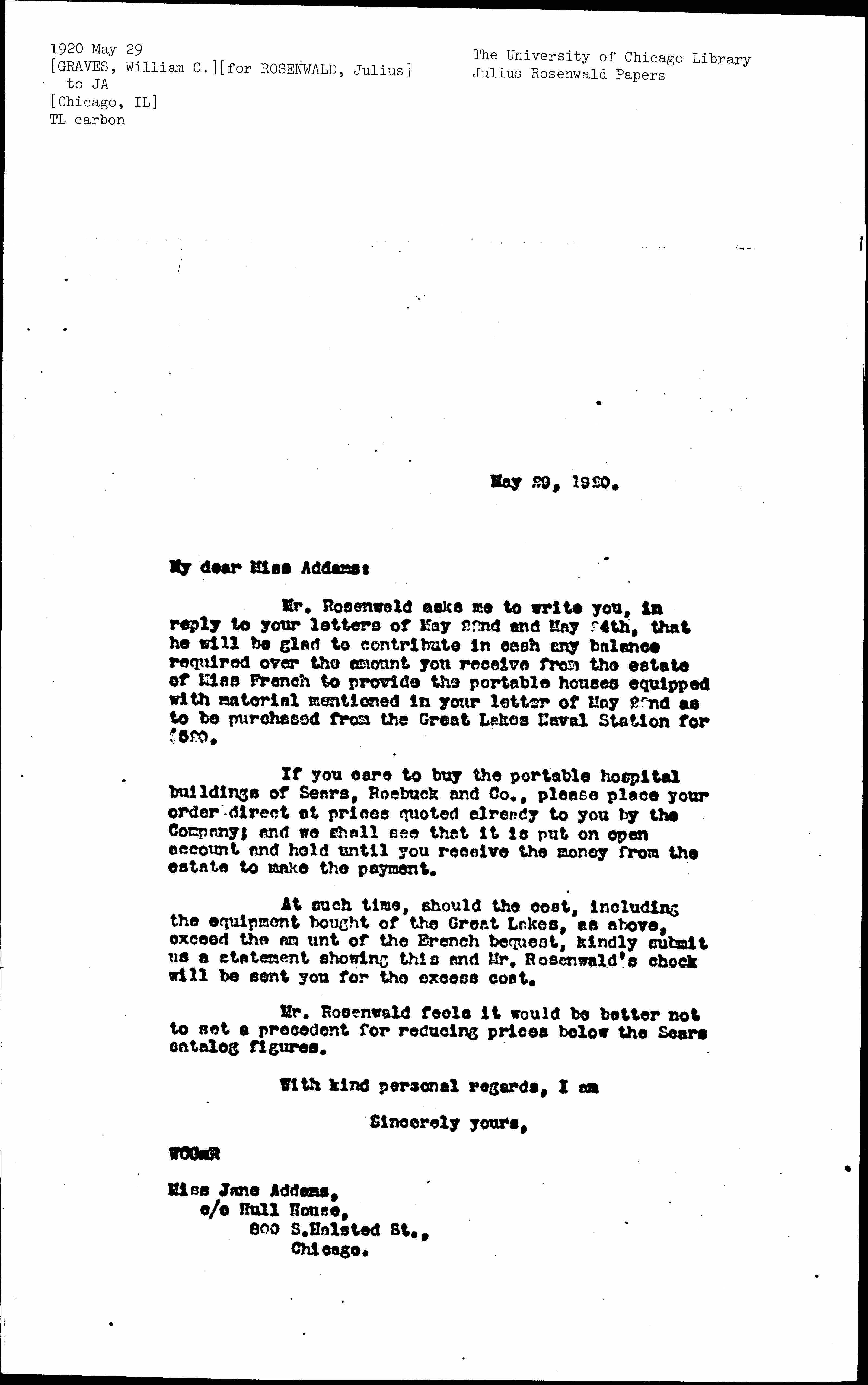 Mr. Rosenwald asks me to write you, in reply to your letters of May 22nd and May 24th, that he will be glad to contribute in cash any balance required over the amount you receive from the estate of Miss French to provide the portable houses equipped with material mentioned in your letter of May 22nd as to be purchased from the Great Lakes Naval Station for $520.