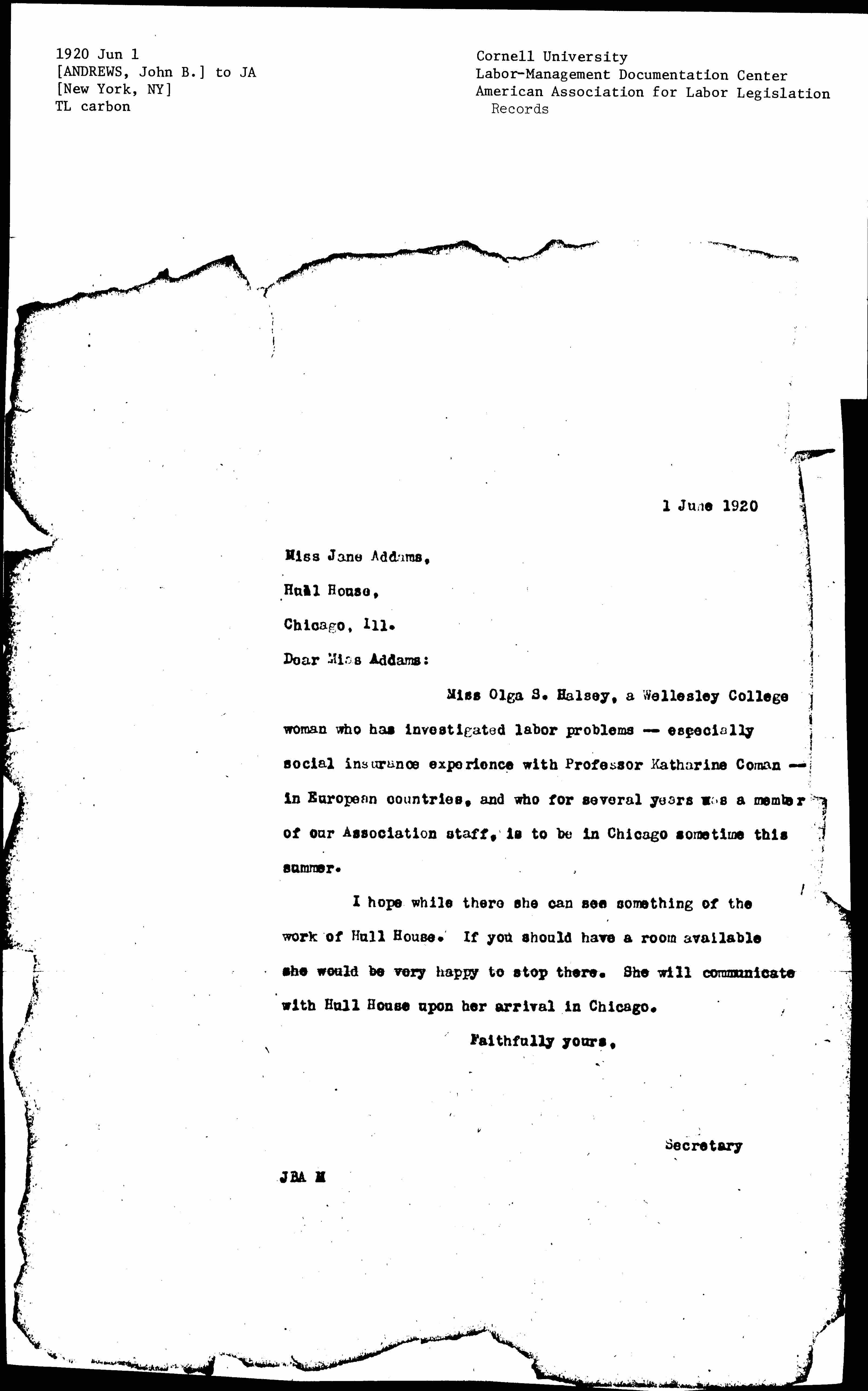 Miss Olga S. Halsey, a Wellesley College woman who has investigated labor problems -- especially social insurance experience with Professor Katharine Coman -- in European countries, and who for several years was a member of our Association staff, is to be in Chicago sometime this summer.