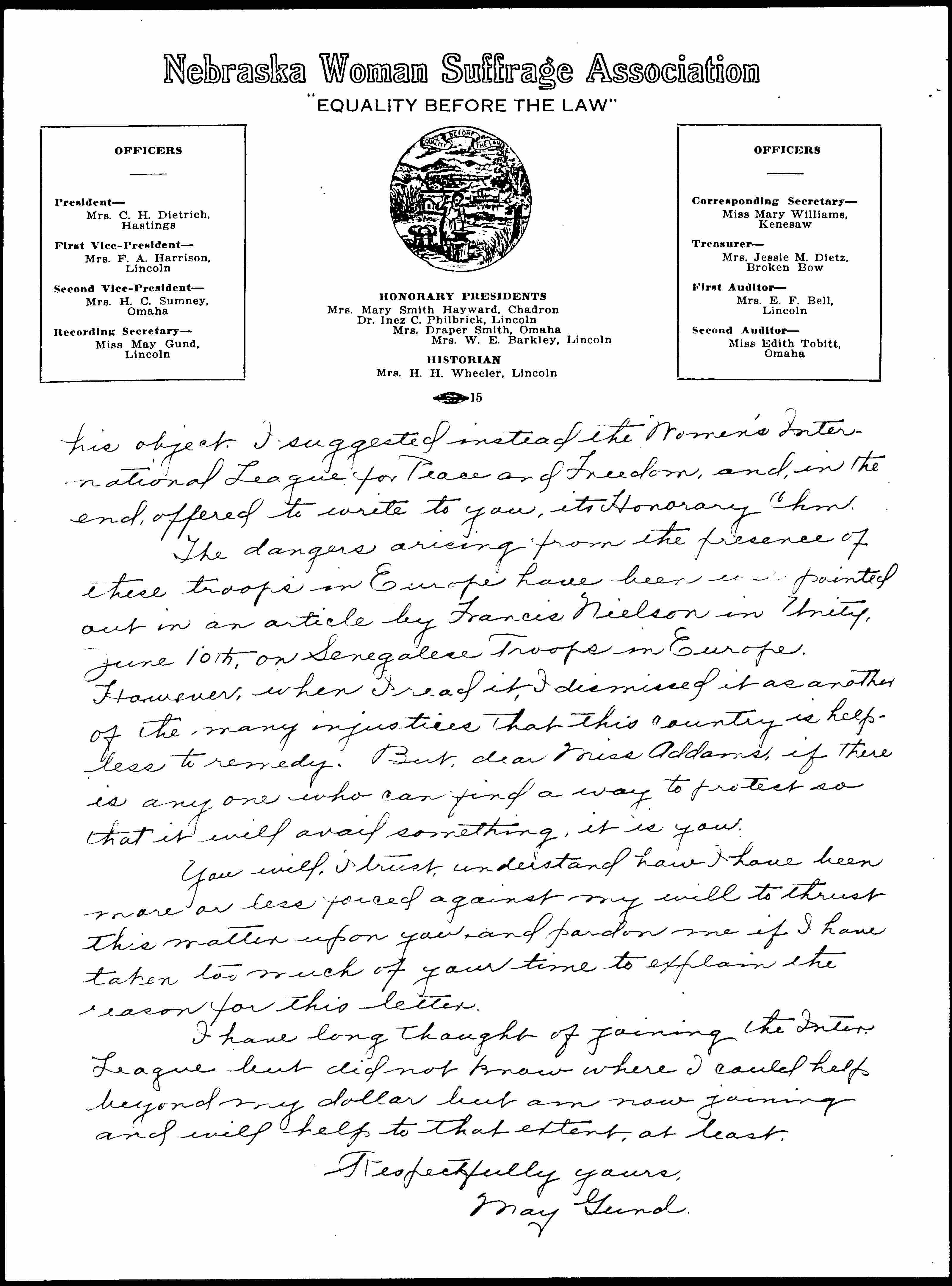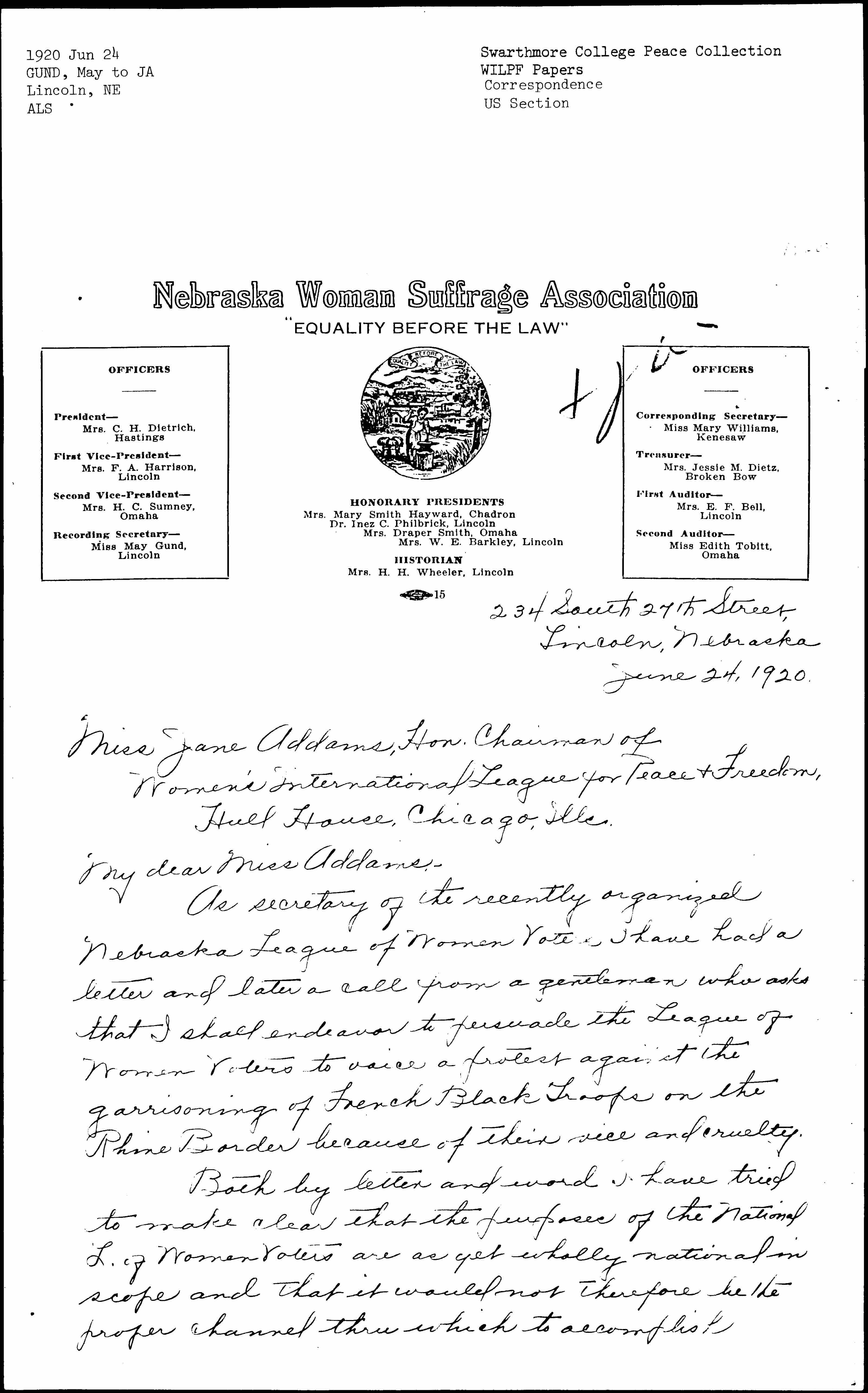 As secretary of the recently organized Nebraska League of Women Voters I have had a letter and later a call from a gentleman who asks that I shall endeavor to persuade the League of Women Voters to raise a protest against the garrisoning of French Black Troops on the Rhine Border because of their vice and cruelty.