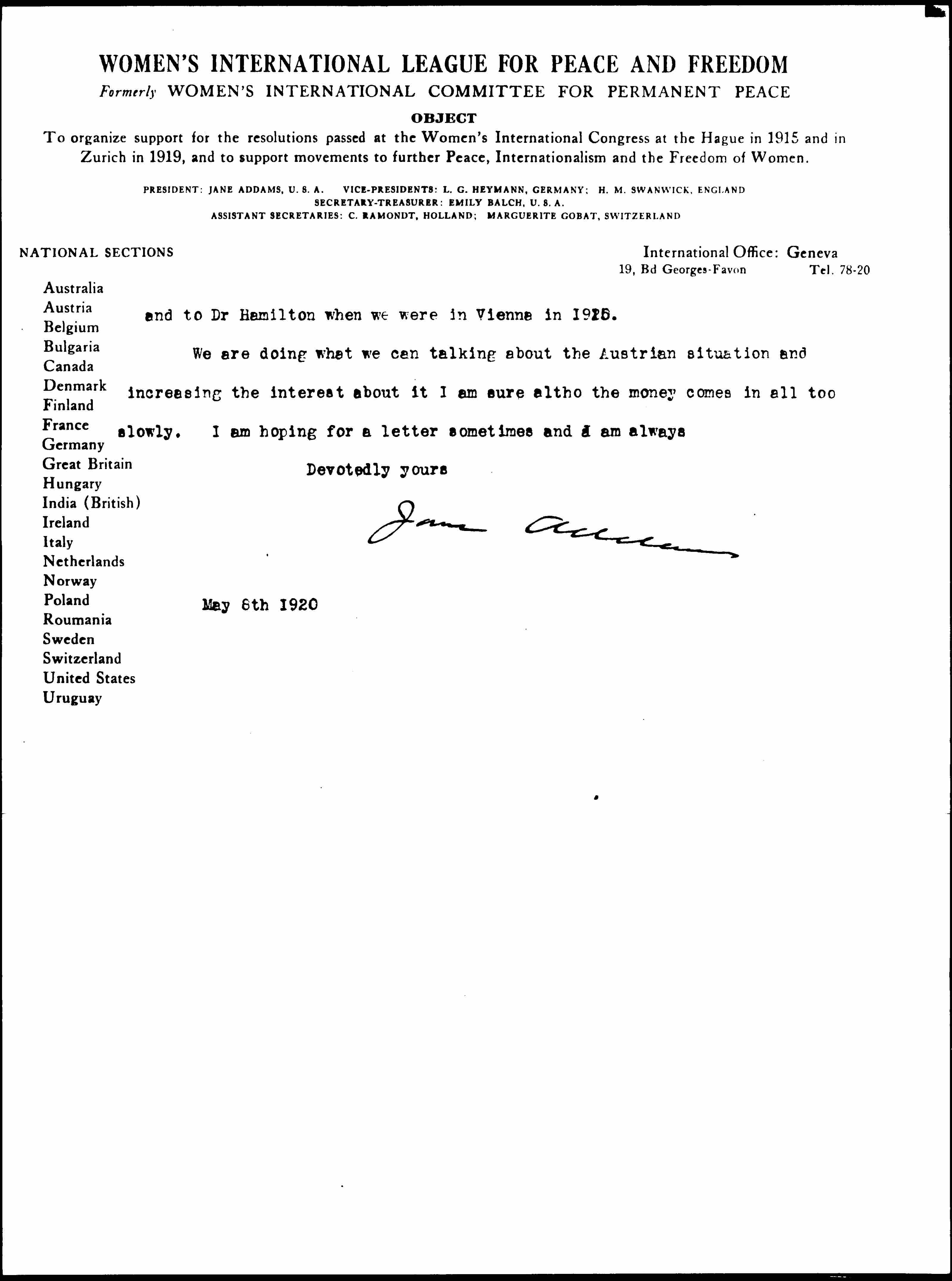 I have had some very touching letters from Vienna. Could you look up Frau Olga Misar? Her husband is a school-master, I think. She wrote us for help for the poorer members of our own Woman's Peace organization. We sent some of the food drafts to her in care of Frau Beer-Angerer 2 Pensinger Strasse XIII Vienna. We also sent something to Frau Helen Scheu-Reisz, Laroche Gasse Wien XIII. The latter was at our meeting in Zurich and a most interesting person. Perhaps you could call on her, on general principles as it were giving her my greetings and so on. Frau Misar I dearly love, she was awfully nice to me [page 2] and to Dr Hamilton when we were in Vienna in 1915.