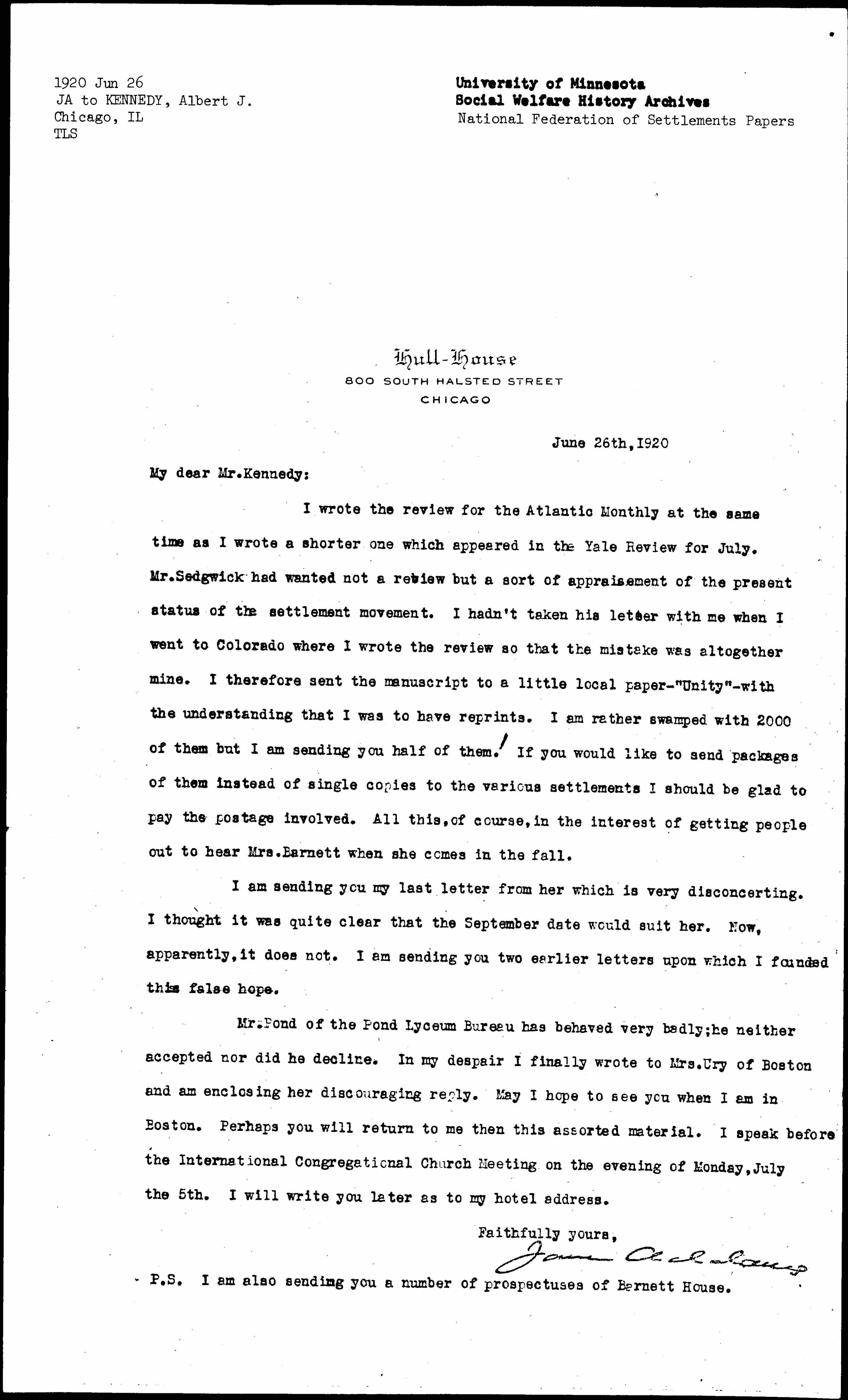 I wrote the review for the Atlantic Monthly at the same time as I wrote a shorter one which appeared in the Yale Review for July. Mr. Sedgwick had wanted not a review but a sort of appraisement of the present status of the settlement movement. I hadn't taken his letter with me when I went to Colorado where I wrote the review so that the mistake was altogether mine. I therefore sent the manuscript to a little local paper -- "Unity" -- with the understanding that I was to have reprints. I am rather swamped with 2000 of them but I am sending you half of them! If you would like to send packages of them instead of single copies to the various settlements I should be glad to pay the postage involved. All this, of course, in the interest of getting people out to hear Mrs. Barnett when she comes in the fall.
