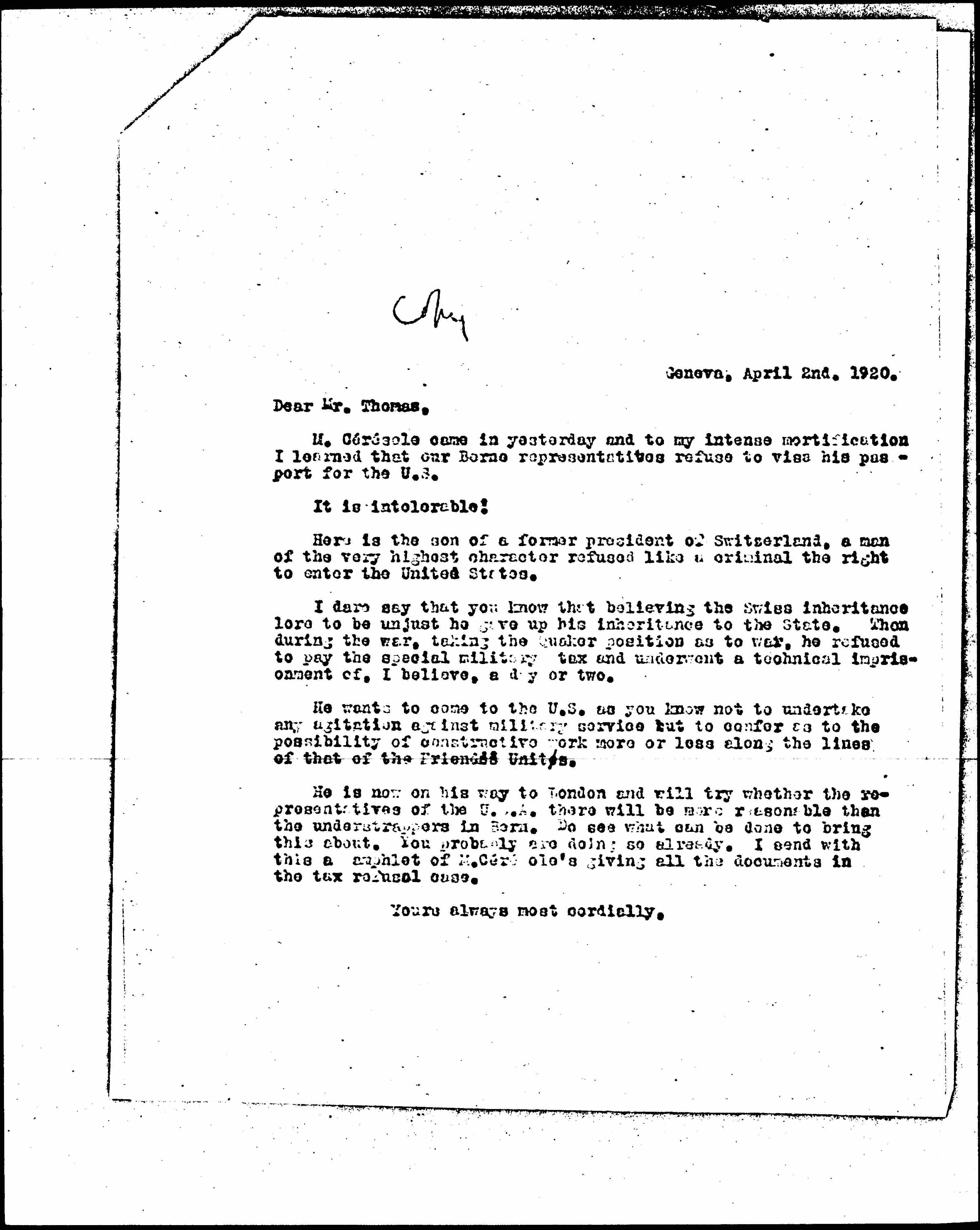 He is now on his way to London and will try whether the representatives of the U.S.A. there will be more reasonable than the understrappers in [Berne]. Do see what can be done to bring this about. You probably are doing so already. I send with this a [pamphlet] of M. Cérésole’s giving all the documents in the tax refusal case.