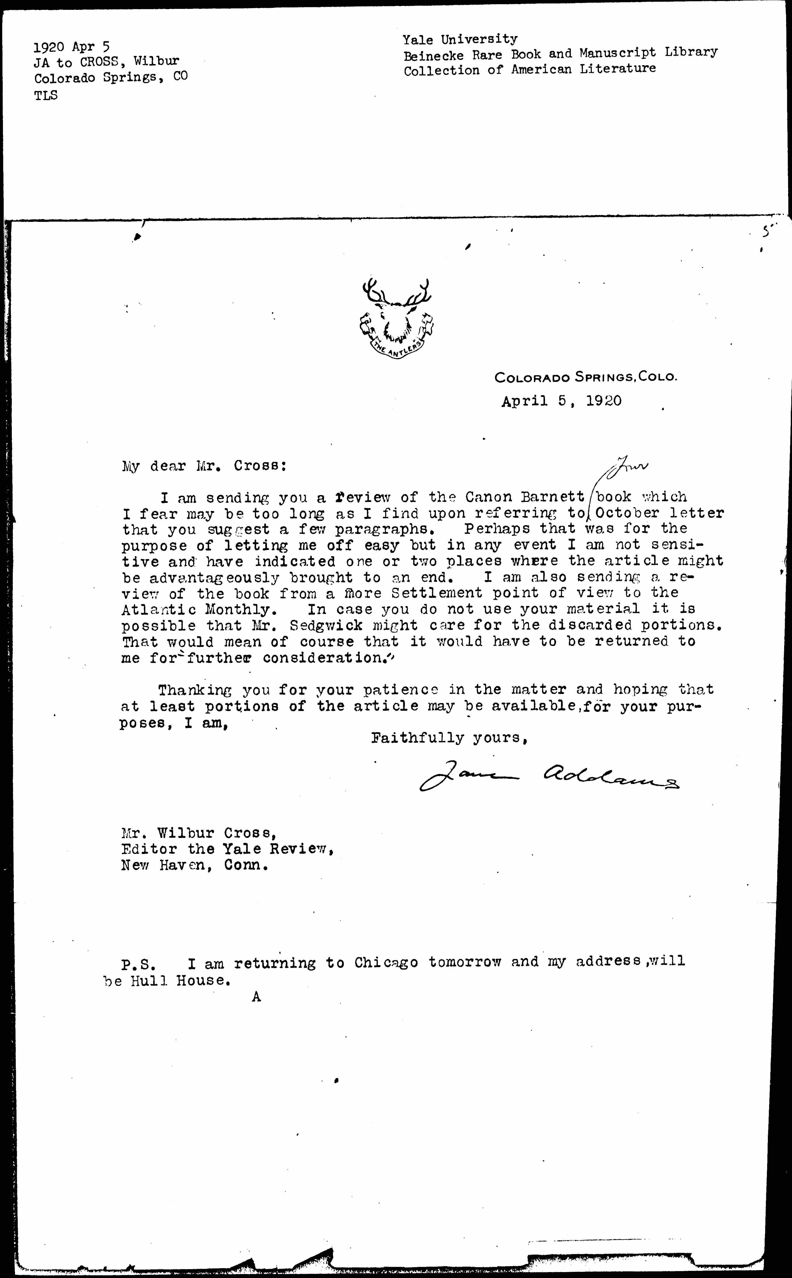 P.S. I am returning to Chicago tomorrow and my address will be Hull House.
