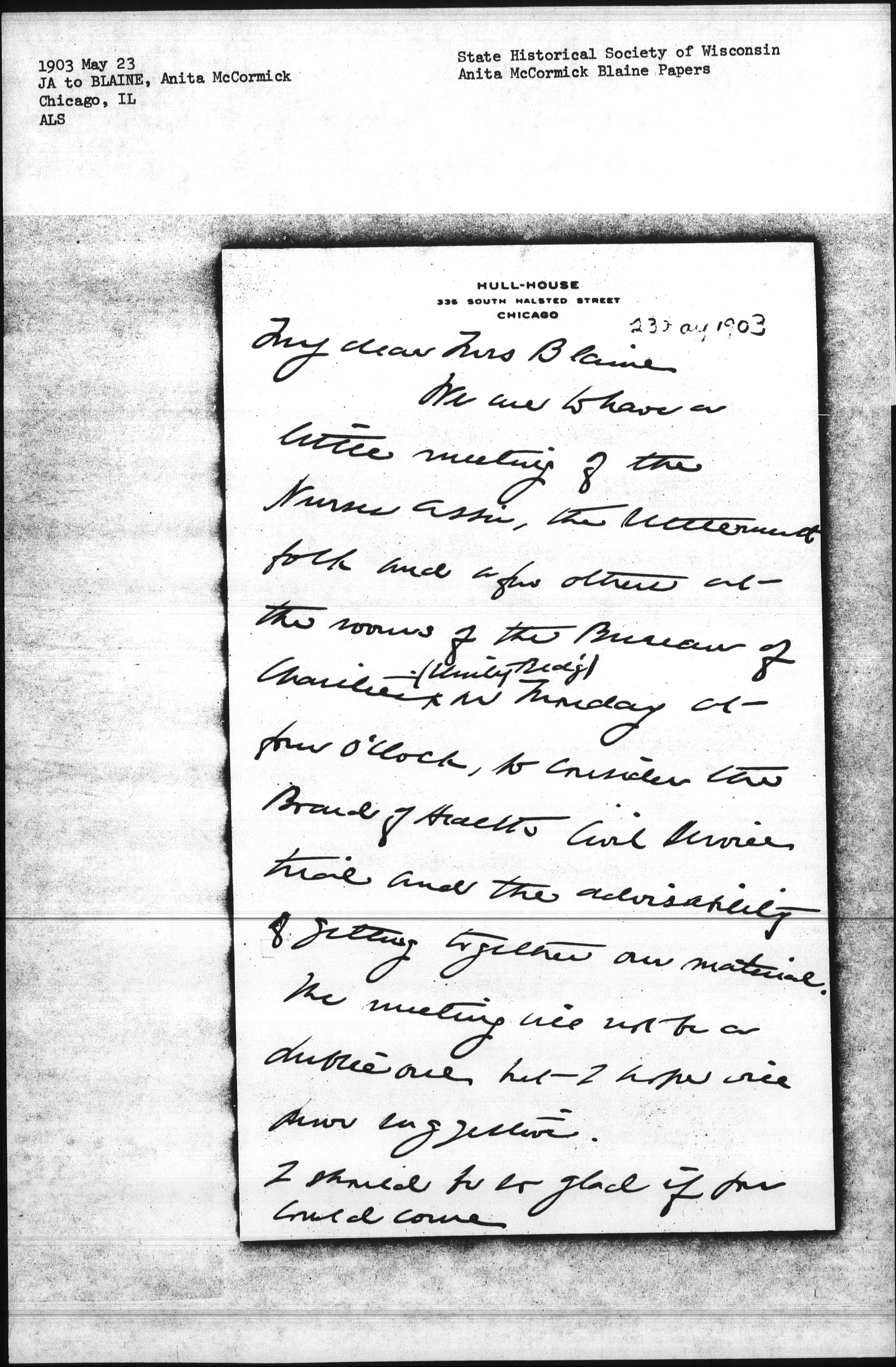 We are to have a little meeting of the Nurses Ass'n, the settlement folk and a few others at the rooms of the Bureau of Charities ↑(Unity Bld'g)↓ on Monday at four o'clock, to consider the Board of Health's Civil Service trial and the advisability of getting together our material.