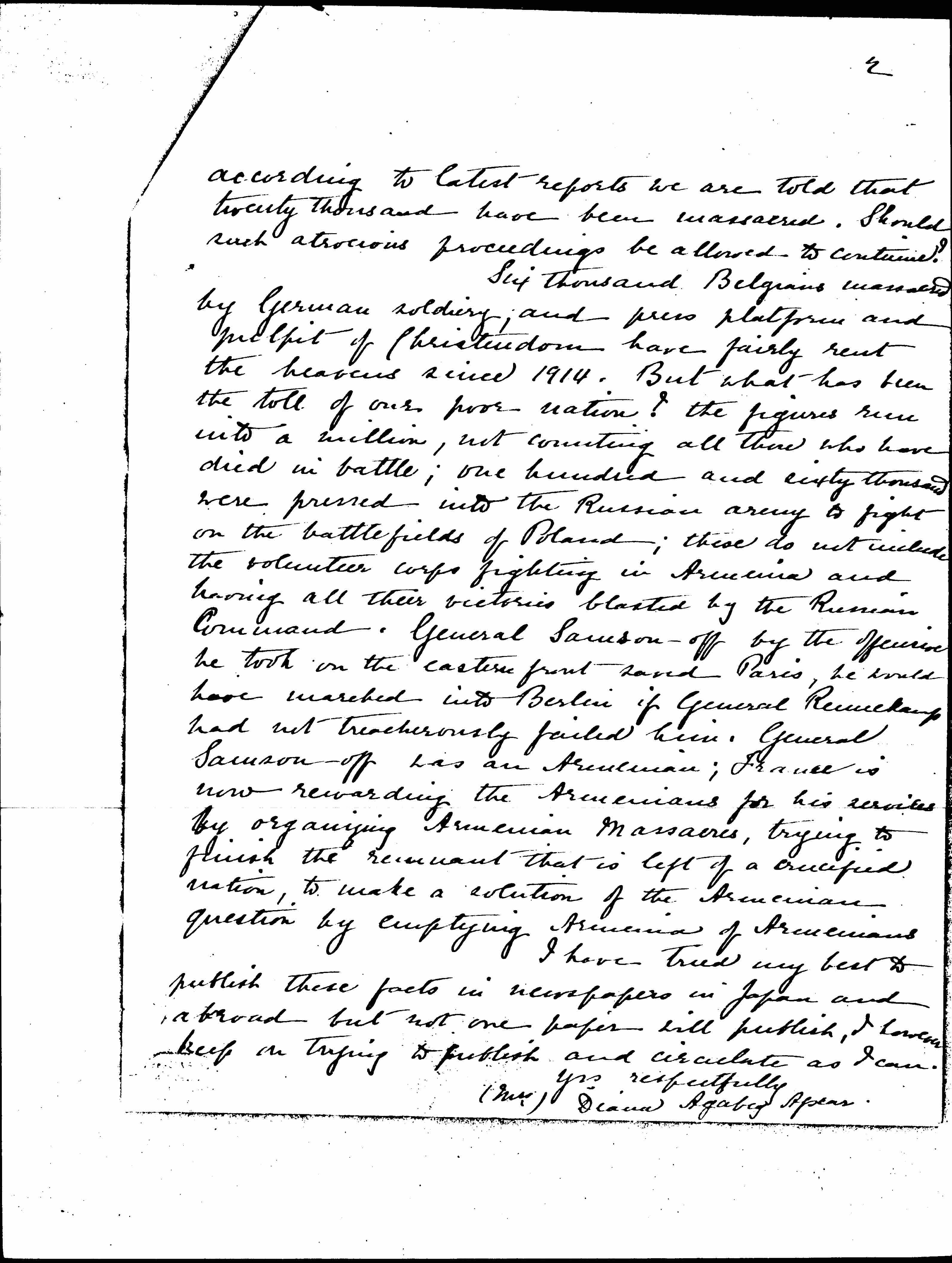 Six thousand Belgians massacred by German soldiery, and press platform and pulpit of Christendom have fairly rent the heavens since 1914. But what has been the toll of our poor nation? The figures run into a million, not counting all those who have died in battle; one hundred and sixty thousand were pressed into the Russian army to fight on the battlefields of Poland; these do not include the volunteer corps fighting in Armenia and having all their victories blasted by the Russian Command. General [Samsonov] by the offensive he took on the eastern front -- saved Paris, he would have marched into Berlin if General [Rennekampf] had not treacherously failed him. General [Samsonov] was an Armenian; France is now rewarding the Armenians for his [service] by organizing Armenian Massacres, trying to finish the remnant that is left of a crucified nation, to make a solution of the Armenian question by emptying Armenia of Armenians.