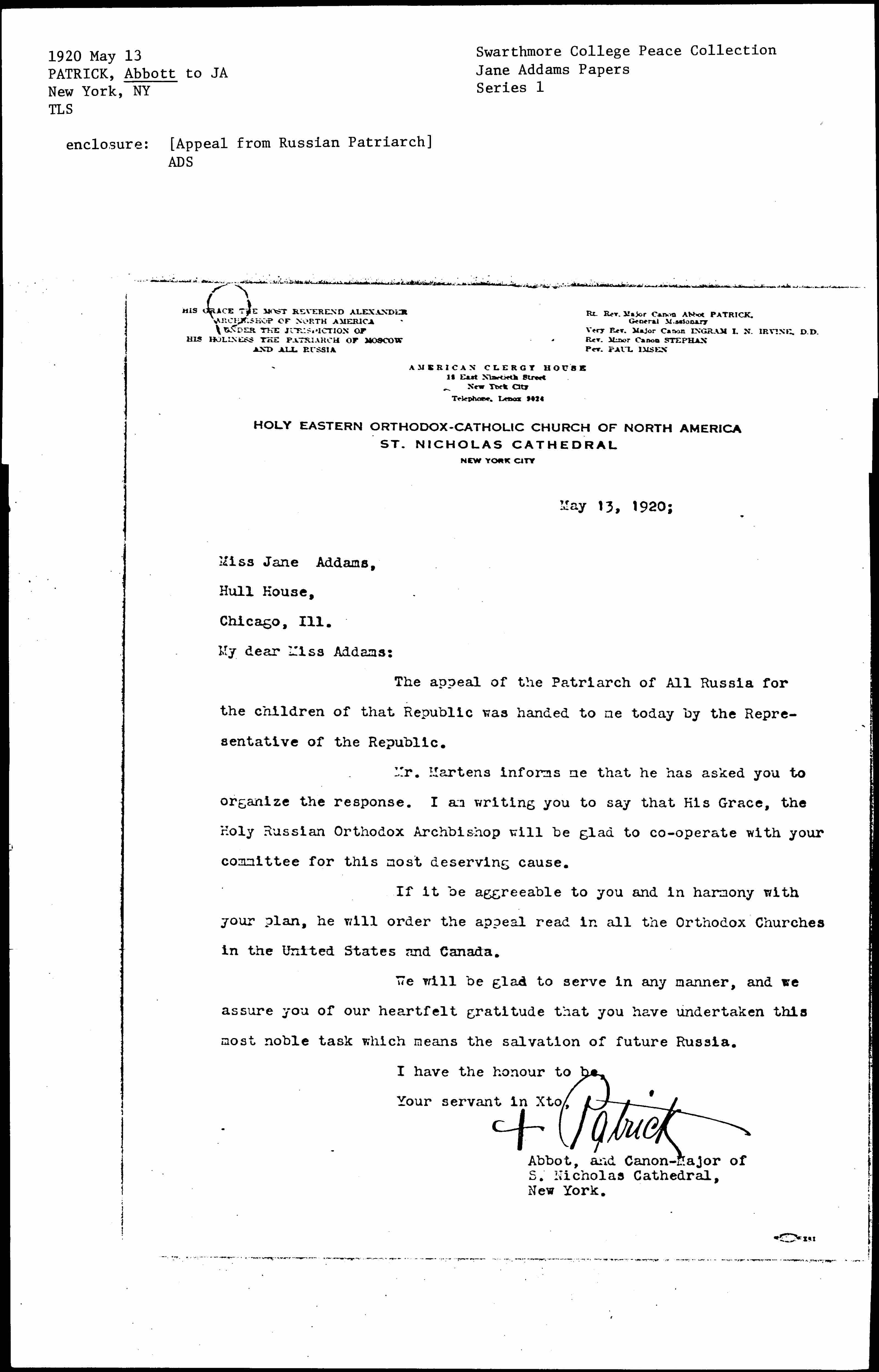 Mr. Martens informs me that he has asked you to organize the response. I am writing you to say that His Grace, the Holy Russian Orthodox Archbishop will be glad to [cooperate] with your committee for this most deserving cause.