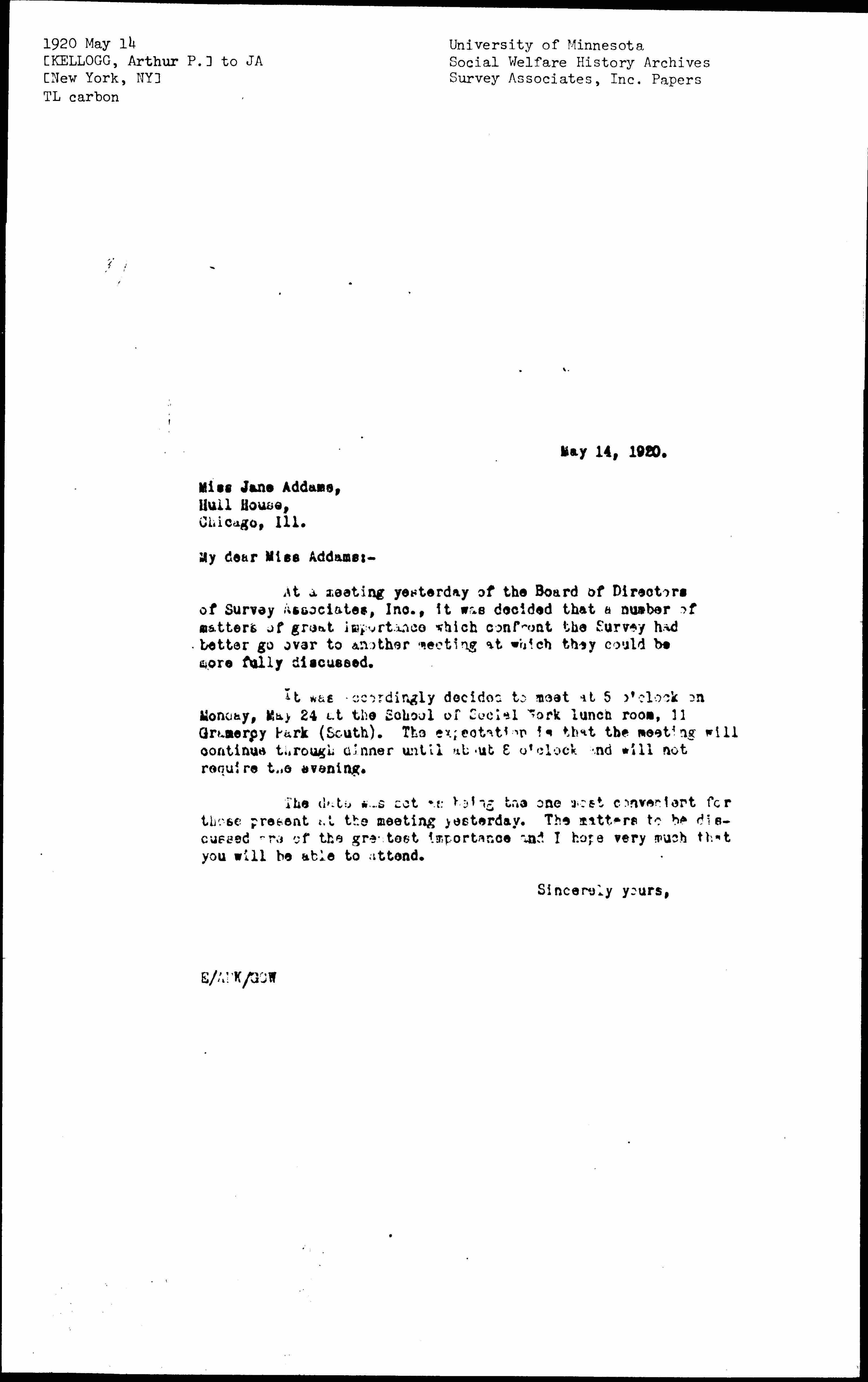 It was accordingly decided to meet at 5 o'clock on Monday, May 24 at the School of Social Work lunch room, 11 Gramercy Park (South). The expectation is that the meeting will continue through dinner until about 8 o'clock and will not require the evening.