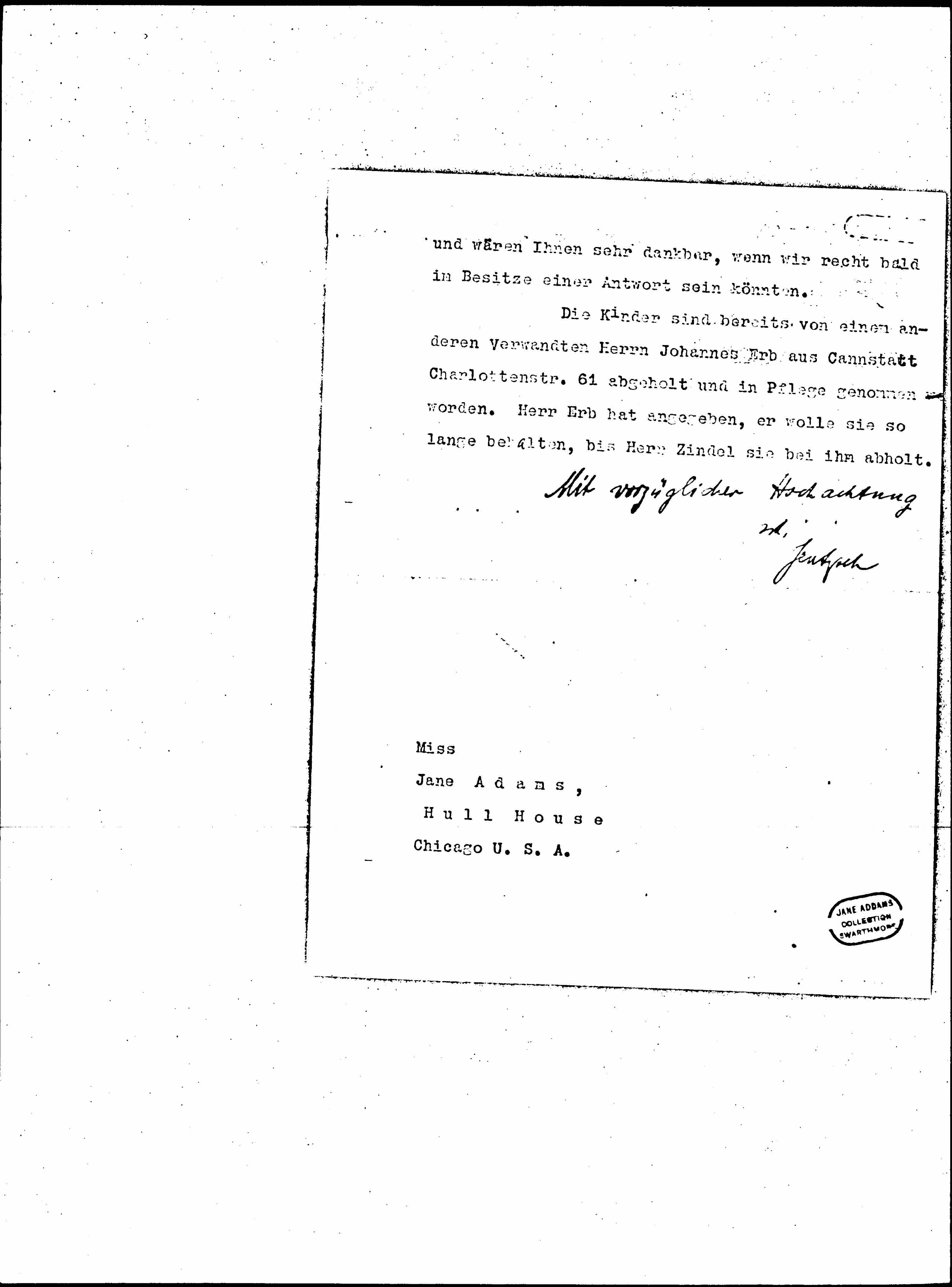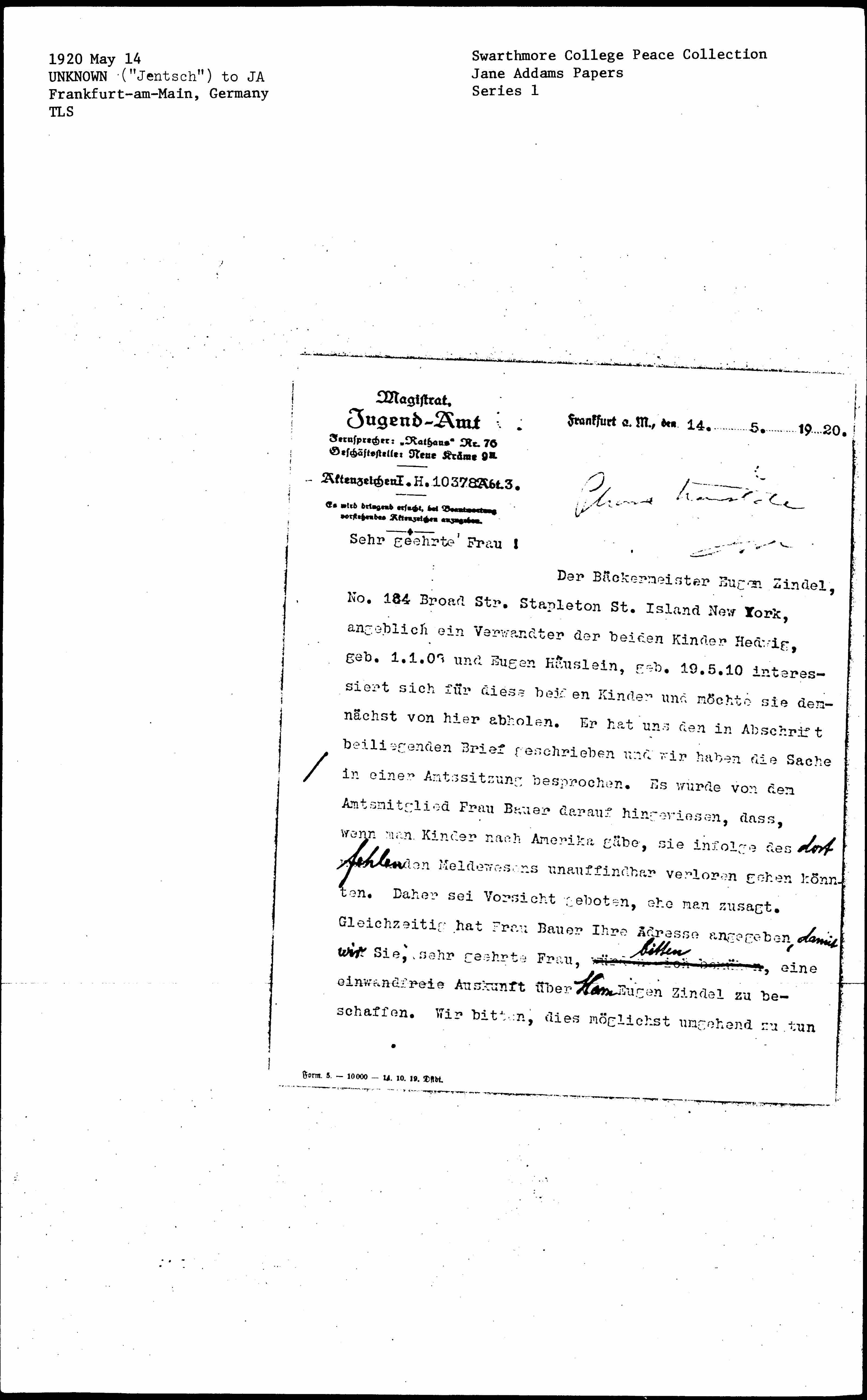The master baker Eugen Zindel, No. 184 Broad Str. Stapleton St. Island New York, allegedly a relative of the two kids Hedwig, born 1.1.[08?] and Eugen Häuslein, born 19.5.10 is interested in these two children and would like to pick them up from here soon. He wrote us the transcript of the enclosed letter and we discussed the matter in an official meeting. It was pointed out by the Commissioner Mrs. Bauer that if children were to be sent to America, they could get lost there because of the lack of registration system. Therefore, caution should be exercised before deciding. At the same time, Ms. Bauer has provided your address so ↓that we↑ can I would refer ↓ask↑ you, dear Ms., to provide impeccable information about ↓Mr.↑ Eugen Zindel. We ask you to do so promptly