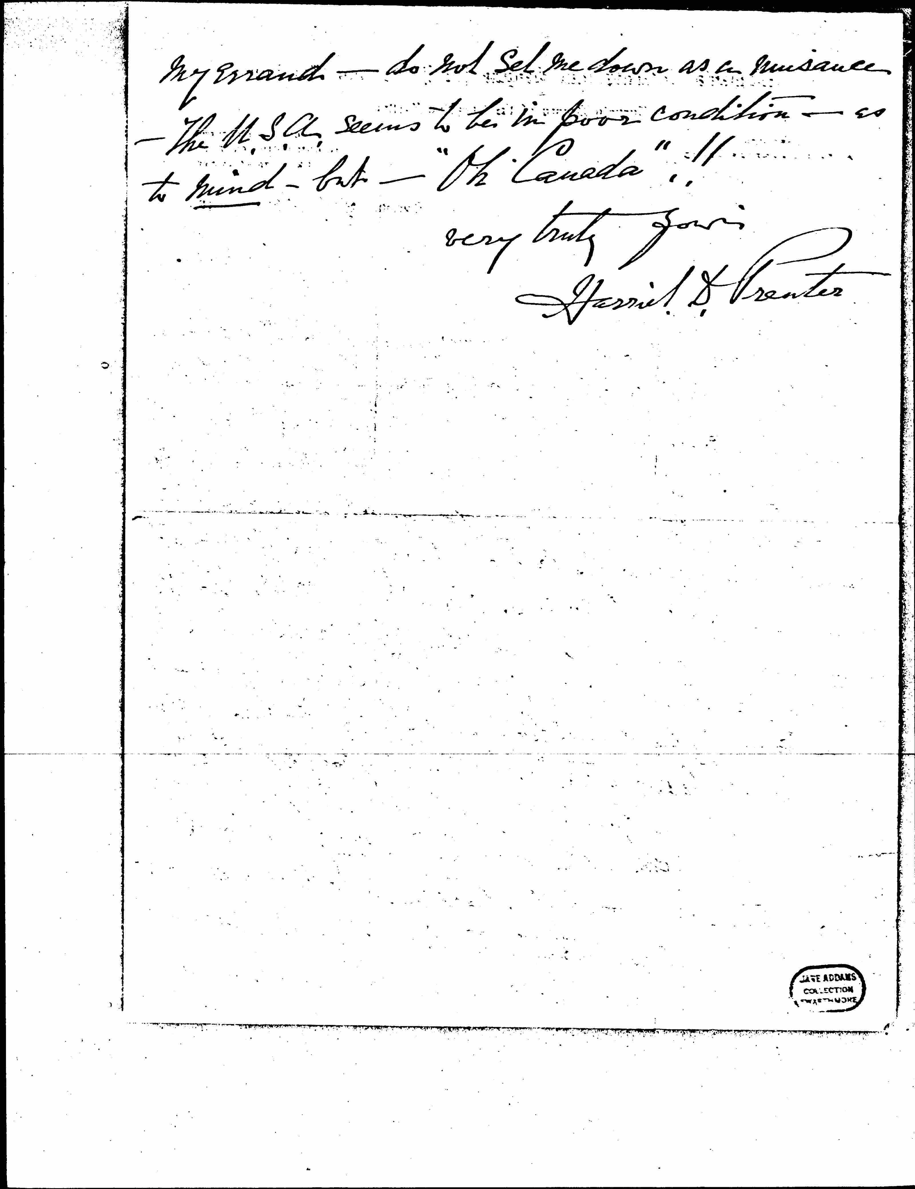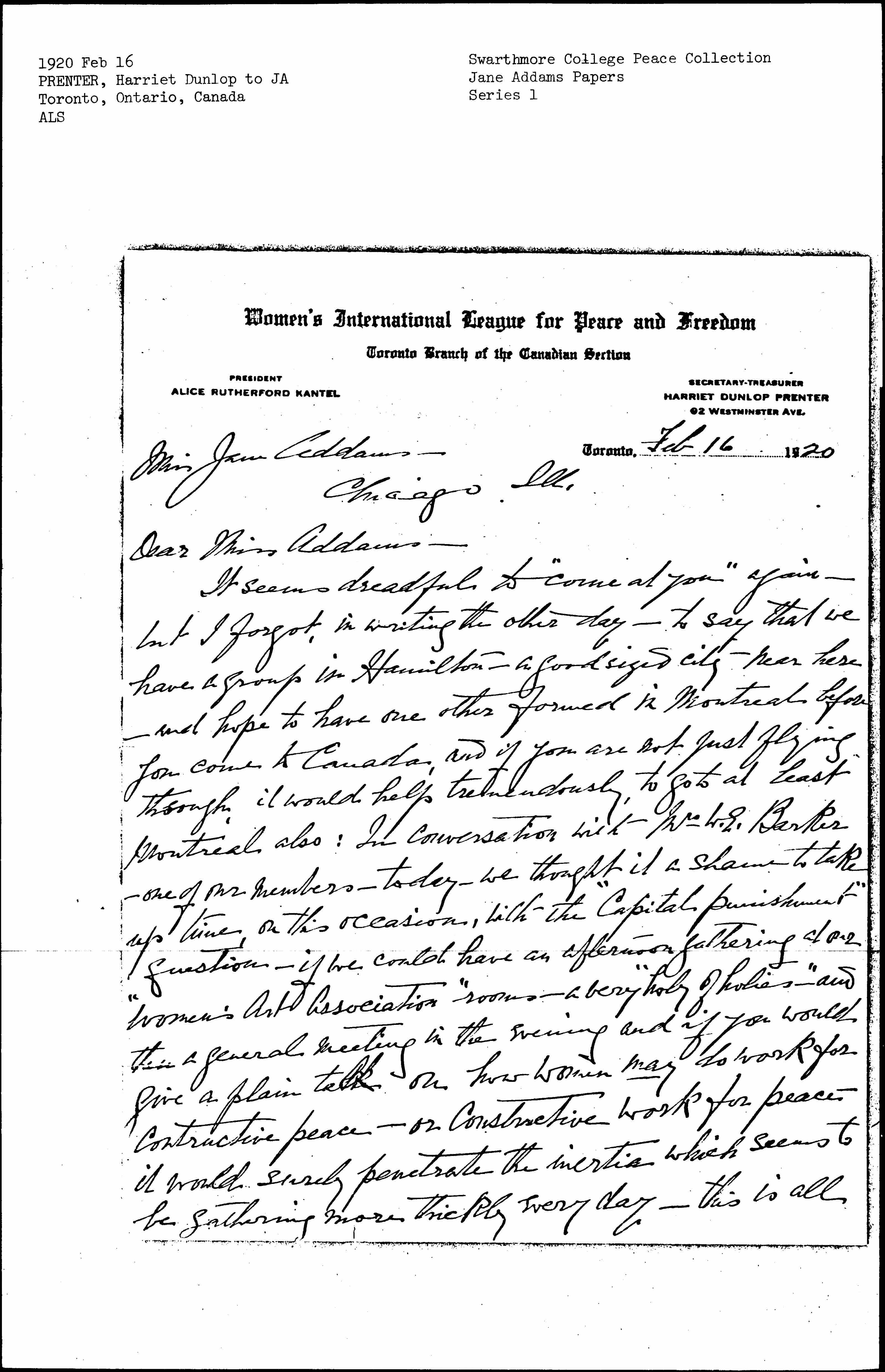 It seems dreadful to "come at you" again -- but I forgot, in writing the other day -- to say that we have a group in Hamilton -- a good sized city near here -- and hope to have one other formed in Montreal before you come to Canada, and if you are not just flying through, it would help tremendously, to go to at least Montreal also: In Conversation with Mrs W. E. Barker -- one of our members -- today -- we thought it a shame to take up time, on this occasion, with the "Capital punishment" question -- if we could have an afternoon gathering at our "Women's Art Association" rooms -- a very "holy of holies" -- and then a general meeting in the evening and if you would give a plain talk on how women may do work for constructive peace -- or constructive work for peace -- it would surely penetrate the inertia which seems to be gathering more thickly every day -- this is all [page 2] my errand -- do not set me down as a nuisance. The U.S.A. seems to be in poor condition -- as to mind -- but -- "Oh Canada"!!