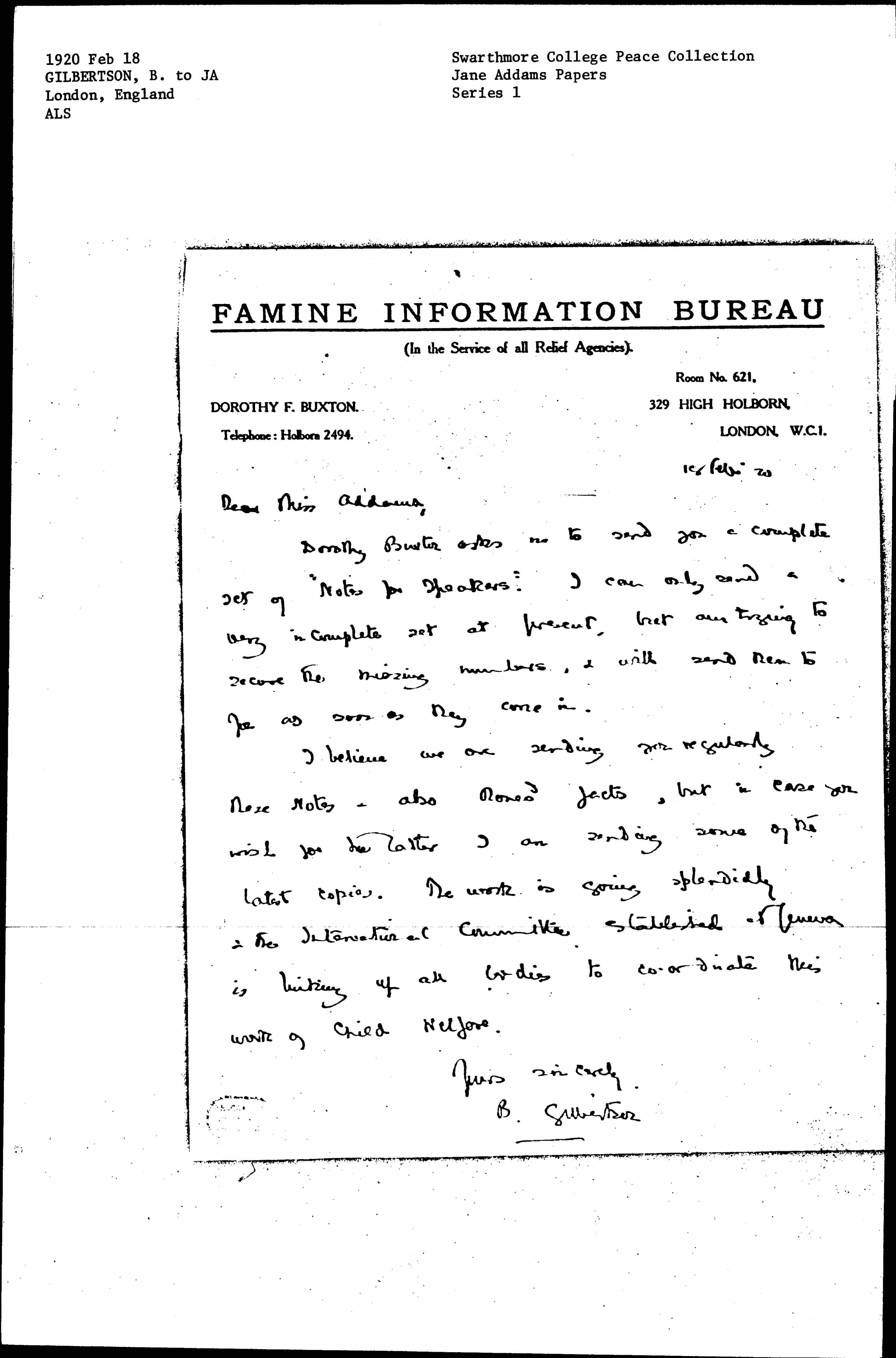 I believe we are sending you regularly these notes -- also [illegible] facts, but in case you wish for the latter I am sending some of the latest copies. The work is going splendidly & the International Committee established at Geneva is linking up all bodies to coordinate this work of child welfare.