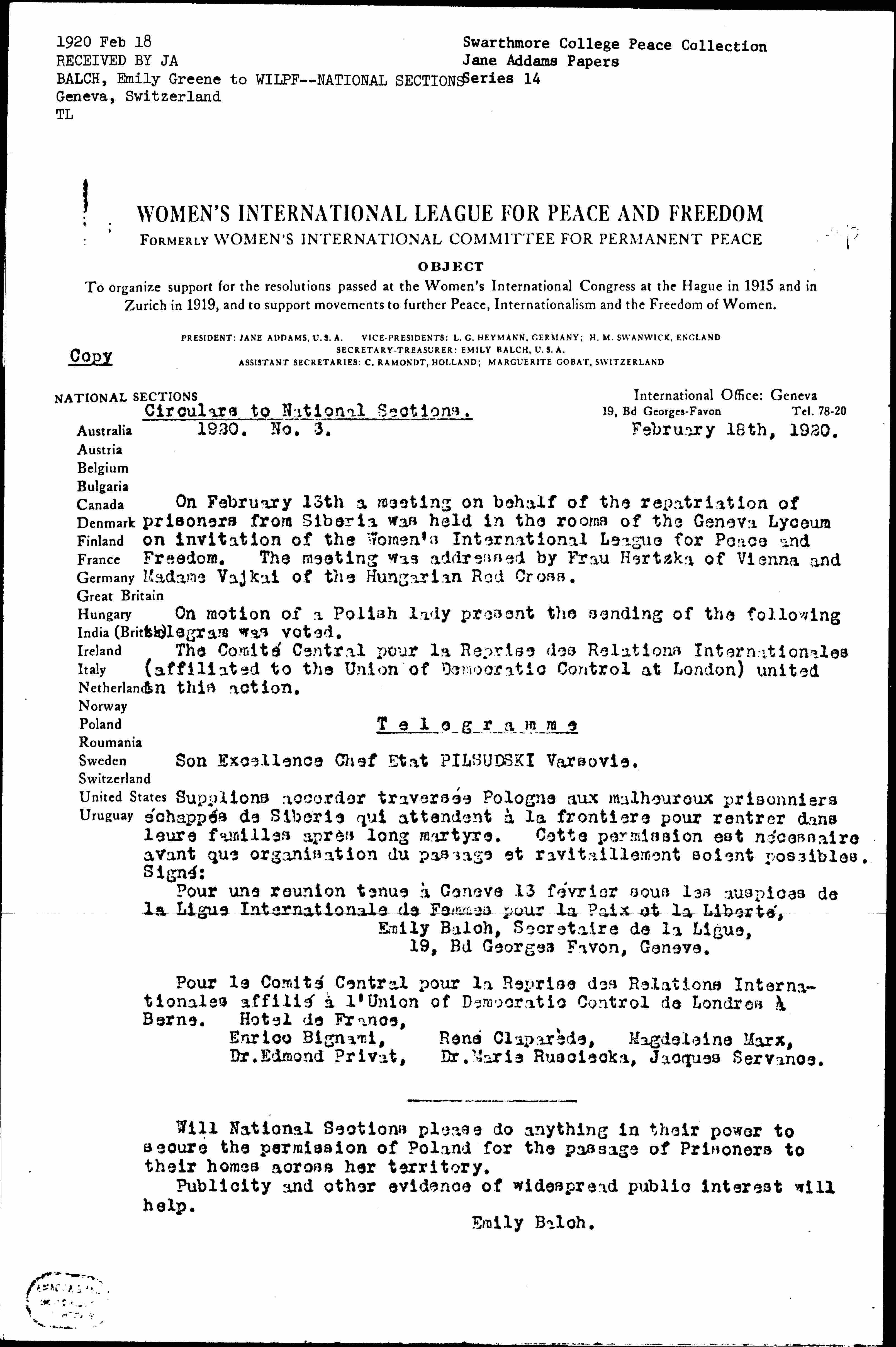 For a meeting held in Geneva February 13 under the auspices of the International Women's League for Peace and Freedom, Emily Balch, Secretary of the League, 19, Bd Georges Favon, Geneva.