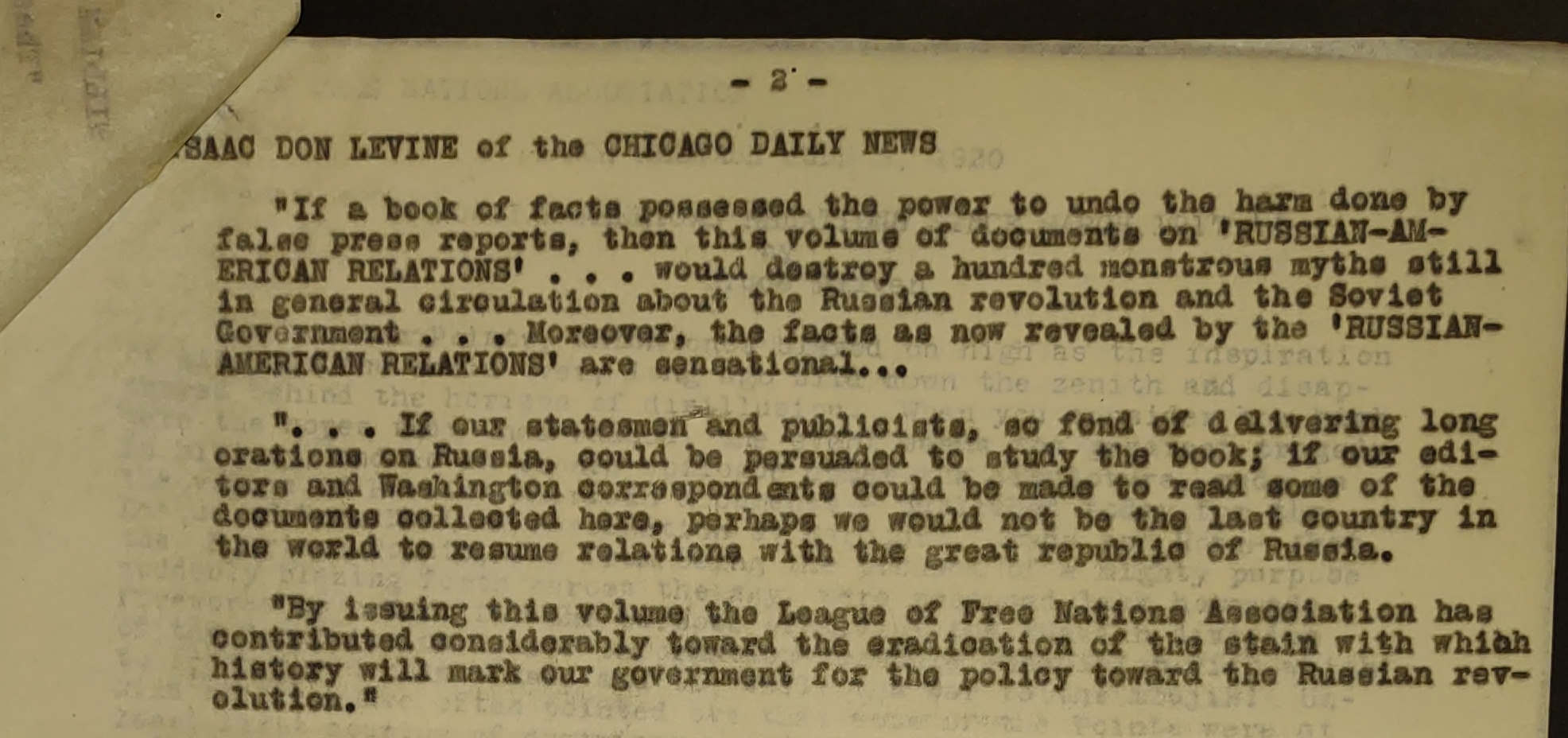 "If a book of facts possessed the power to undo the harm done by false press reports, then this volume of documents on 'RUSSIAN-AMERICAN RELATIONS' … would destroy a hundred monstrous myths still in general circulation about the Russian revolution and the Soviet Government … Moreover, the facts as now revealed by the 'RUSSIAN-AMERICAN RELATIONS' are sensational …