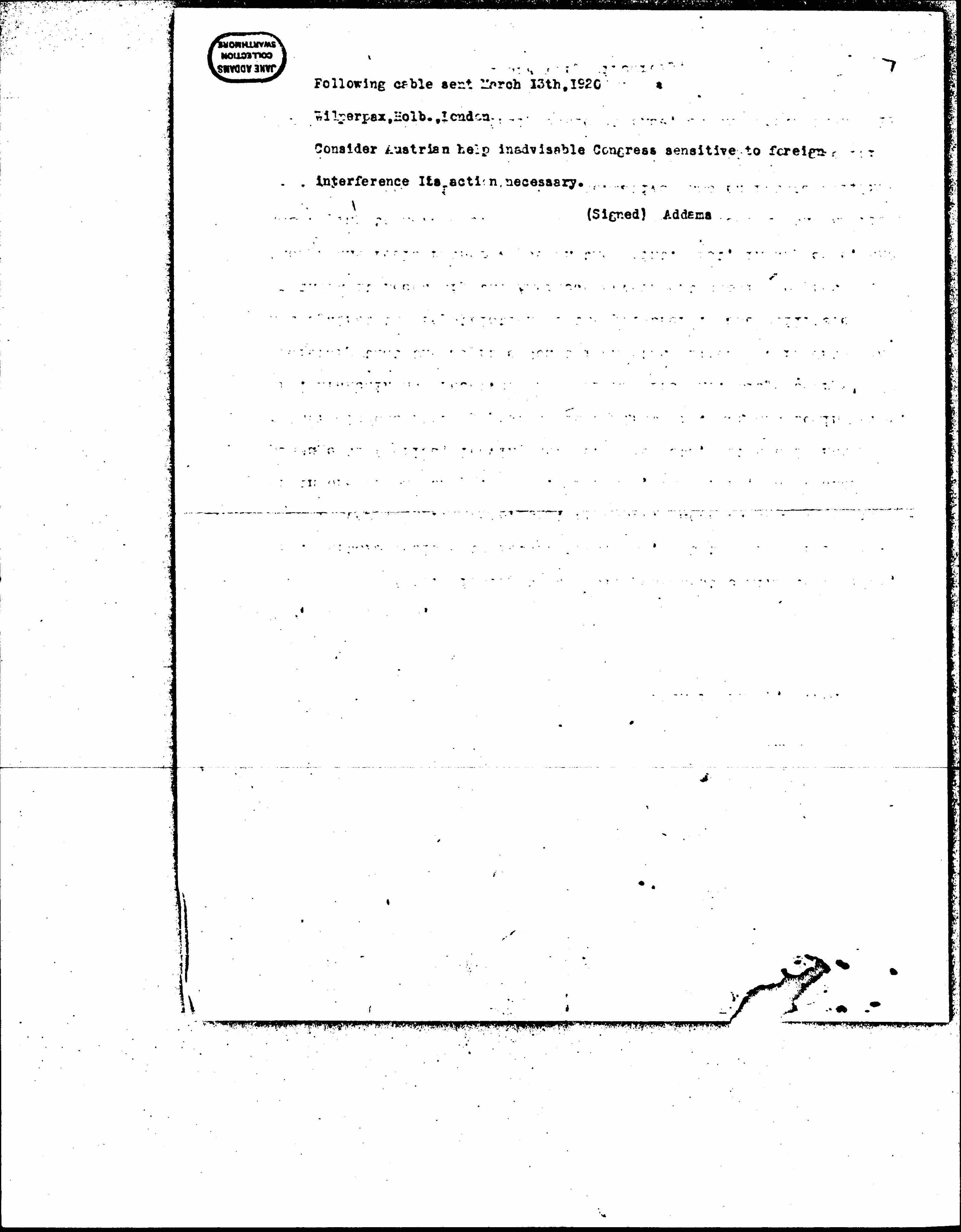 Following cable sent March 13th, 1920