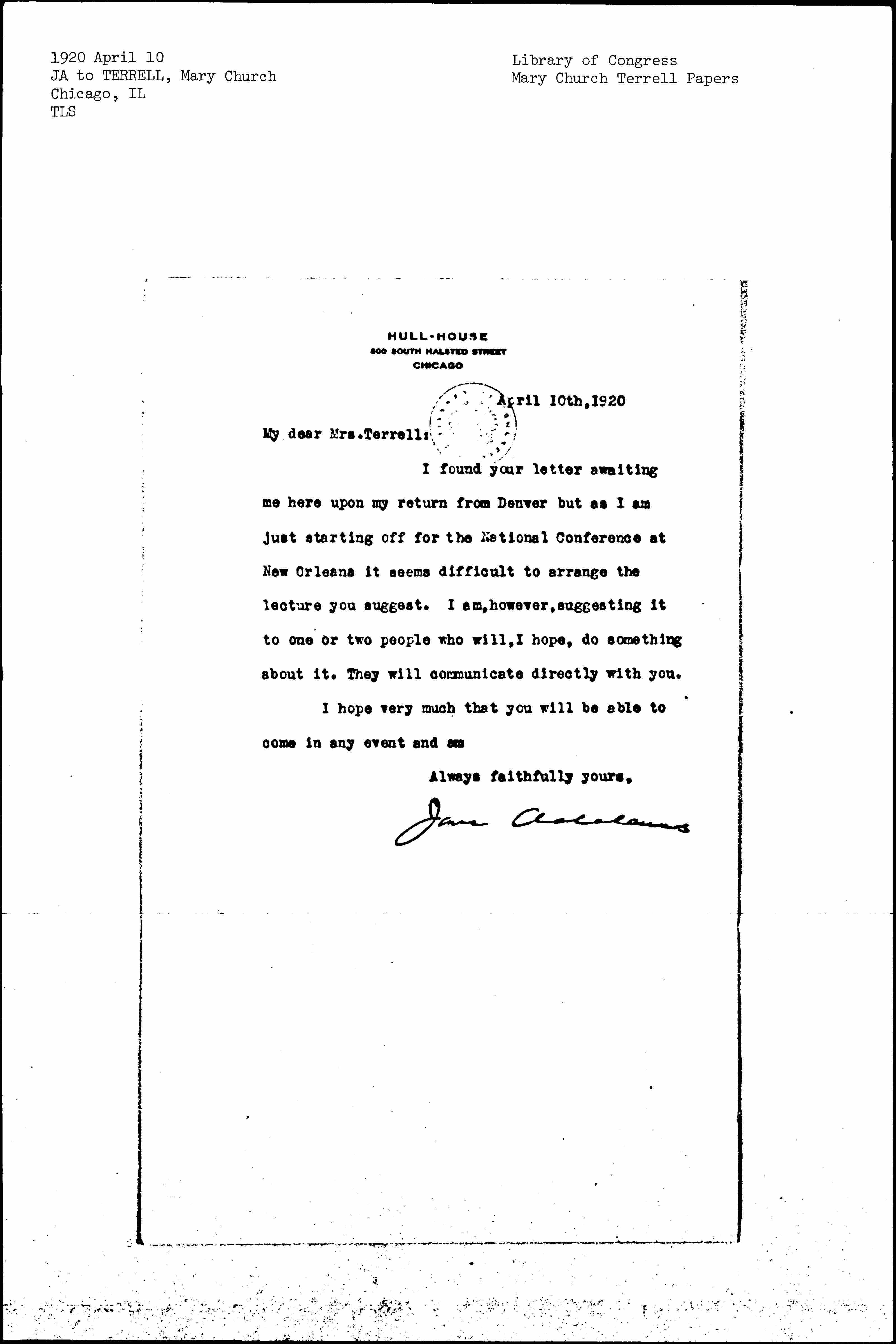 I found your letter awaiting me here upon my return from Denver but as I am just starting off for the National Conference at New Orleans it seems difficult to arrange the lecture you suggest. I am, however, suggesting it to one or two people who will, I hope, do something about it. They will communicate directly with you.