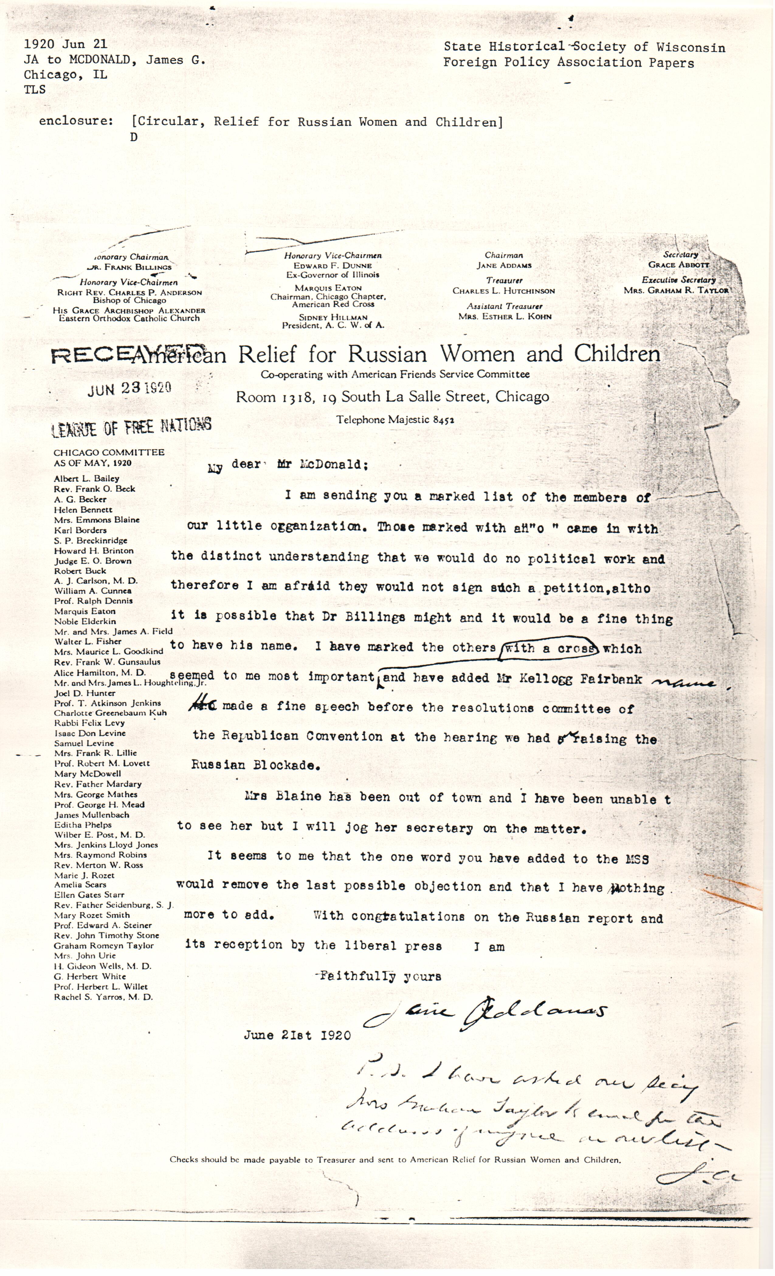 I am sending you a marked list of the members of our little organization. Those marked with an "o" came in with the distinct understanding that we would do no political work and therefore I am afraid they would not sign such a petition, [although] it is possible that Dr Billings might and it would be a fine thing to have his name. I have marked the others which seemed to me most important with a cross and have added Mr Kellogg Fairbank ↑name.↓ who He made a fine speech before the resolutions committee of the Republican Convention at the hearing we had ↑on↓ raising the Russian Blockade.