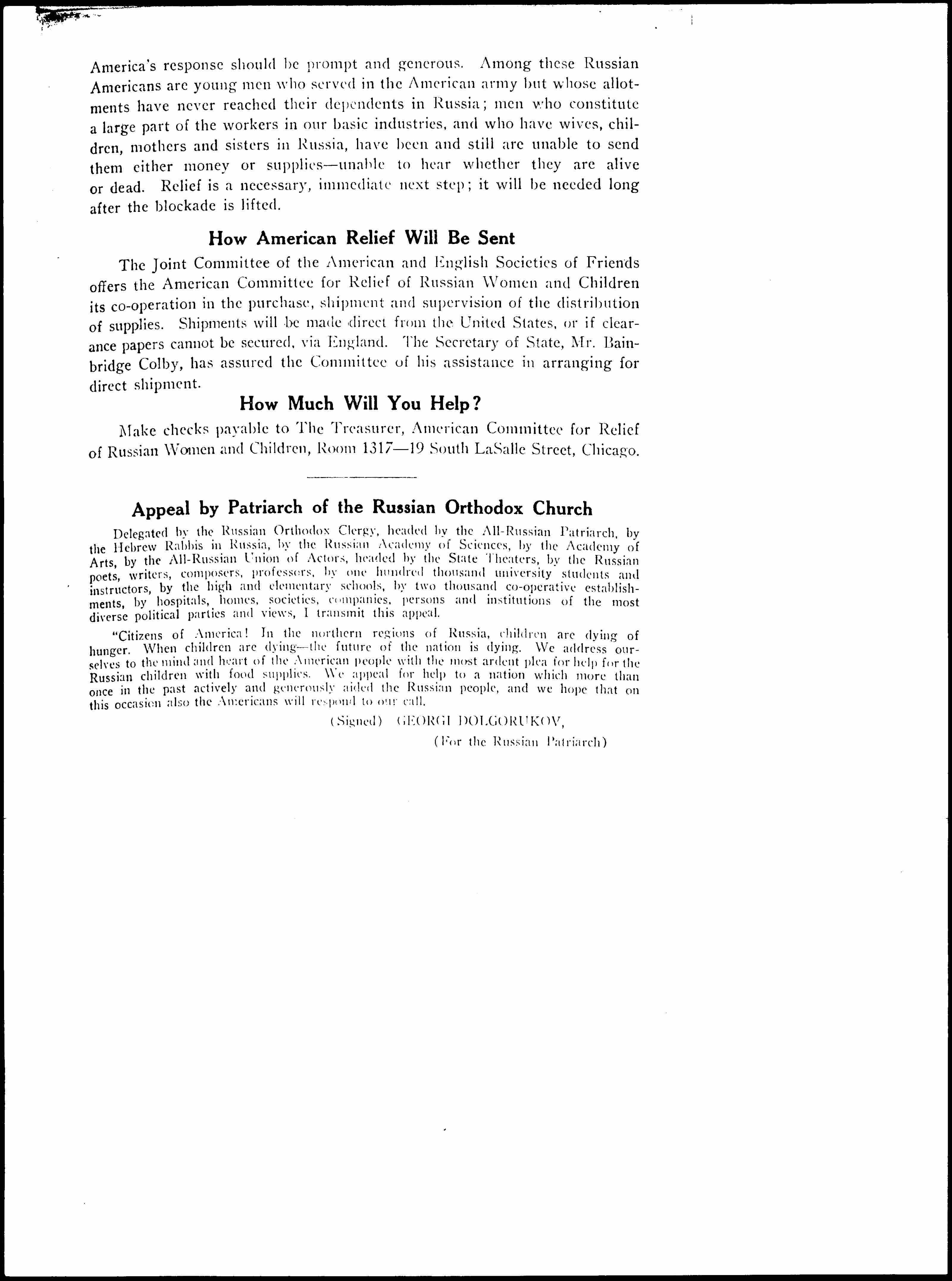 "Citizens of America! In the northern regions of Russia, children are dying of hunger. When children are dying -- the future of the nation is dying. We address ourselves to the mind and heart of the American people with the most ardent plea for help for the Russian children with food supplies. We appeal for help to a nation which more than once in the past actively and generously aided the Russian people, and we hope that on this occasion also the Americans will respond to our call."