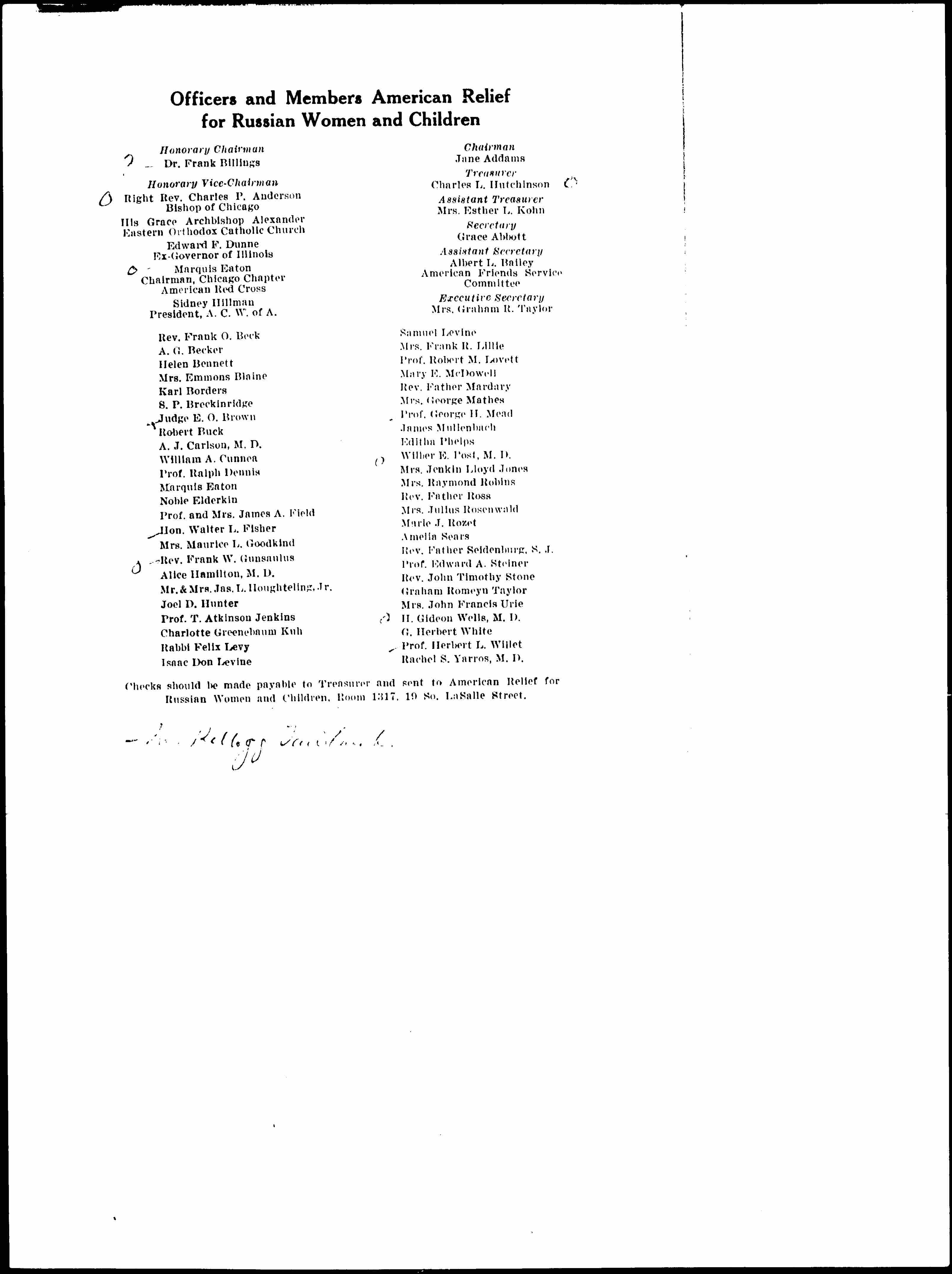 Checks should be made payable to Treasurer and sent to American Relief for Russian Women and Children. Room 1317, 19 So. La Salle Street.