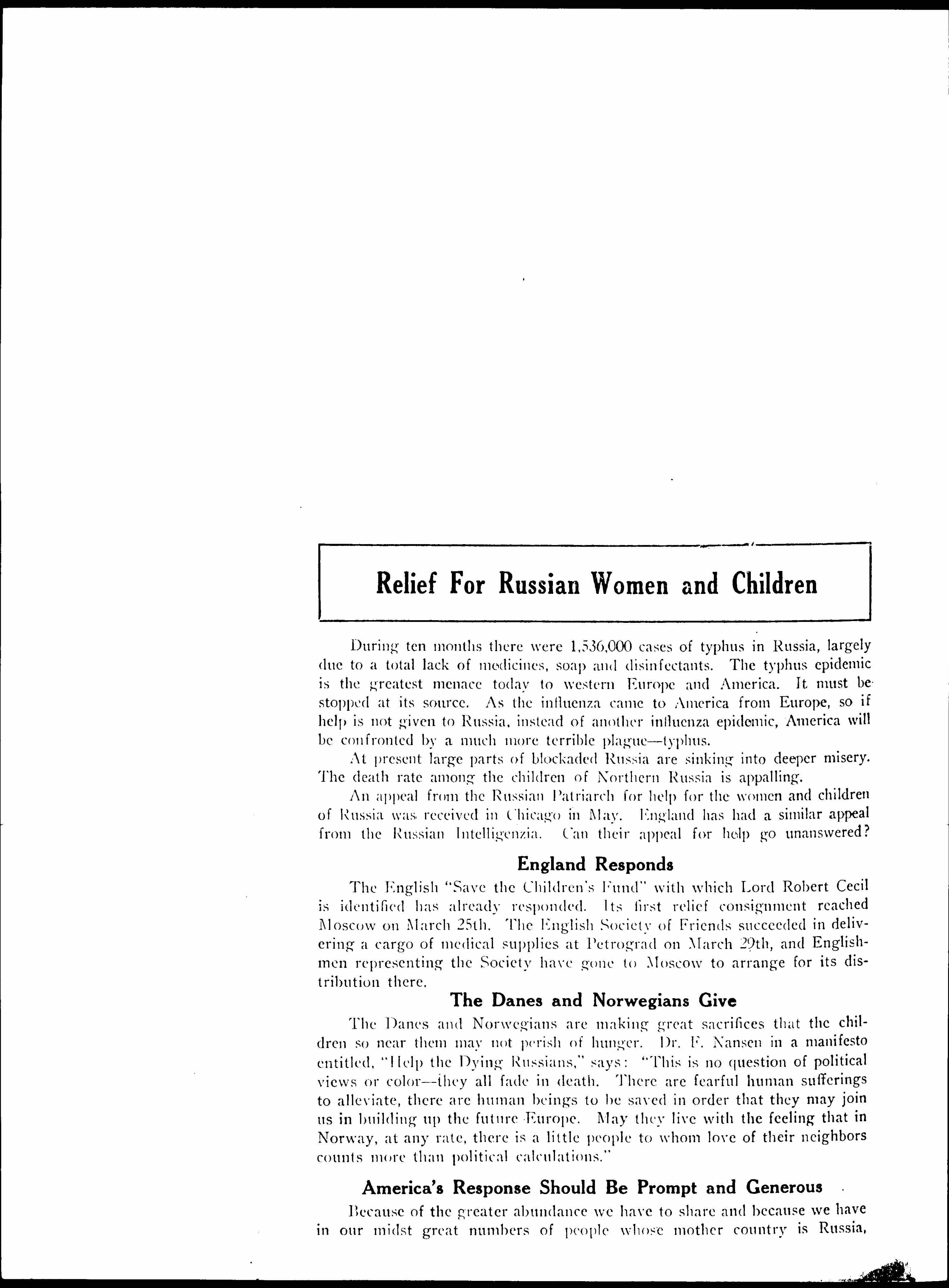 At present large parts of blockaded Russia are sinking into deeper misery. The death rate among the children of Northern Russia is appalling. An appeal from the Russian Patriarch for help for the women and children of Russia was received in Chicago in May. England has had a similar appeal from the Russian [Intelligentsia]. Can their appeal for help go unanswered?