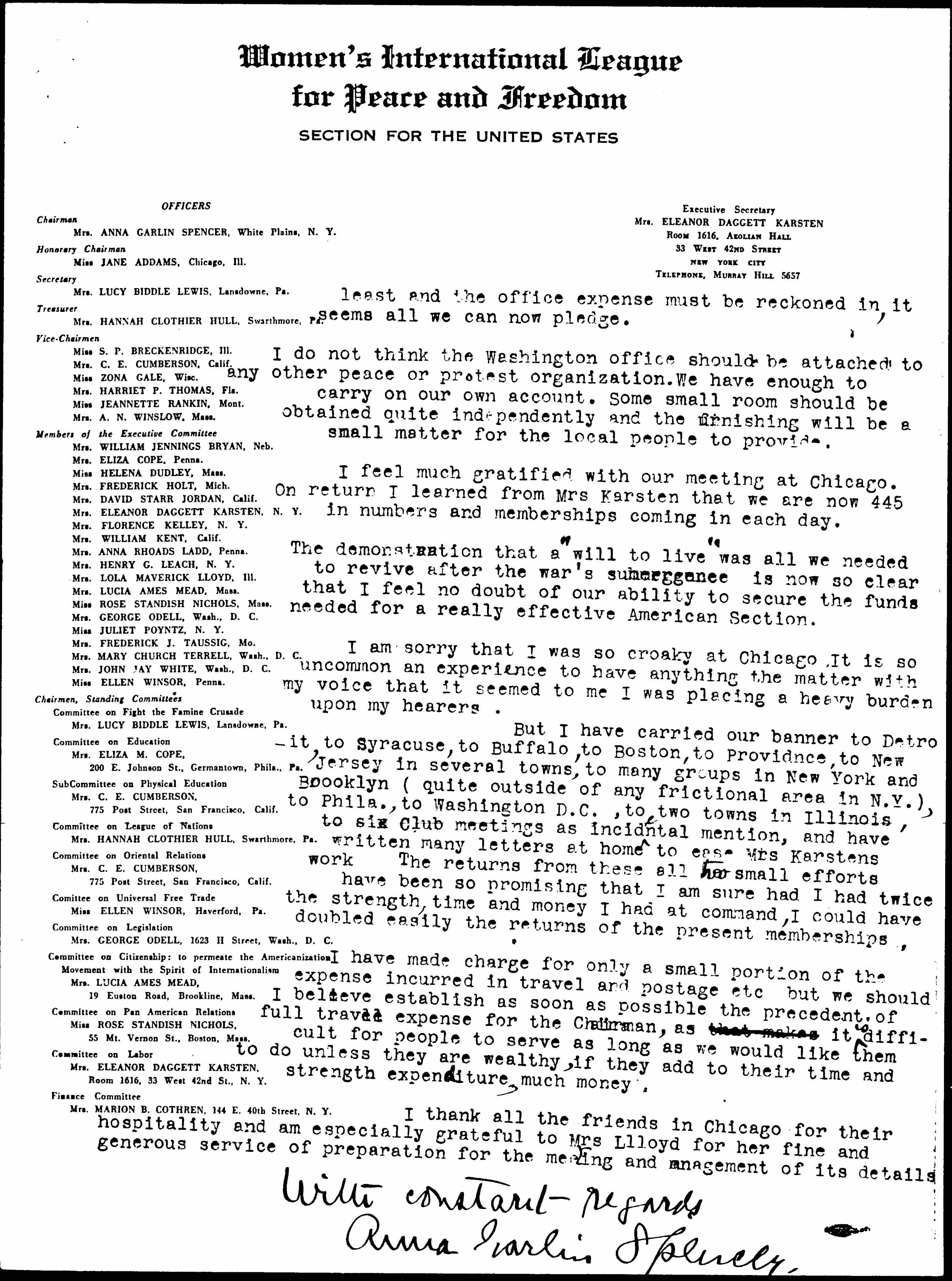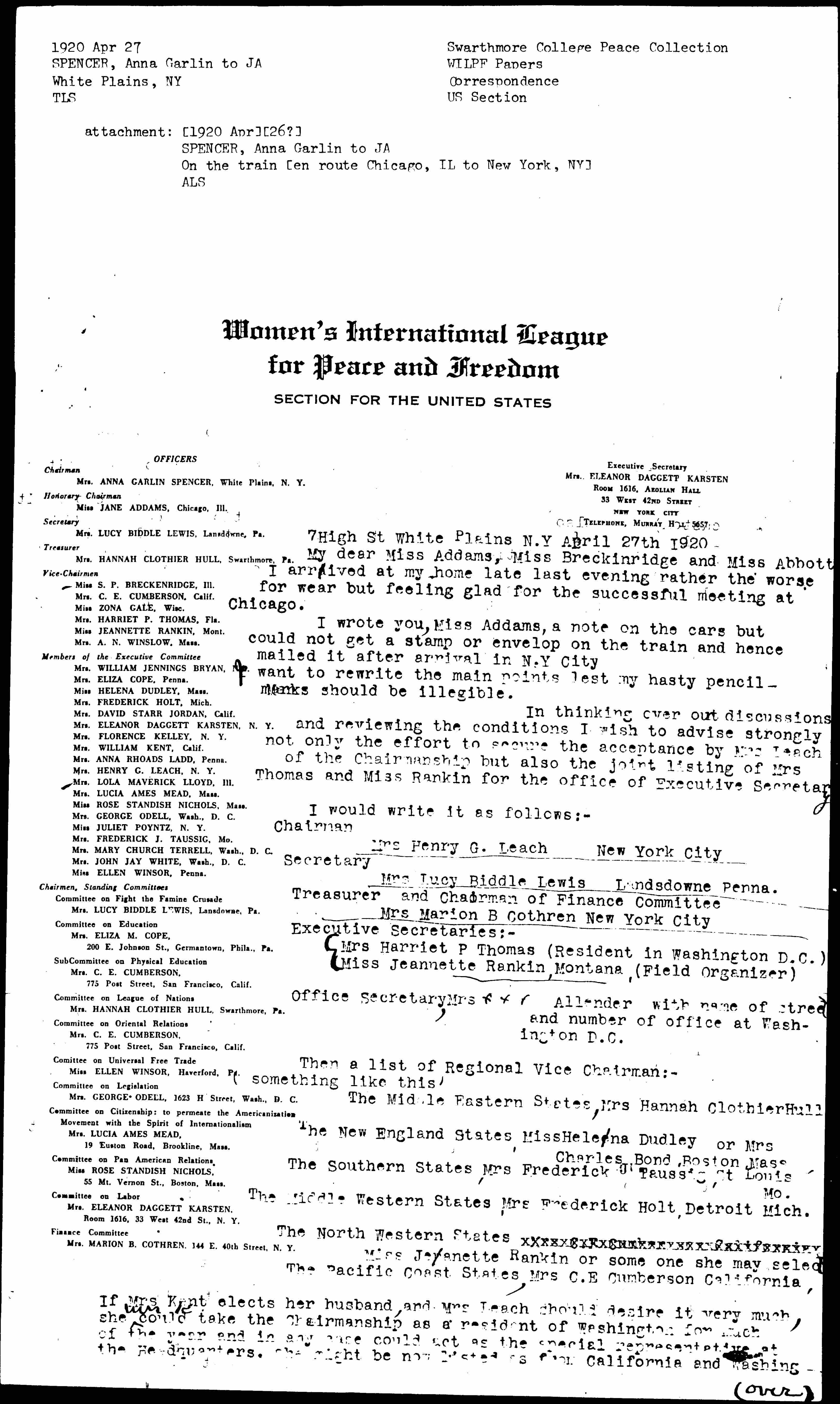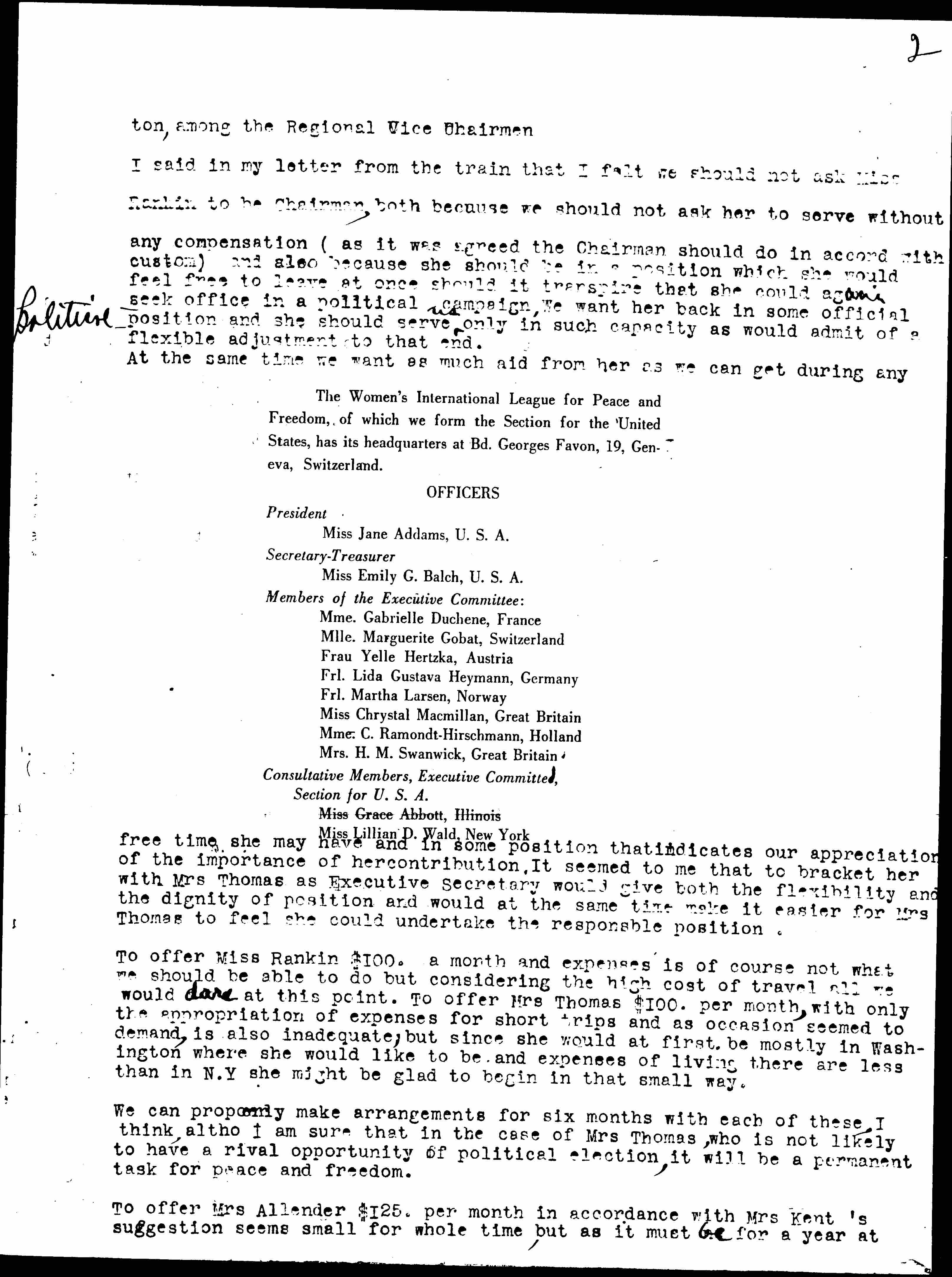 I said in my letter from the train that I felt we should not ask Miss Rankin to be Chairman, both because we should not ask her to serve without any compensation (as it was agreed the Chairman should do in accord with custom) and also because she should be in a position which she would feel free to leave at once should it transpire that she could again seek office in a political campaign. We want her back in some official ↑[political]↓ position and she should serve ↑us↓ only in such capacity as would admit of a flexible adjustment to that end. At the same time we want as much aid from her as we can get during any free time she may have and in some position that indicates our appreciation of the importance of her contribution. It seemed to me that to bracket her with Mrs Thomas as Executive Secretary would give both the flexibility and the dignity of position and would at the same time make it easier for Mrs Thomas to feel she could undertake the responsible position.