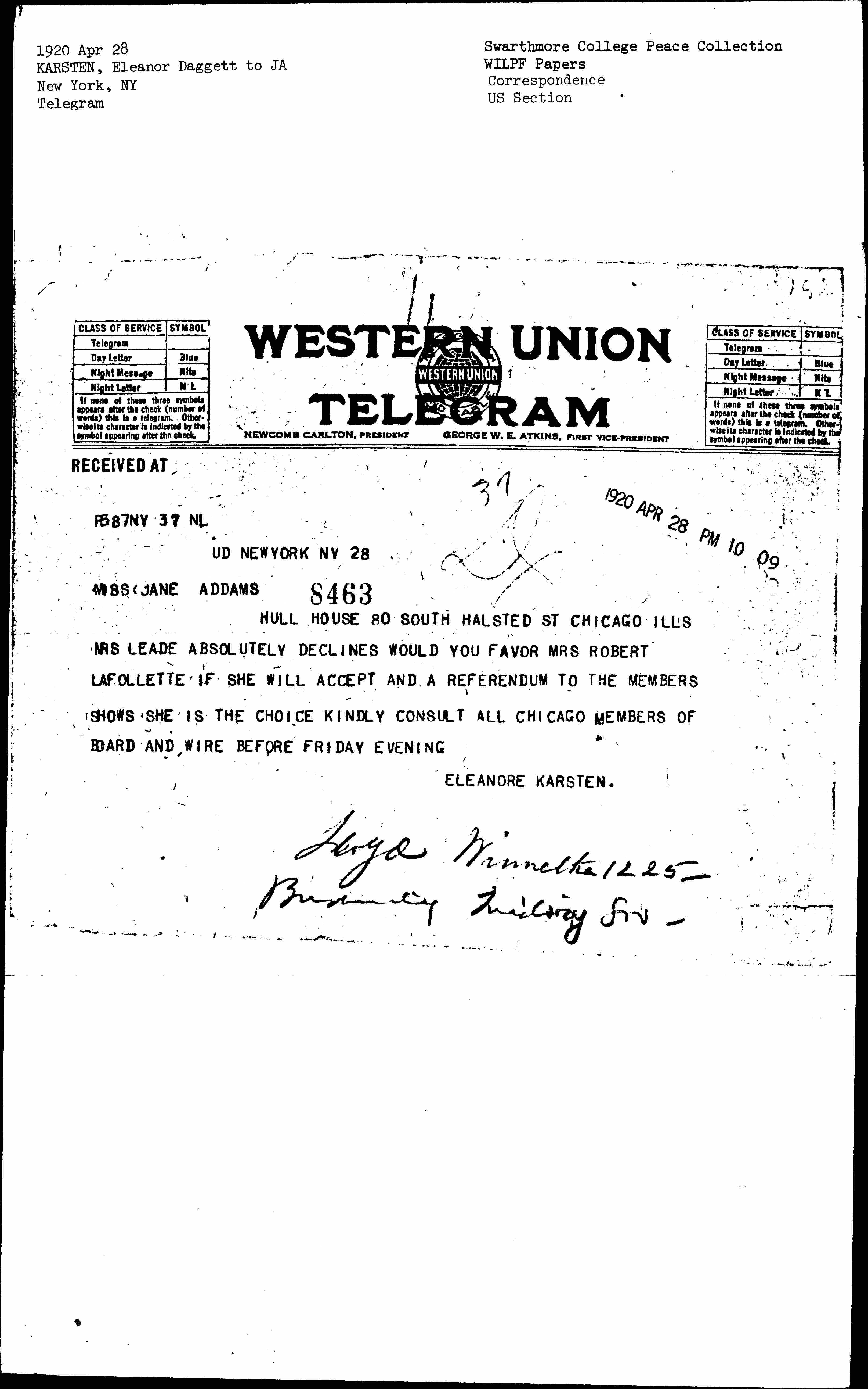 MRS [LEACH] ABSOLUTELY DECLINES WOULD YOU FAVOR MRS ROBERT LA FOLLETTE IF SHE WILL ACCEPT AND A REFERENDUM TO THE MEMBERS SHOWS SHE IS THE CHOICE KINDLY CONSULT ALL CHICAGO MEMBERS OF BOARD AND WIRE BEFORE FRIDAY EVENING