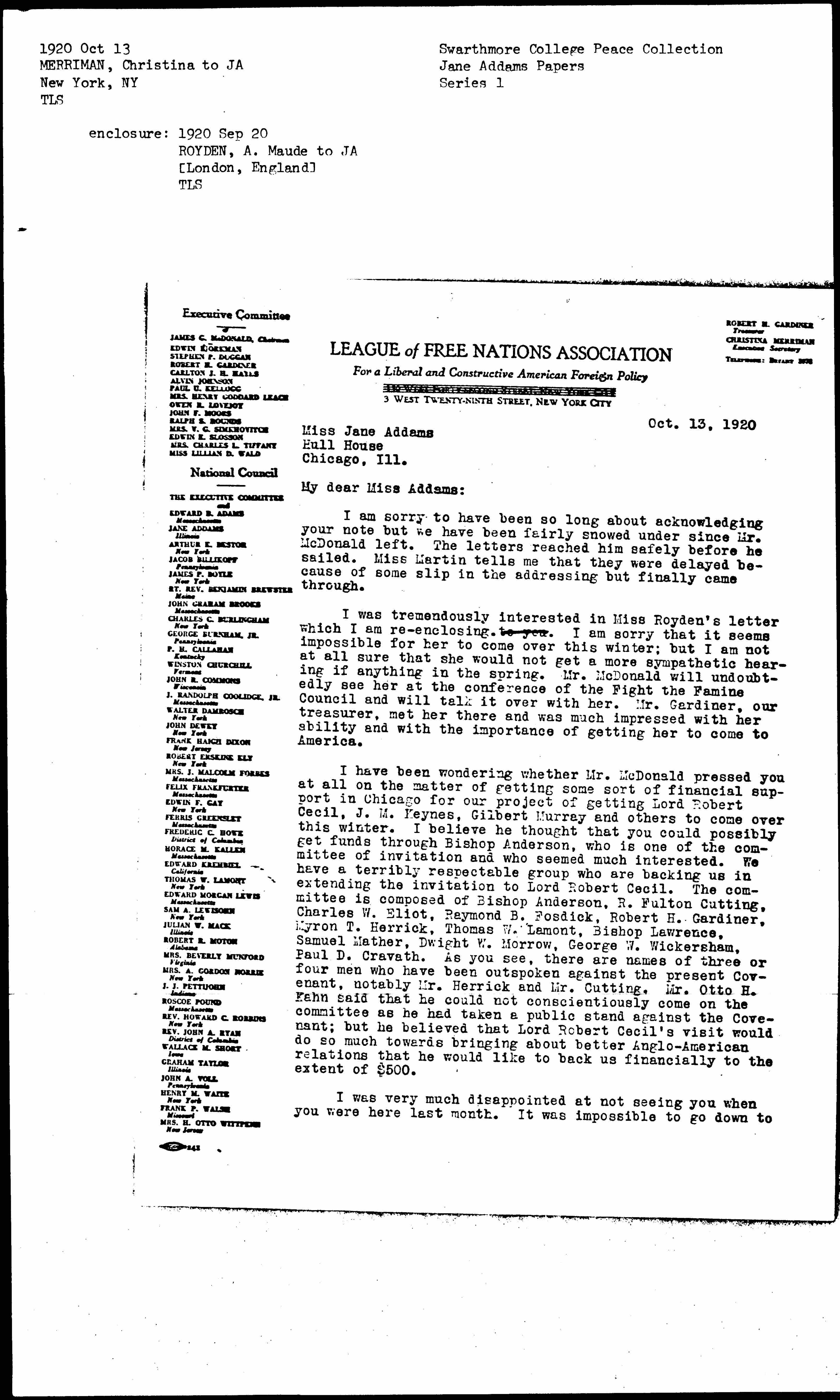 I have been wondering whether Mr. McDonald pressed you at all on the matter of getting some sort of financial support in Chicago for our project of getting Lord Robert Cecil, J. M. Keynes, Gilbert Murray and others to come over this winter. I believe he thought that you could possibly get funds through Bishop Anderson, who is one of the committee of invitation and who seemed much interested. We have a terribly respectable group who are backing us in extending the invitation to Lord Robert Cecil. The committee is composed of Bishop Anderson, R. Fulton Cutting, Charles W. Eliot, Raymond B. Fosdick, Robert H. Gardiner, Myron T. Herrick, Thomas W. Lamont, Bishop Lawrence, Samuel Mather, Dwight W. Morrow, George W. Wickersham, Paul D. Cravath. As you see, there are names of three or four men who have been outspoken against the present Covenant, notably Mr. Herrick and Mr. Cutting. Mr. Otto H. Kahn said that he could not conscientiously come on the committee as he had taken a public stand against the Covenant; but he believed that Lord Robert Cecil's visit would do so much towards bringing about better Anglo-American relations that he would like to back us financially to the extent of $500.