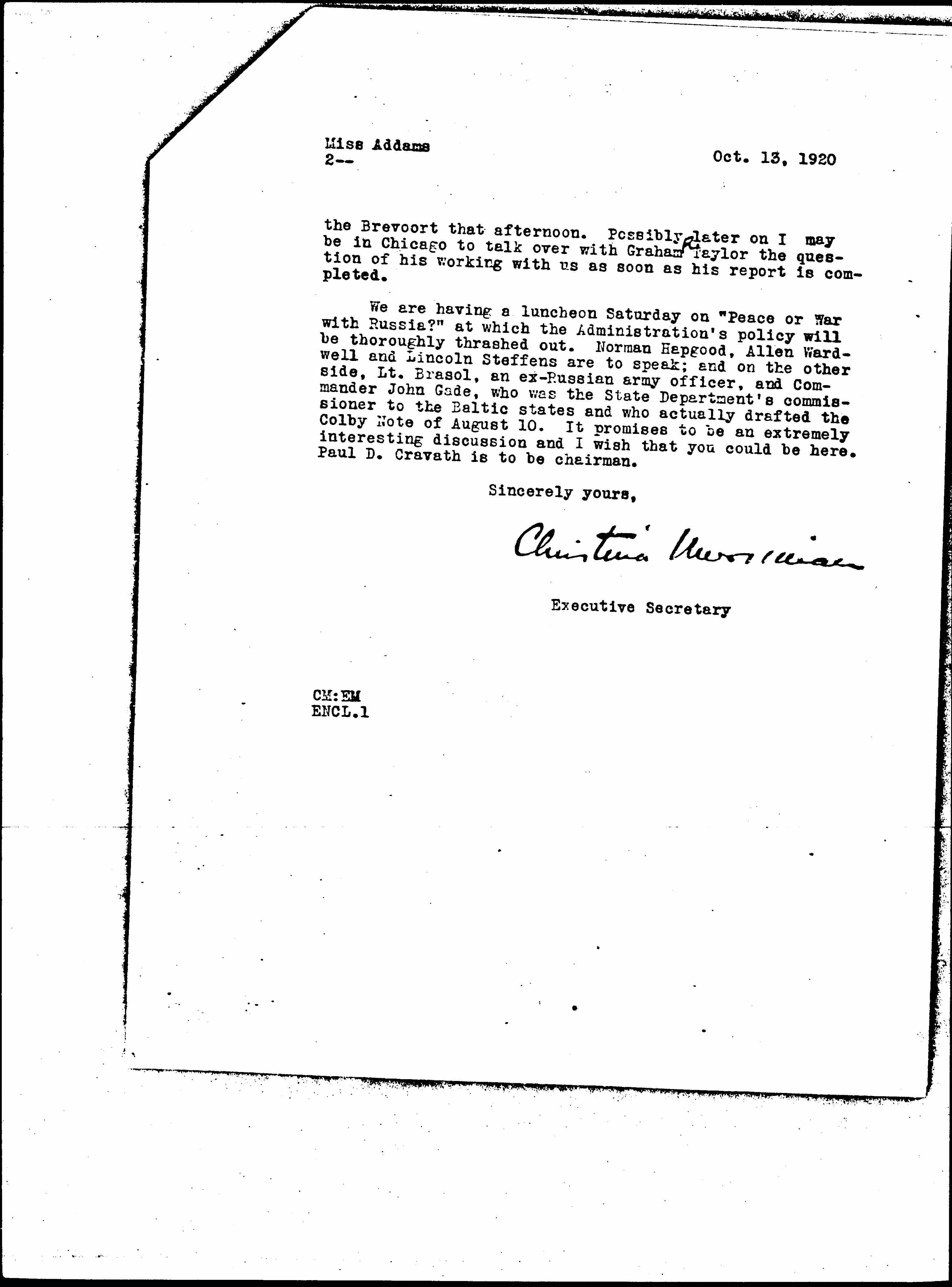 We are having a luncheon Saturday on "Peace or War with Russia?" at which the Administration's policy will be thoroughly thrashed out. Norman Hapgood, Allen Wardwell and Lincoln Steffens are to speak; and on the other side, Lt. Brasol, an ex-Russian army officer, and Commander John Gade, who was the State Department's commissioner to the Baltic states and who actually drafted the Colby Note of August 10. It promises to be an extremely interesting discussion and I wish that you could be here. Paul D. Cravath is to be chairman.