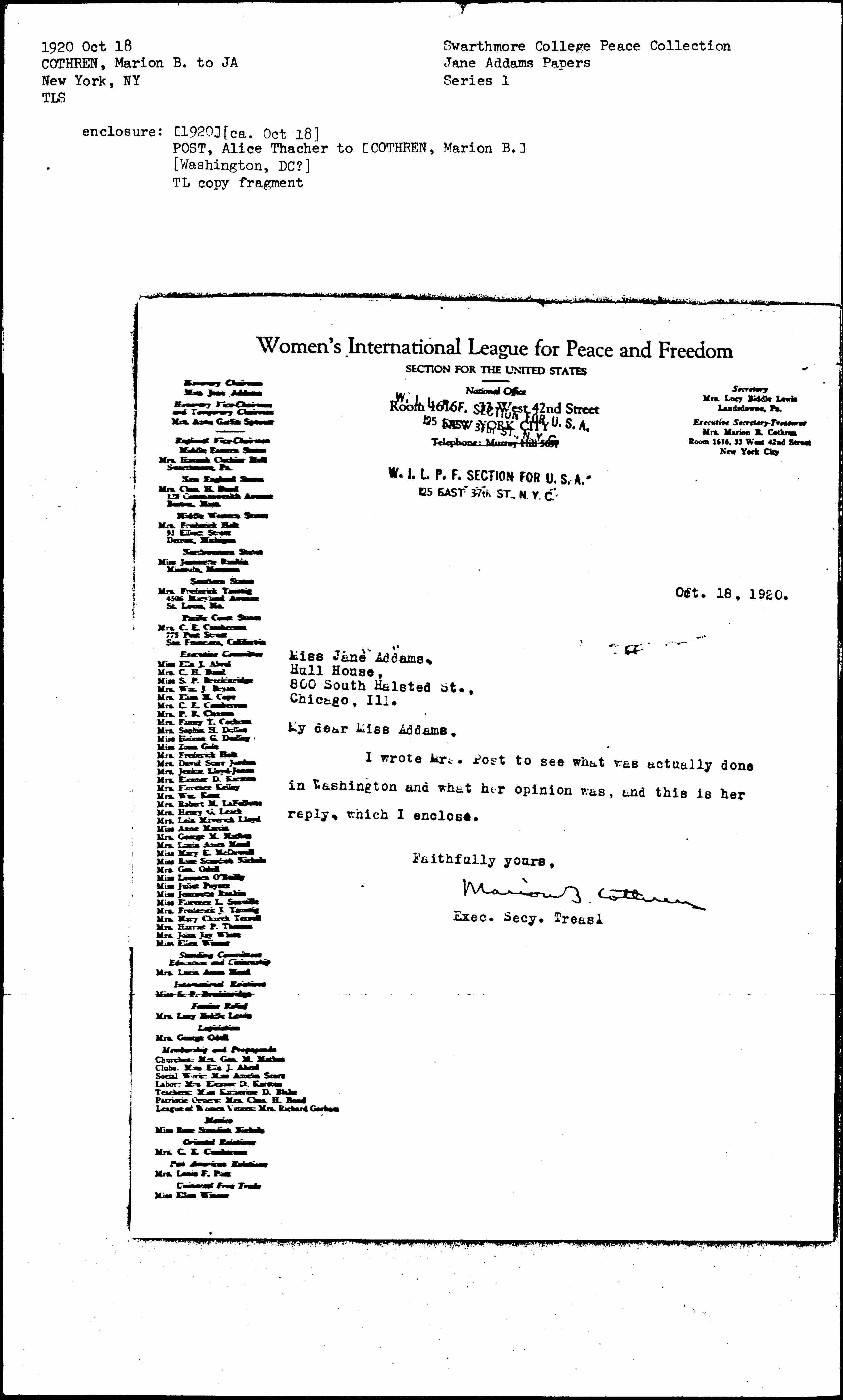 I wrote Mrs. Post to see what was actually done in Washington and what here opinion was, and this is her reply, which I enclose.
