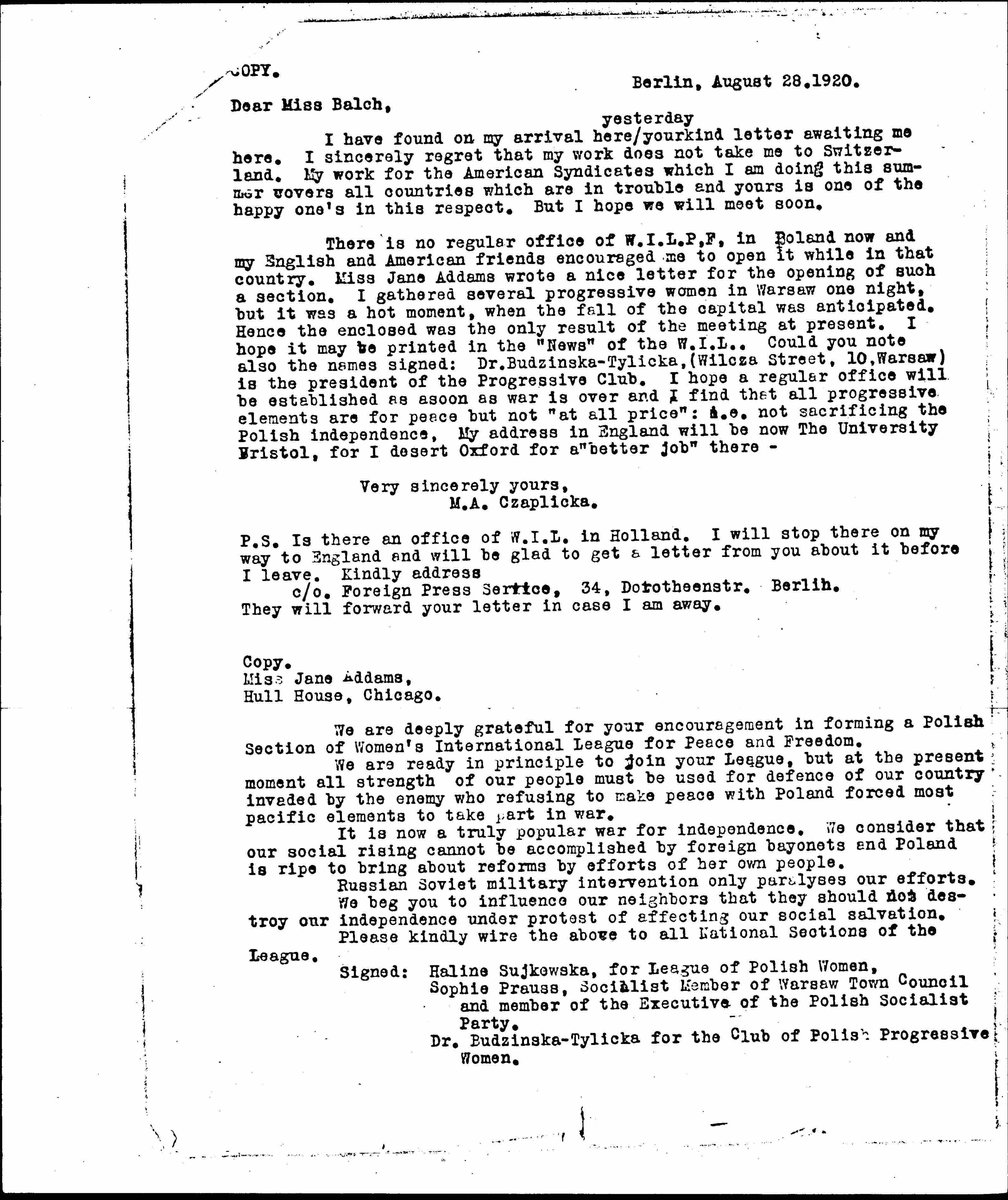 There is no regular office of W.I.L.P.F. in Poland now and my English and American friends encouraged me to open it while in that country. Miss Jane Addams wrote a nice letter for the opening of such a section. I gathered several progressive women in Warsaw one night, but it was a hot moment, when the fall of the capital was anticipated. Hence the enclosed was the only result of the meeting at present. I hope it may be printed in the "News" of the W.I.L. Could you note also the names signed: Dr. Budzinska-Tylicka, (Wilcza Street, 10, Warsaw) is the president of the Progressive Club. I hope a regular office will be established as soon as war is over and I find that all progressive elements are for peace but not "at all price": i.e. not sacrificing the Polish independence. My address in England will be now The University Bristol, for I desert Oxford for a "better job" there.