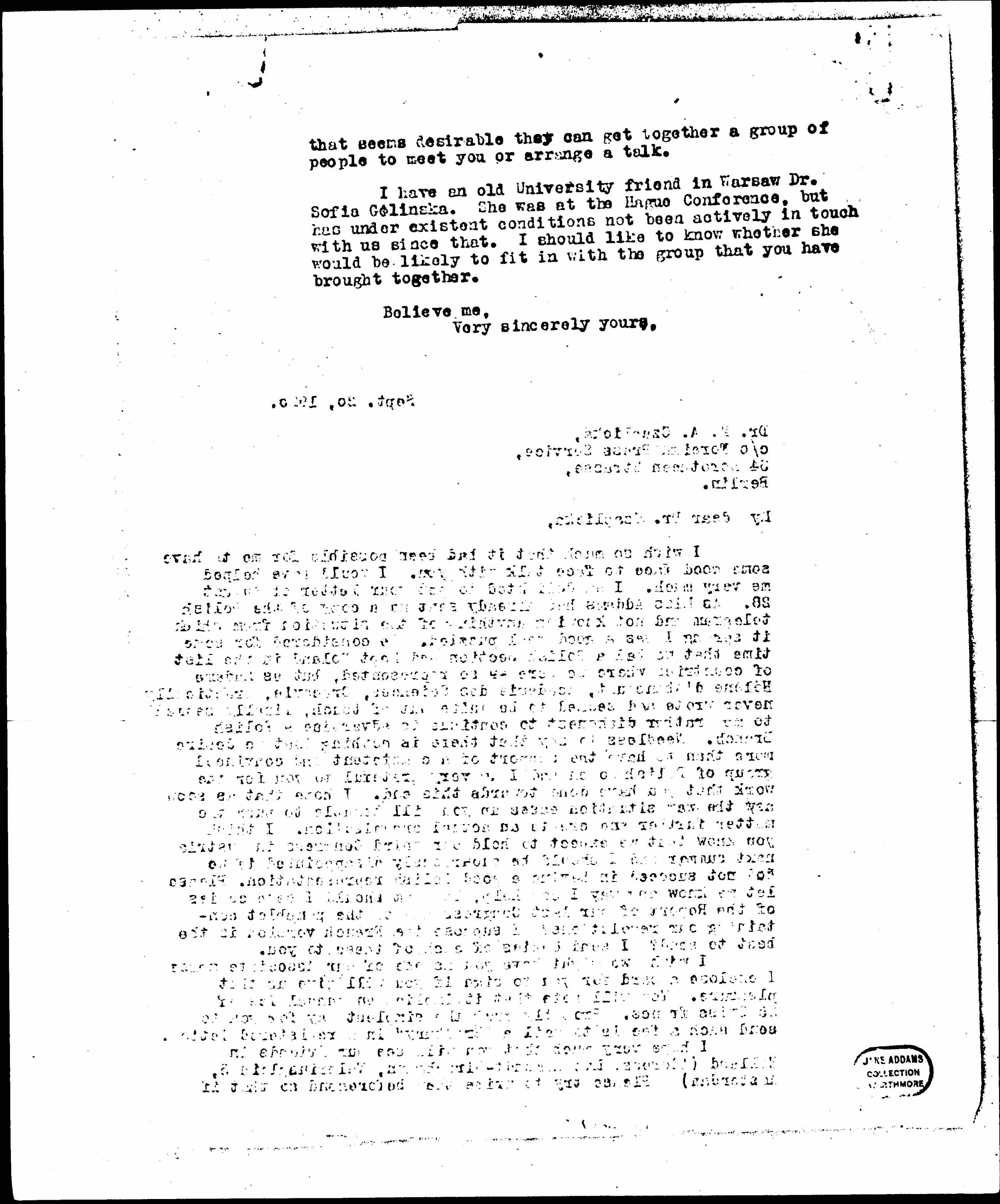 I wish so much that it had been possible for me to have some good face to face talk with you. [It] would have helped me very much. I am delighted to get your letter of August 28. As Miss Addams had already sent me a copy of the Polish telegram and not knowing anything of the situation from which it sprung I was a good deal puzzled. We considered for some time that we had a Polish Section and kept Poland in the list of countries where we were so represented, but Madam Hélène d'Abancourt, Académie des Sciences, [Kraków], practically never wrote and seemed to be quite out of touch, finally seemed to me rather dishonest to continue to advertise a Polish Branch. Needless to say that there is nothing that we desire more than to have the support of a competent and convinced group of Polish women and I am very grateful to you for the work that you have done towards this end. I hope that as soon as the war situation eases up you will be able to push the matter further and create an actual [organization]. I think you know that we expect to hold our third Congress in Austria next summer and I should be enormously disappointed if we [can] not succeed in having a good Polish representation. Please let me know any way I can help. To whom should I send copies of the Report of our last Congress and of the pamphlet containing our resolutions? I suppose the French version is the best to send? I send copies of each of these to you.