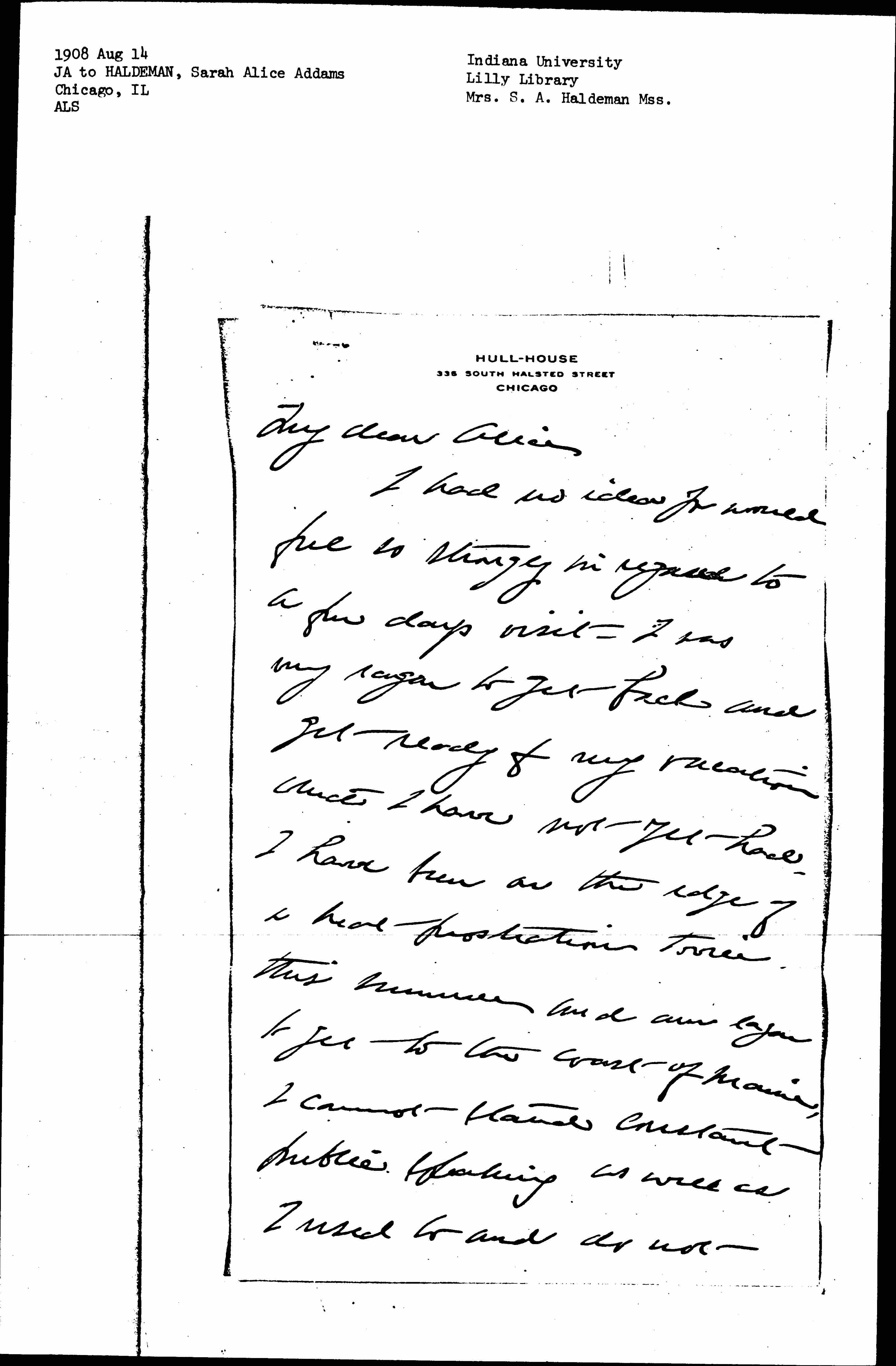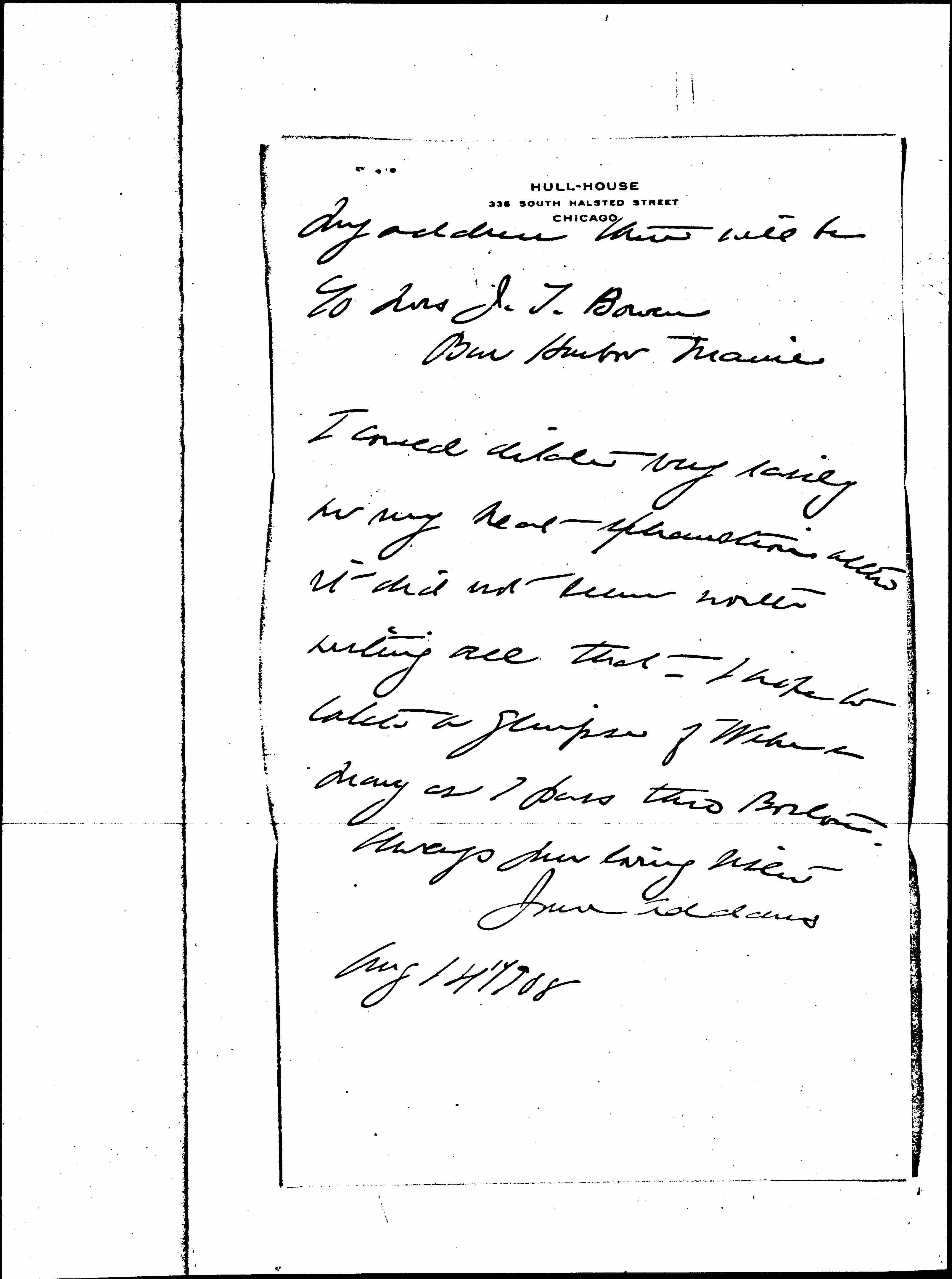 I had no idea you would feel so strongly in regard to a few days visit. I was very eager to get back and get ready for my vacation which I have not yet had. I have been on the edge of a heat prostration twice this summer and am eager to get to the coast of Maine. I cannot stand constant public speaking as well as I used to and do not [page 2] mean to take more summer engagements. If it would not throw out Mrs Bowen's plans I should be glad to come to Girard now, (it is almost as near in price of time & money as I have from any time this summer) but is hardly [seems] worthwhile to make two ladies so irate as I quite innocently seem to have made one. I am sending you Mrs Bowen's letter, which came this morning. [page 3]