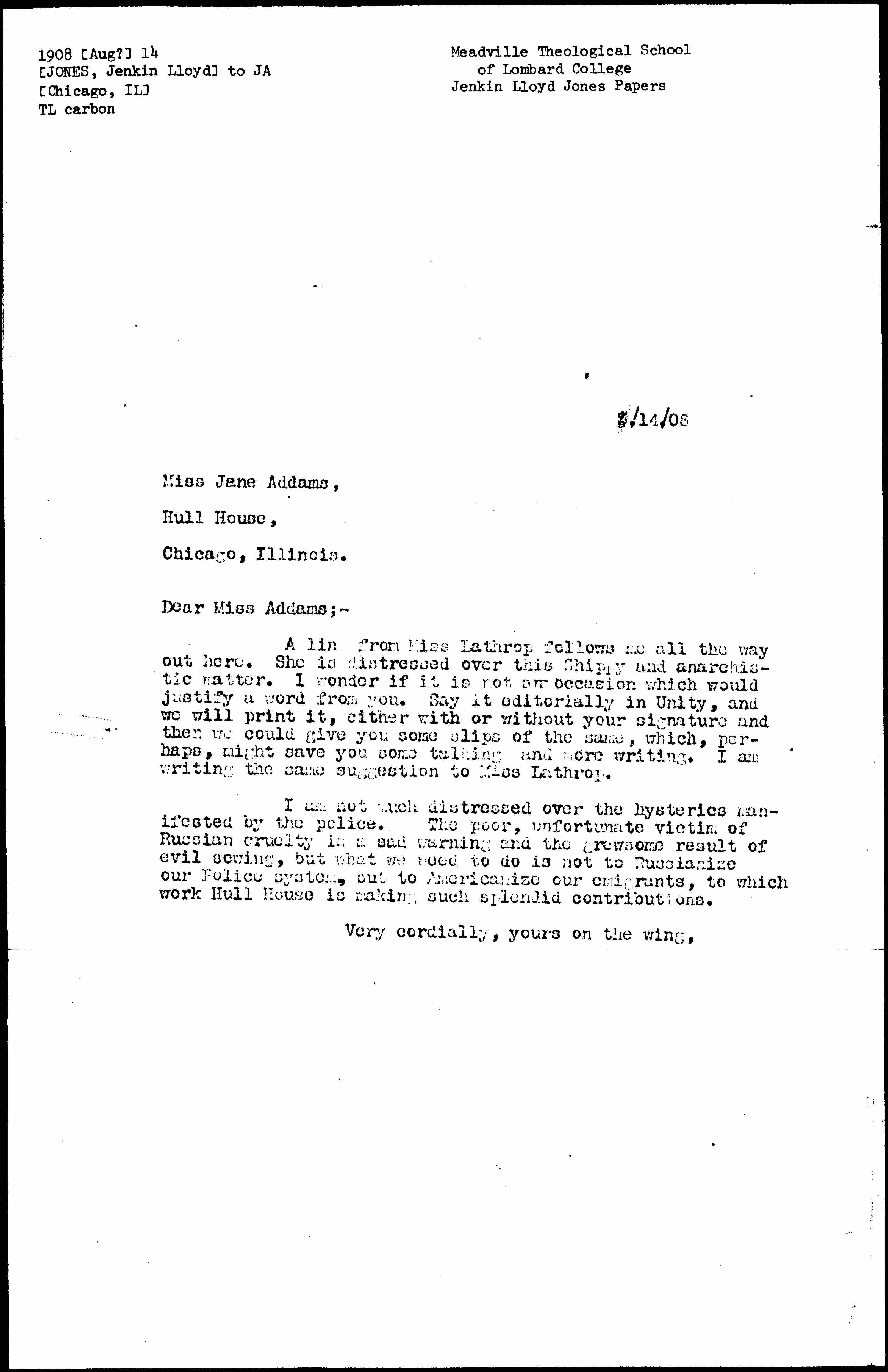 I am not much distressed over the hysterics manifested by the police. The poor, unfortunate victim of Russian cruelty is a sad warning and the [gruesome] result of evil sowing, but what we need to do is not to Russianize our Police system, but to Americanize our emigrants, to which work Hull House is making such splendid contributions.