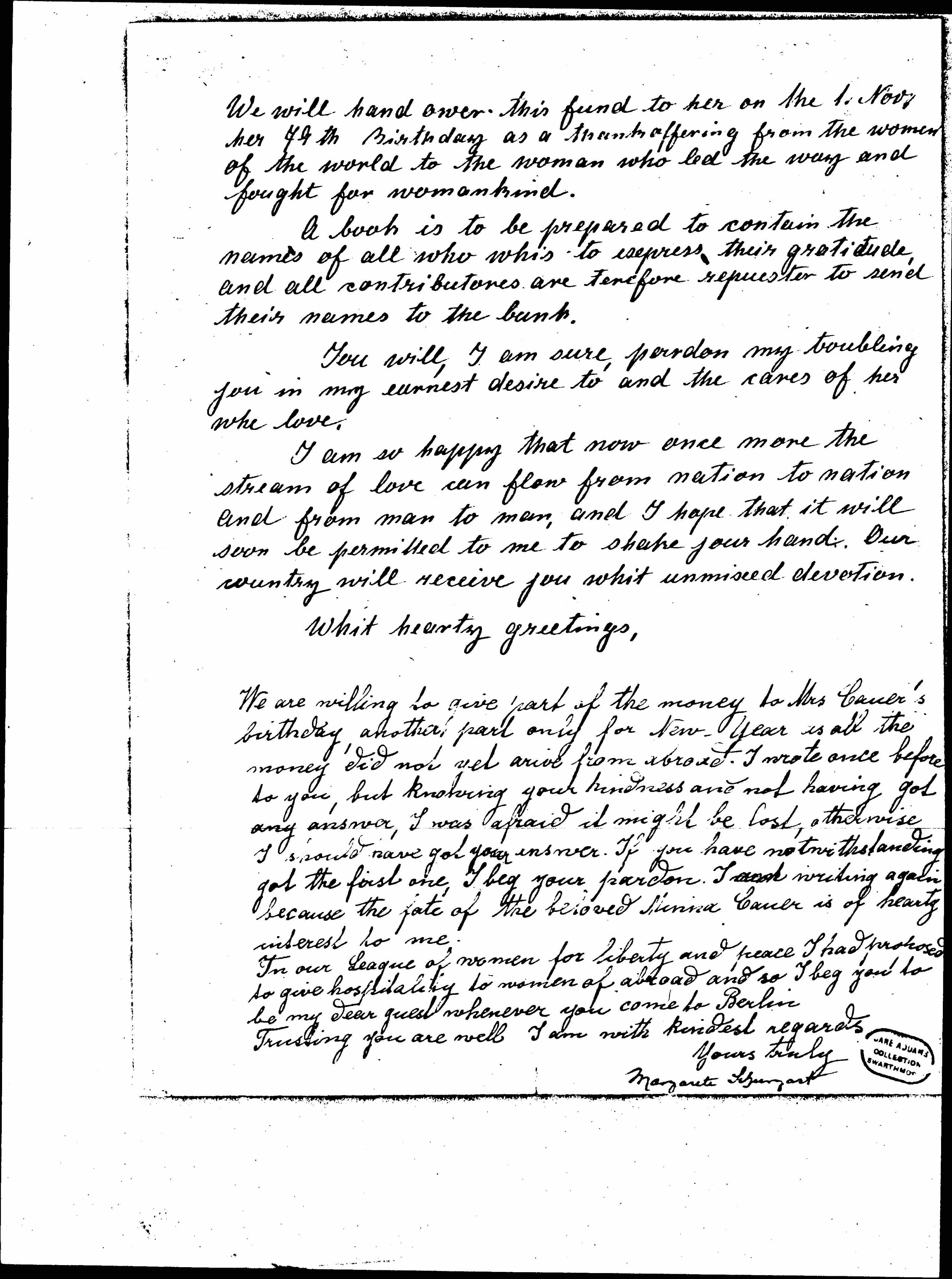We are willing to give part of the money to Mrs. Cauer's birthday, another part only for New-Year as all the money did not yet [arrive] from abroad. I wrote once before to you, but knowing your kindness and not having got any answer, I was afraid it might be lost, otherwise I should have got your [answer]. If you have notwithstanding got the first one, I beg your pardon. I [am] writing again because the fate of the beloved Minna Cauer is of hearty interest to me.
