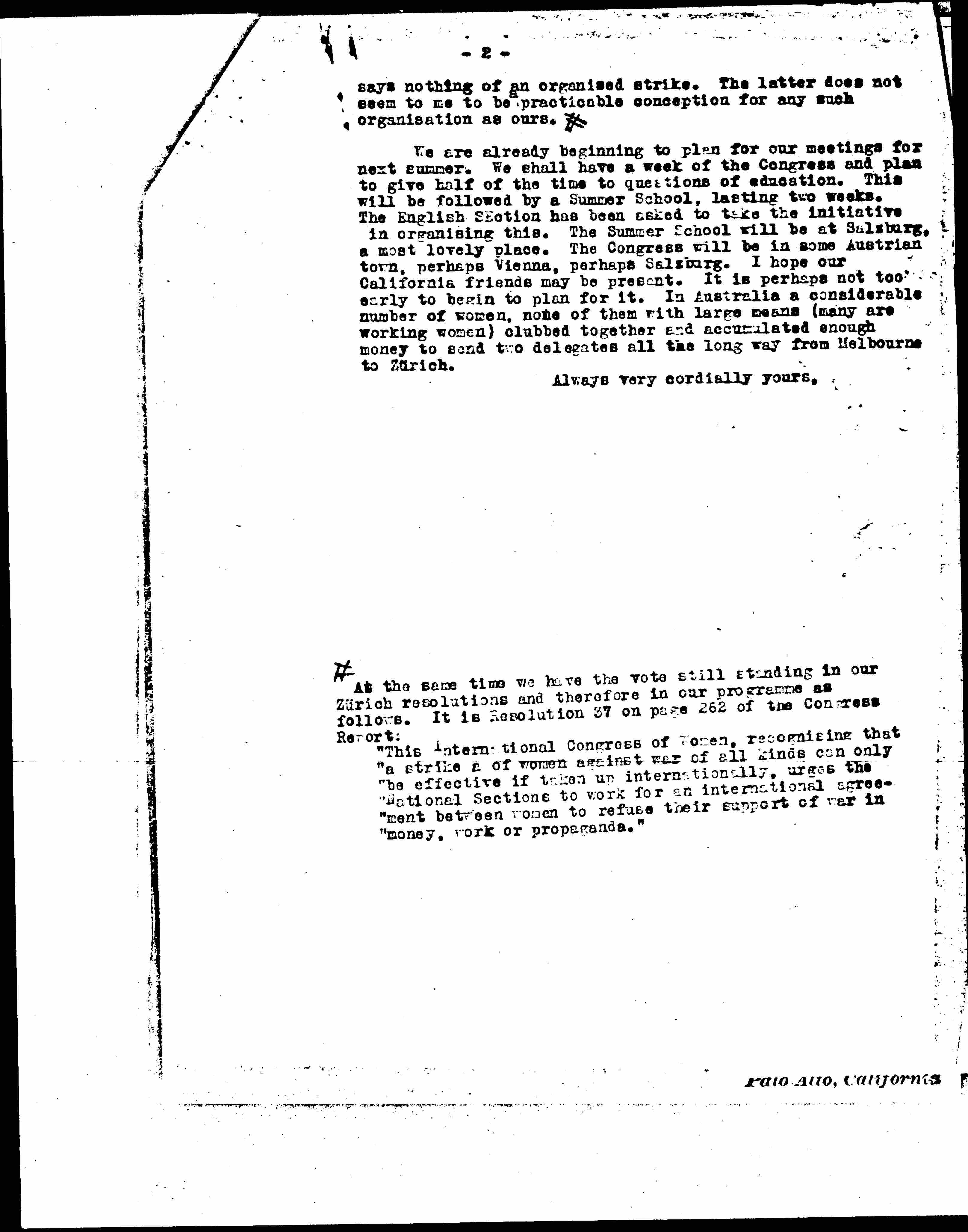 We are already beginning to plan for our meetings for next summer. We shall have a week of the Congress and plan to give half of the time to questions of education. This will be followed by a Summer School, lasting two weeks. The English Section has been asked to take the initiative in [organizing] this. The Summer School will be at Salzburg, a most lovely place. The Congress will be in some Austrian town, perhaps Vienna, perhaps Salzburg. I hope our California friends may be present. It is perhaps not too early to begin to plan for it. In Australia a considerable number of women, none of them with large means (many are working women) clubbed together and accumulated enough money to send two delegates all the long way from Melbourne to Zürich.