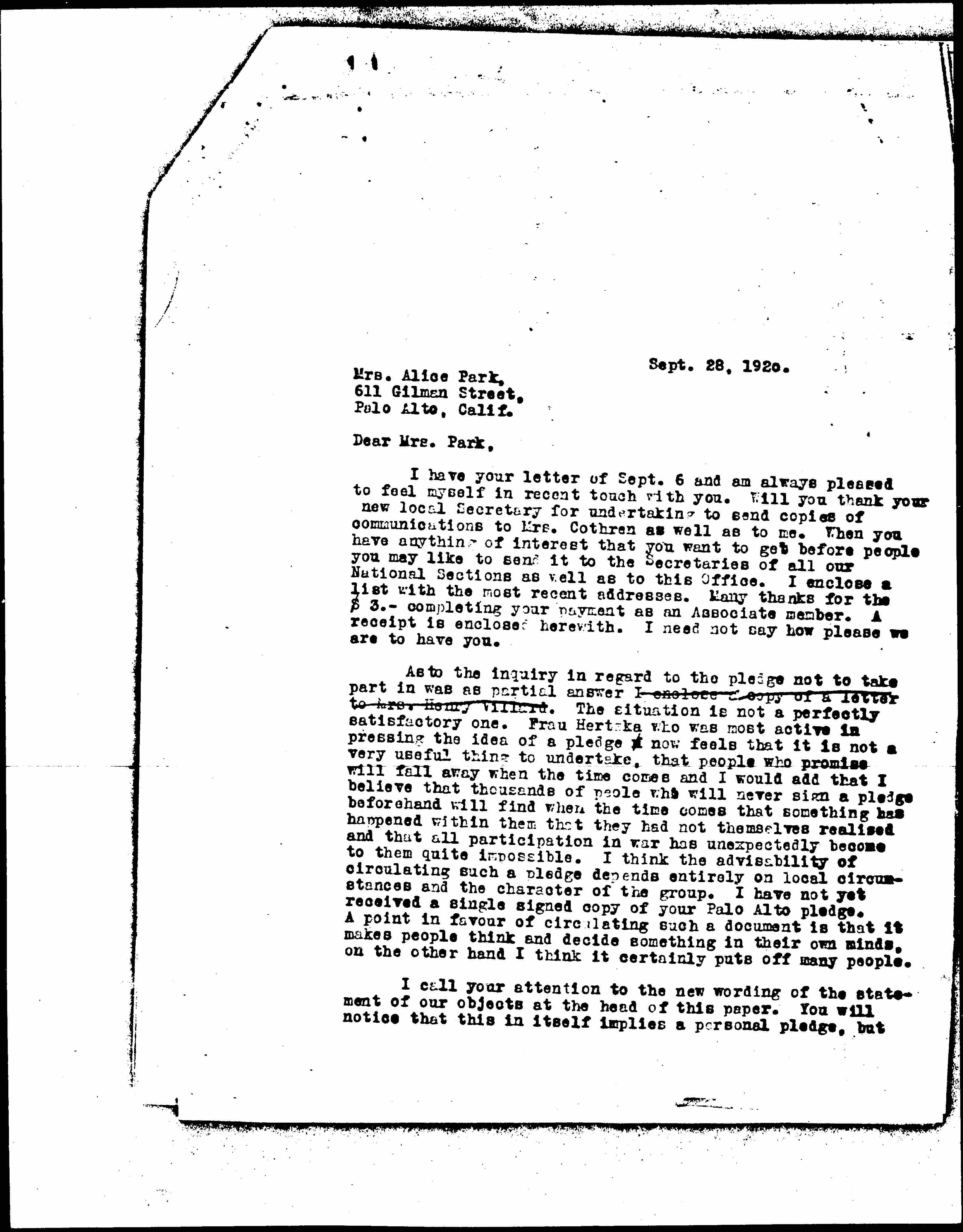 As to the inquiry in regard to the pledge not to take part in was as partial answer I enclose a copy of a letter to Mrs. Henry Villard. The situation is not a perfectly satisfactory one. Frau Hertzka who was most active in pressing the idea of a pledge now feels that it is not a very useful thing to undertake, that people who promise will fall away when the time comes and I would add that I believe that thousands of people who will never sign a pledge beforehand will find when the time comes that something has happened within them that they had not themselves [realized] and that all participation in war has unexpectedly become to them quite impossible. I think the advisability of circulating such a pledge depends entirely on local circumstances and the character of the group. I have not yet received a single signed copy of your Palo Alto pledge. A point in [favor] of circulating such a document is that it makes people think and decide something in their own minds, on the other hand I think it certainly puts off many people.