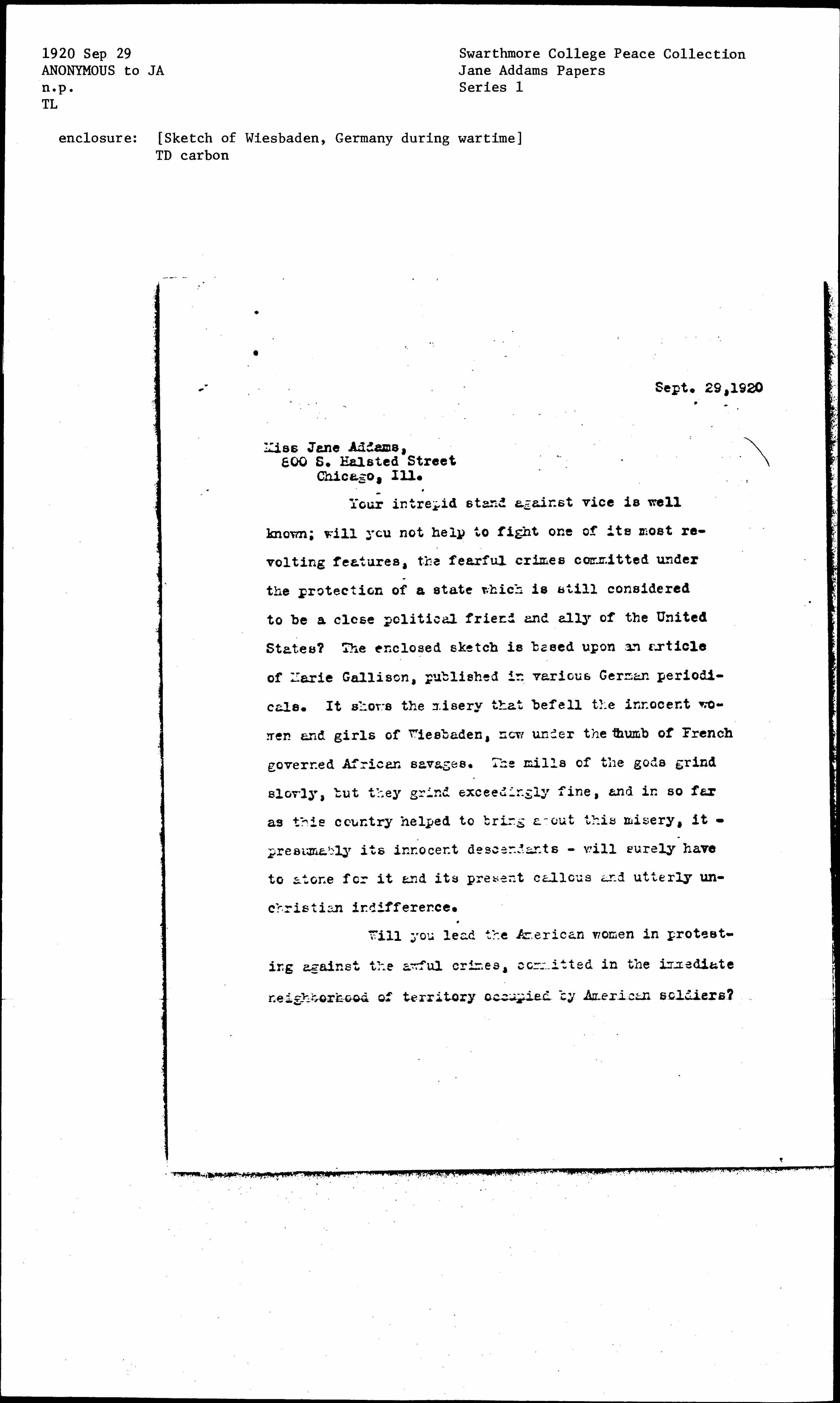 Your intrepid stand against vice is well known; will you not help to fight one of its most revolting features, the fearful crimes committed under the protection of a state which is still considered to be a close political friend and ally of the United States? The enclosed sketch is based upon an article of Marie Gallison, published in various German periodicals. It shows the misery that befell the innocent women and girls of Wiesbaden, now under the thumb of French governed African savages. The mills of the gods grind slowly, but they grind exceedingly fine, and in so far as this country helped to bring about this misery, it -- presumably its innocent descendants -- will surely have to atone for it and its present callous and utterly unchristian indifference.