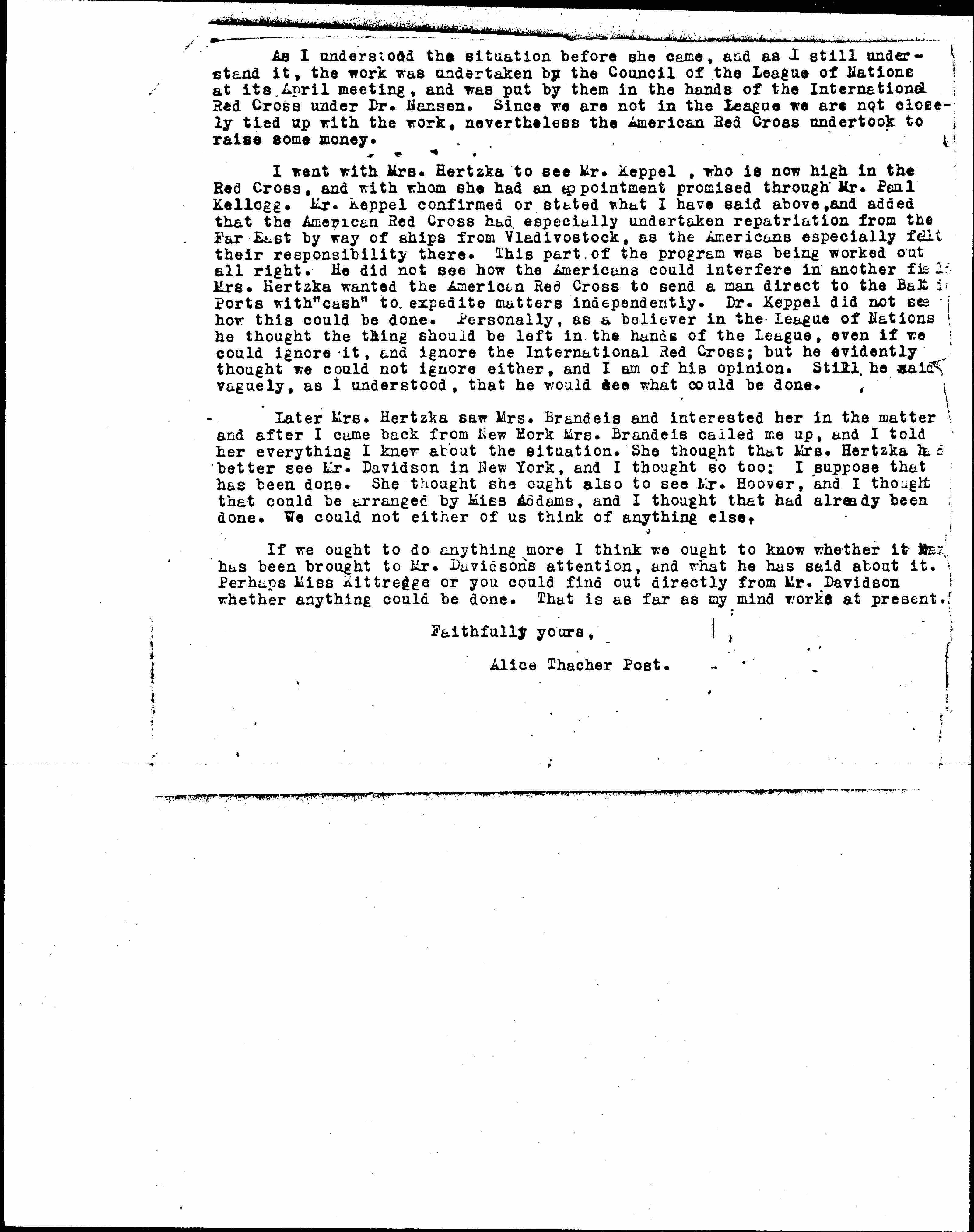 [first page(s) missing] As I understood the situation before she came, and as I still understand it, the work was undertaken by the Council of the League of Nations at its April meeting, and was put by them in the hands of the International Red Cross under Dr. Nansen. Since we are not in the League we are not closely tied up with the work, nevertheless the American Red Cross undertook to raise some money.