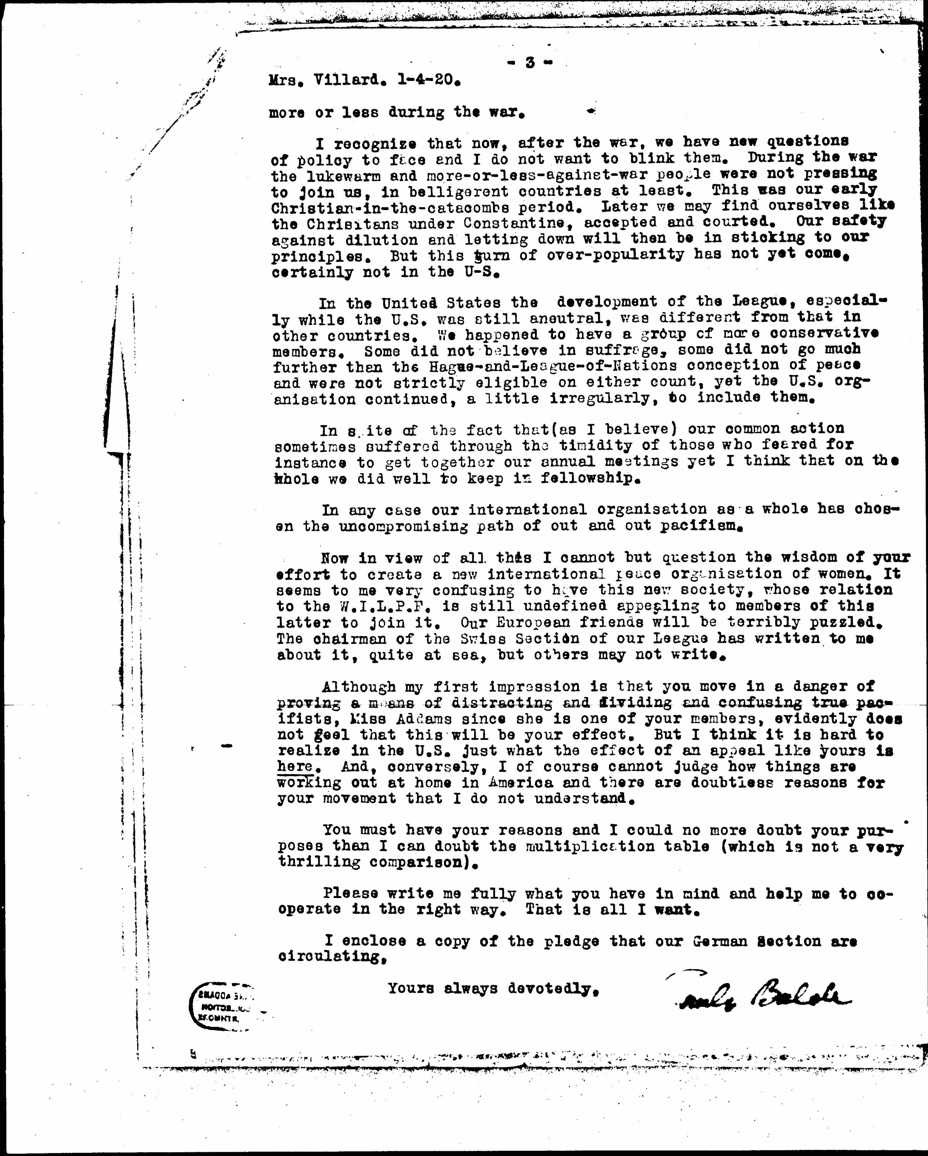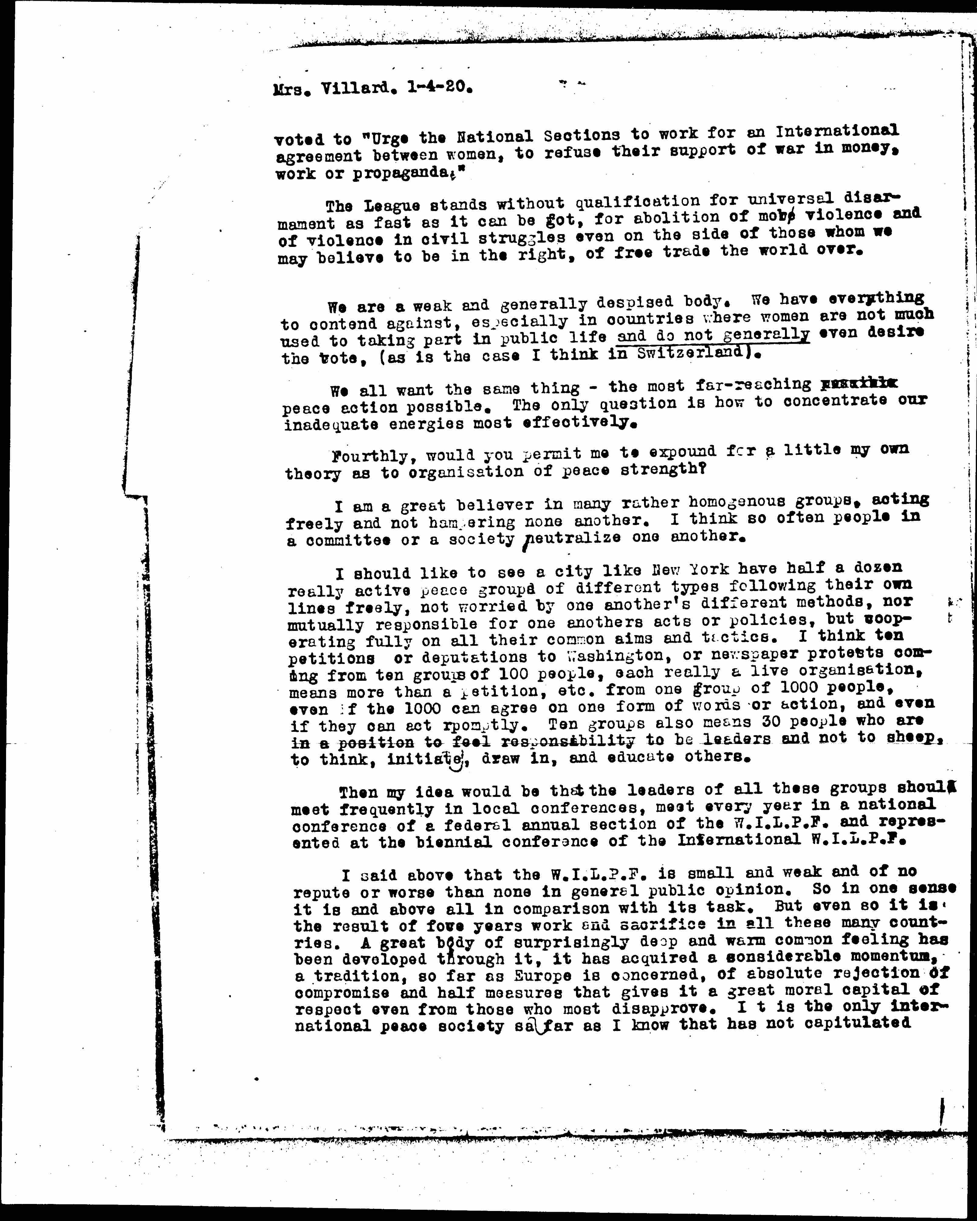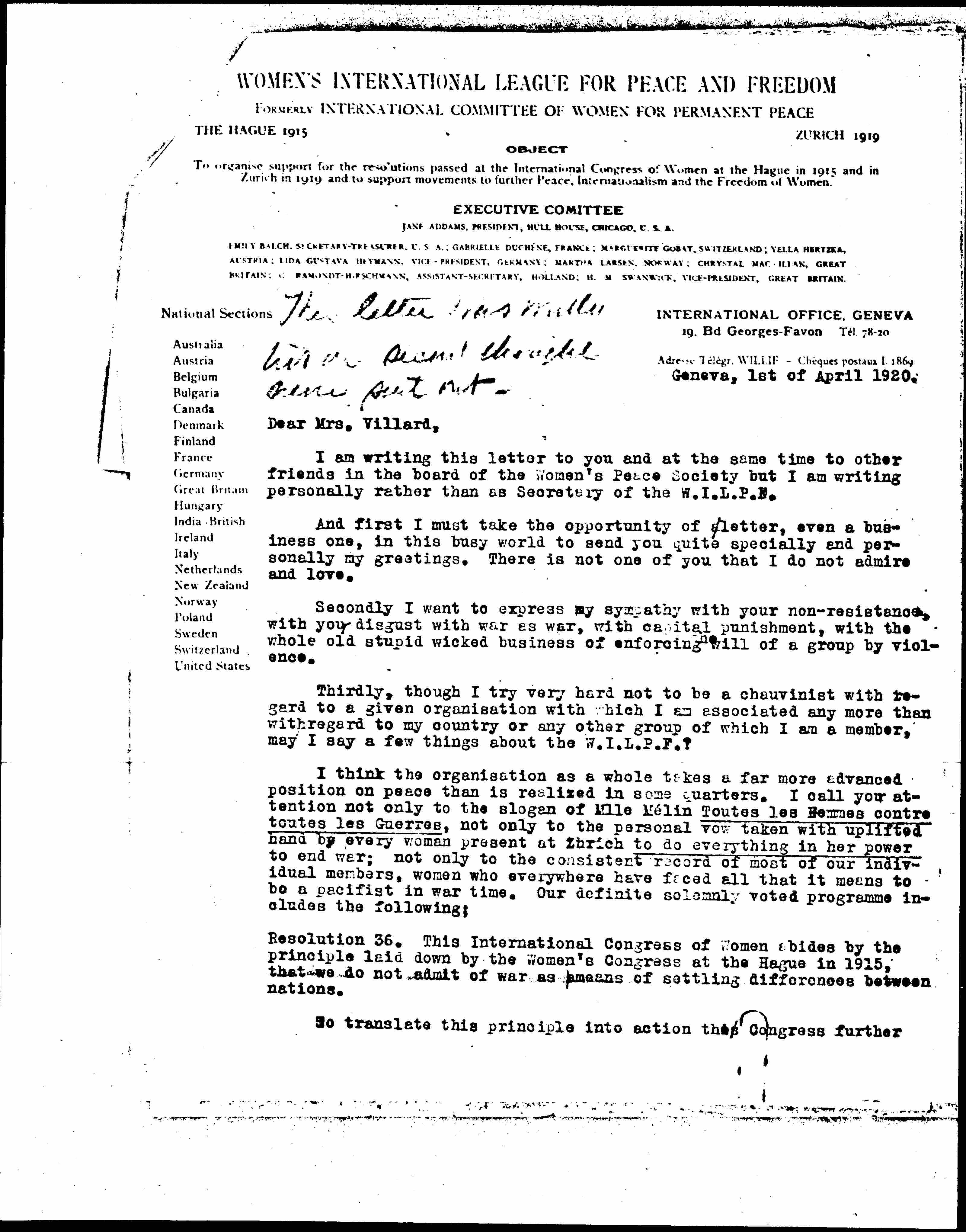 Now in view of all this I cannot but question the wisdom of your effort to create a new international peace [organization] of women. It seems to me very confusing to have this new society, whose relation to the W.I.L.P.F. is still undefined appealing to members of this latter to join it. Our European friends will be terribly puzzled. The chairman of the Swiss Section of our League has written to me about it, quite at sea, but others may not write.