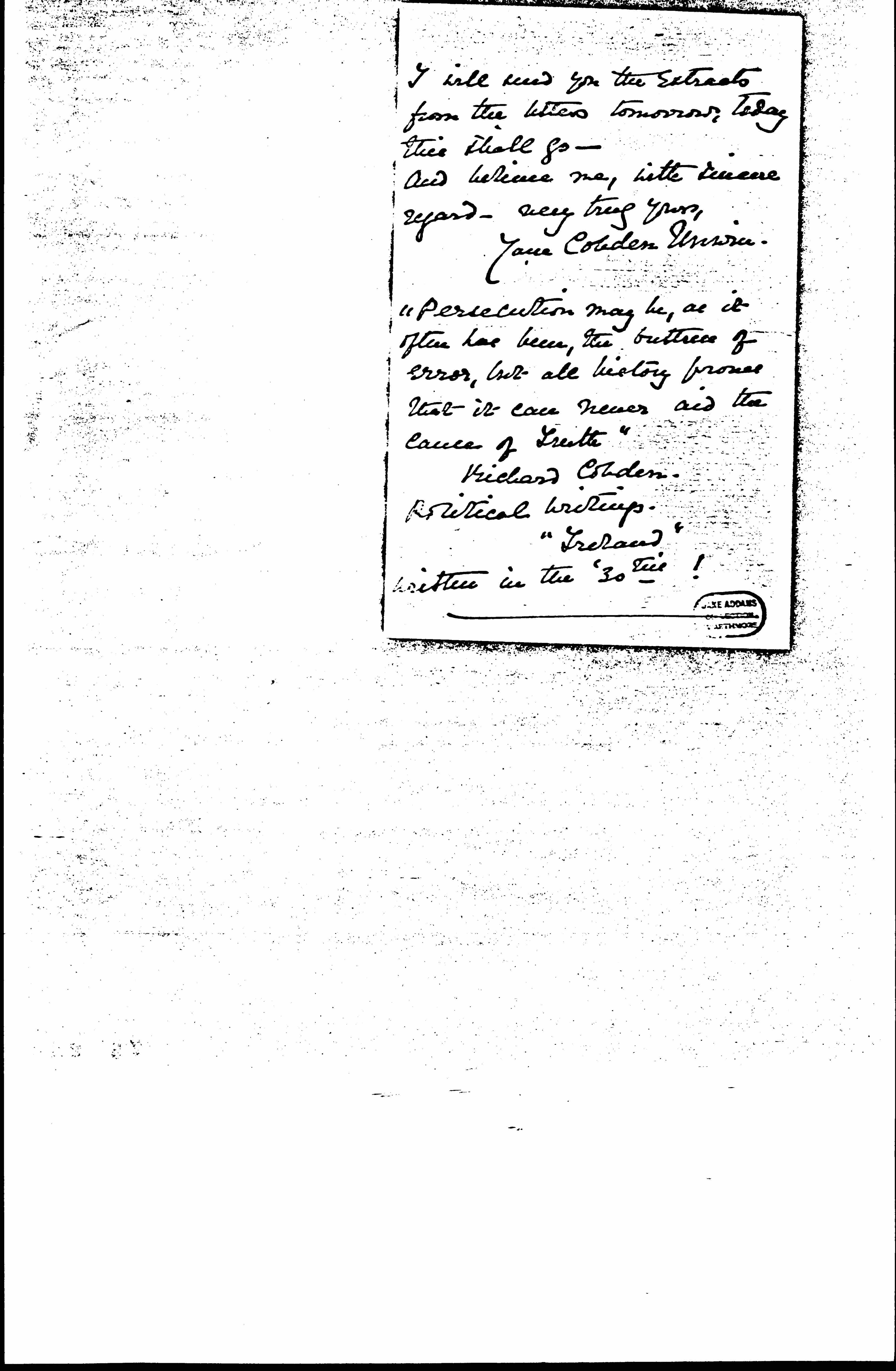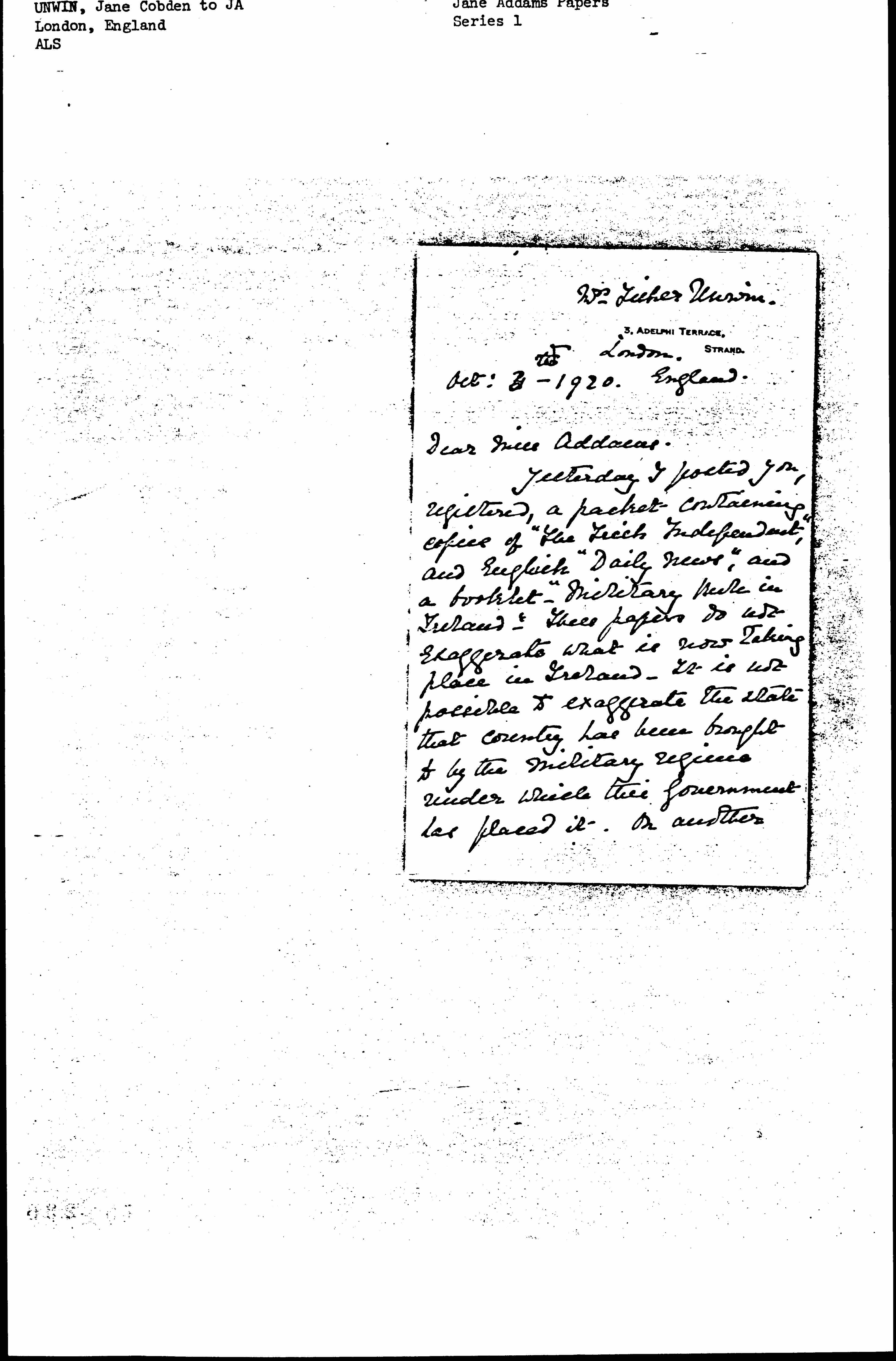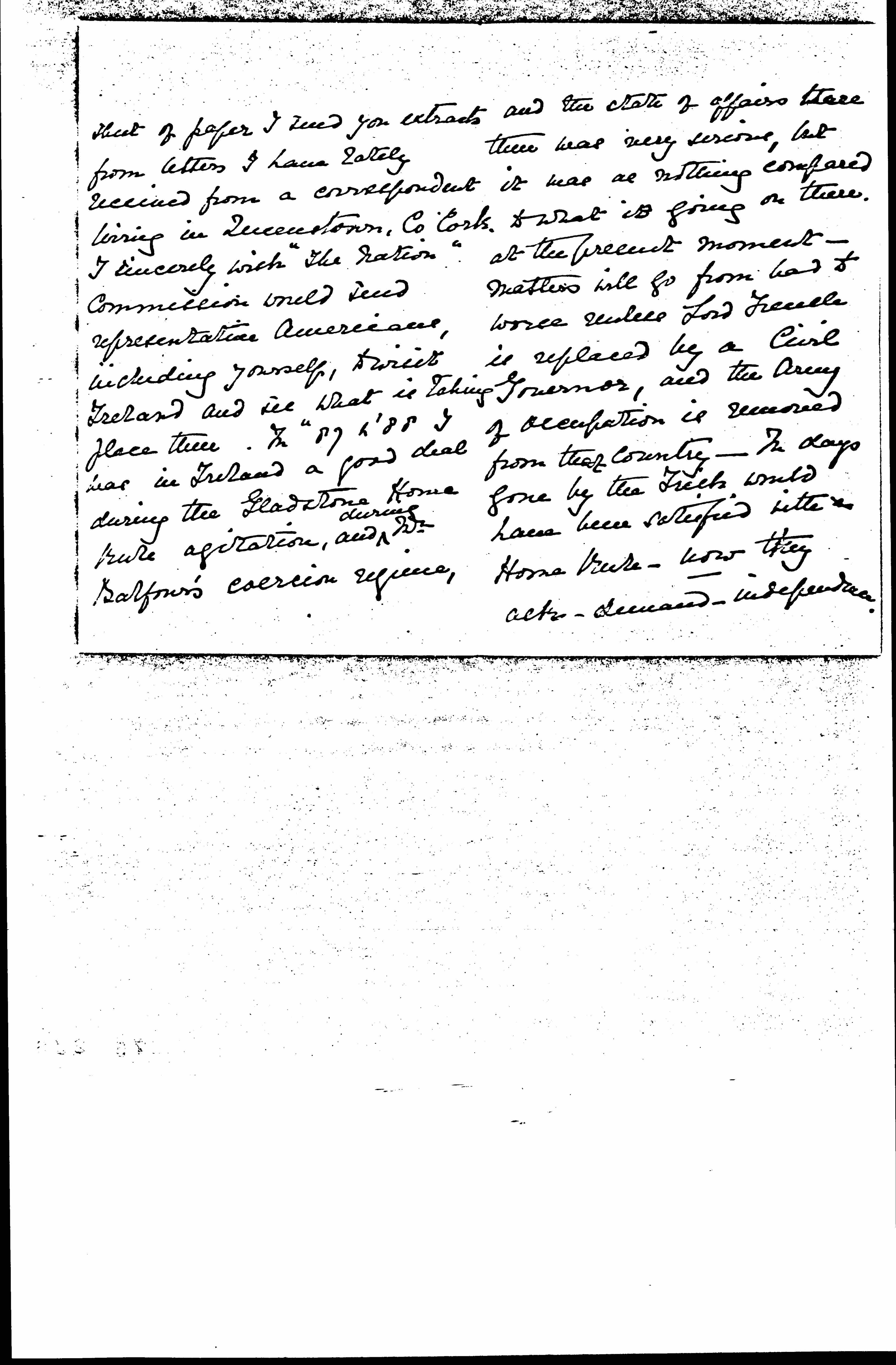 Yesterday I posted you, registered, a packet containing copies of "The Irish Independent," and [English] "Daily News," and a booklet, "Military Rule in Ireland." These papers do not exaggerate what is now taking place in Ireland. It is not possible to exaggerate the state that country has been brought to by the military regimes under which this government has placed it. On another [page 2] sheet of paper I send you extracts from letters I have lately received from a correspondent living in Queenstown, Co Cork. I sincerely wish "The Nation" commission would send representative Americans, including yourself, to visit Ireland and see what is taking place there. For '87 & '88 I was in Ireland a good deal during the Gladstone Home rule agitation, and ↑during↓ Mr. Balfour's coercion regime, [page 3] and the state of affairs there was very serious, but it was as nothing compared to what is going on there at the present moment -- matters will go from bad to worse unless Lord French is replaced by a [Civil] Governor, and the Army of occupation is removed from that country -- In days gone by the Irish would have been sacrificed with Home rule. Now they ask -- demand -- independence. [page 4] I will send you the extracts from the letters tomorrow, today this shall go --