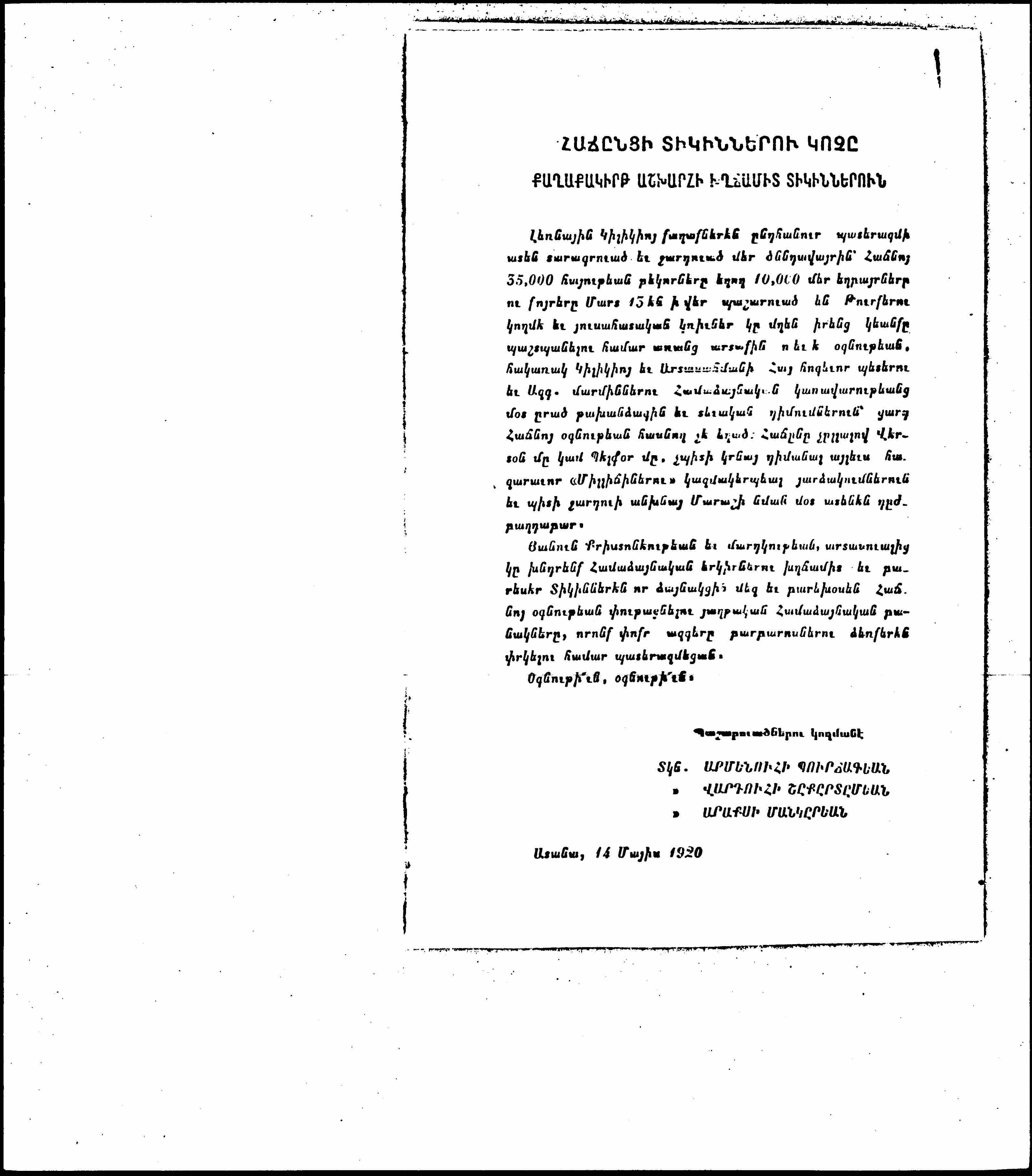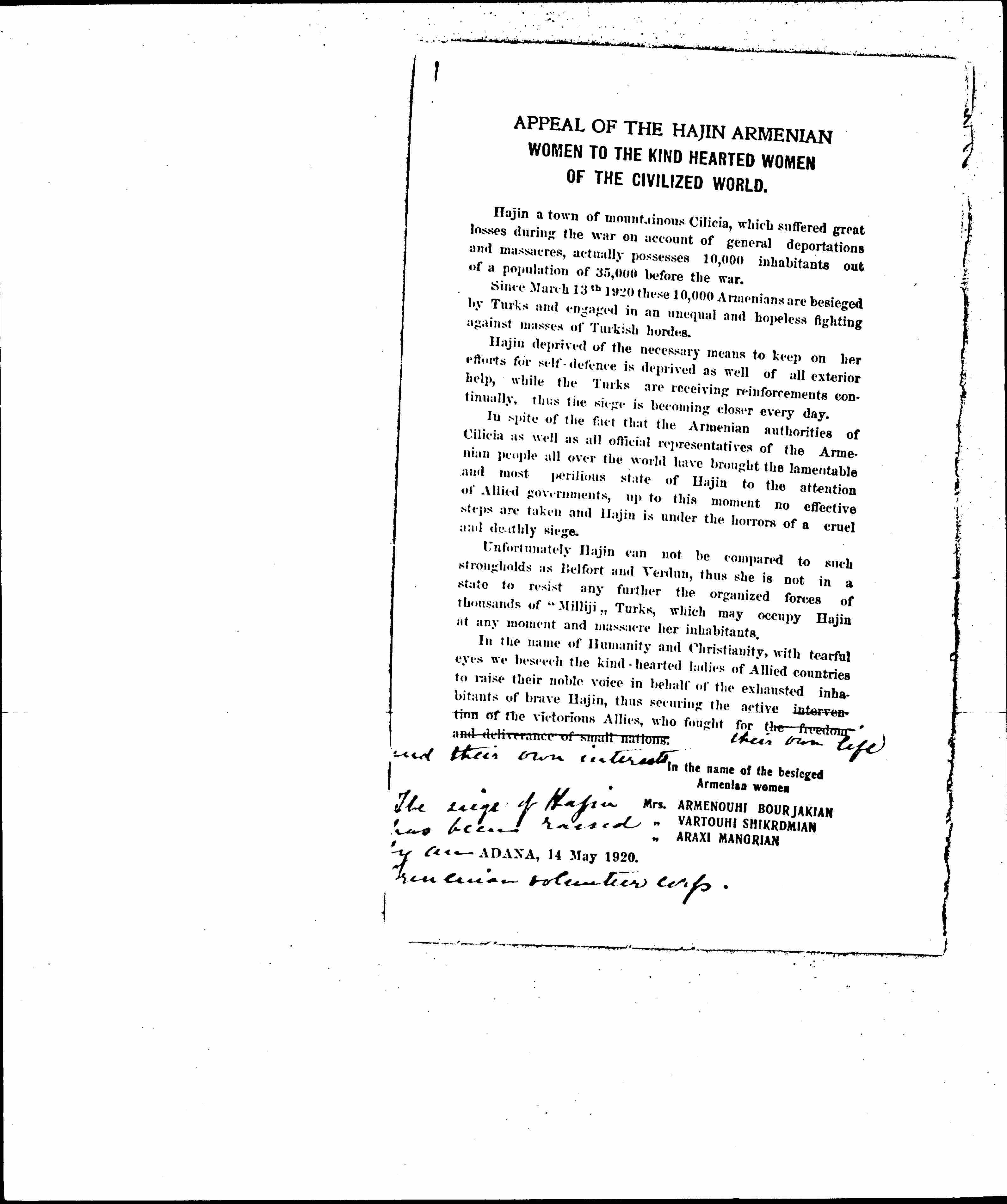 In the name of Humanity and Christianity, with tearful eyes we beseech the kind-hearted ladies of Allied countries to raise their noble voice in behalf of the exhausted inhabitants of brave Hajin, thus securing the active intervention of the victorious Allies, who fought for the freedom and deliverance of small nations. ↑their own life and their own interests↑