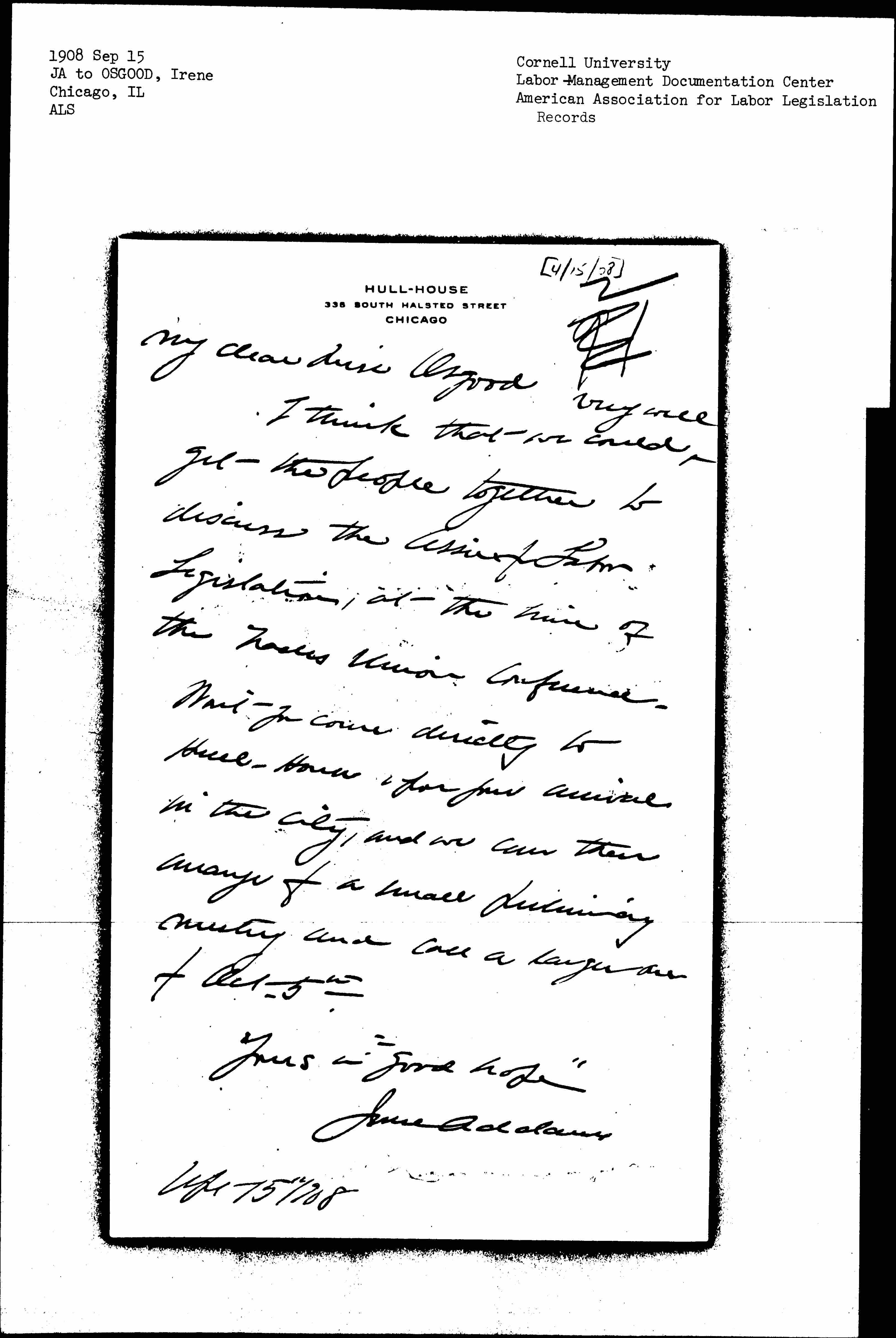 Won't you come directly to Hull-House, for your arrival in the city, and we can then arrange for a small prliminary meeting and call a larger one for Oct. 5th.