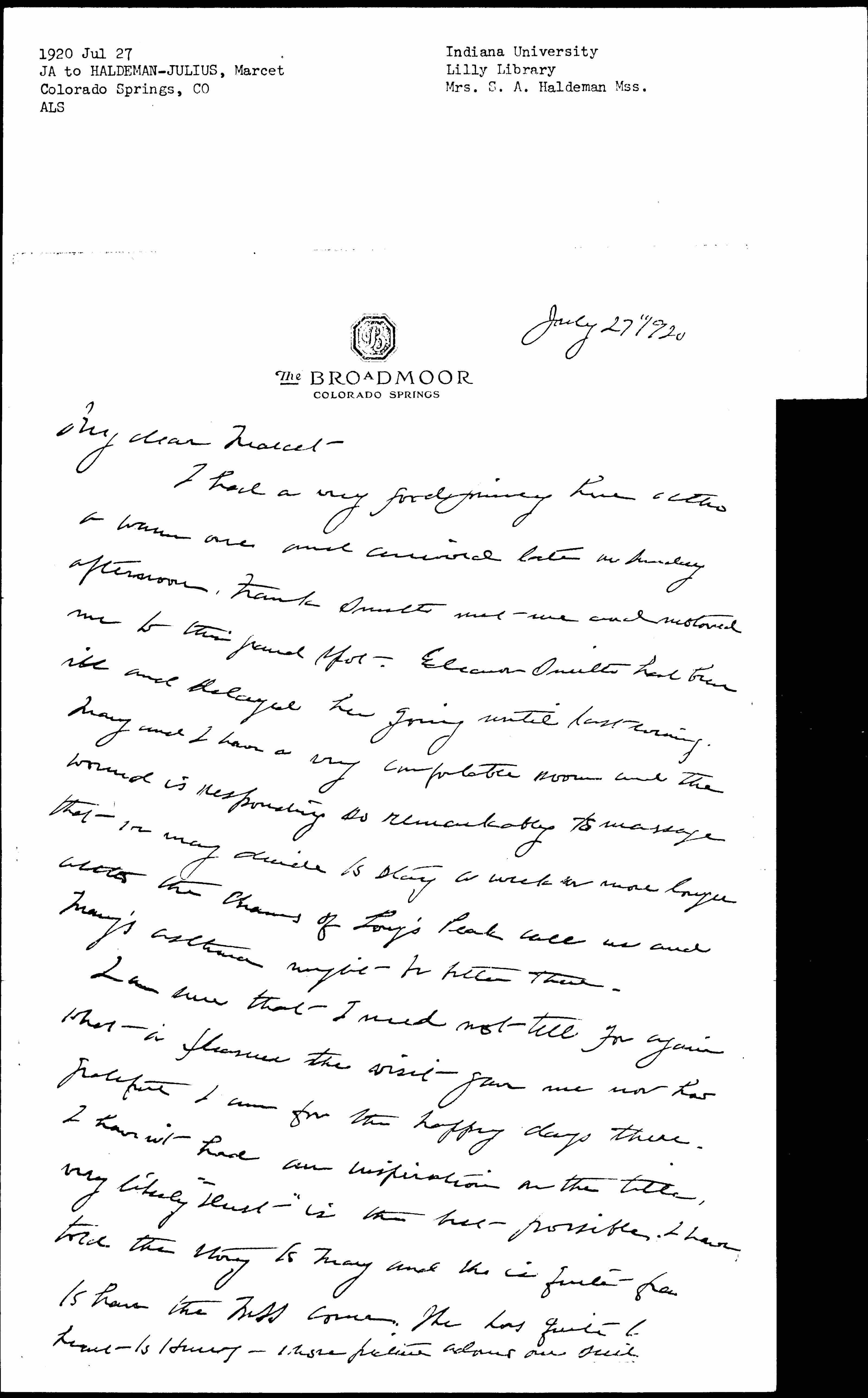 I had a very good journey here [although] a warm one and arrived later on Sunday afternoon. Frank Smith met me and motored me to this grand spot. Eleanor Smith had been ill and delayed her going until last evening. Mary and I have a very comfortable room and the wound is responding so remarkably to massage that we may decide to stay a week or more longer [although] the charms of Long's Peak call us and Mary's asthma might be better there.