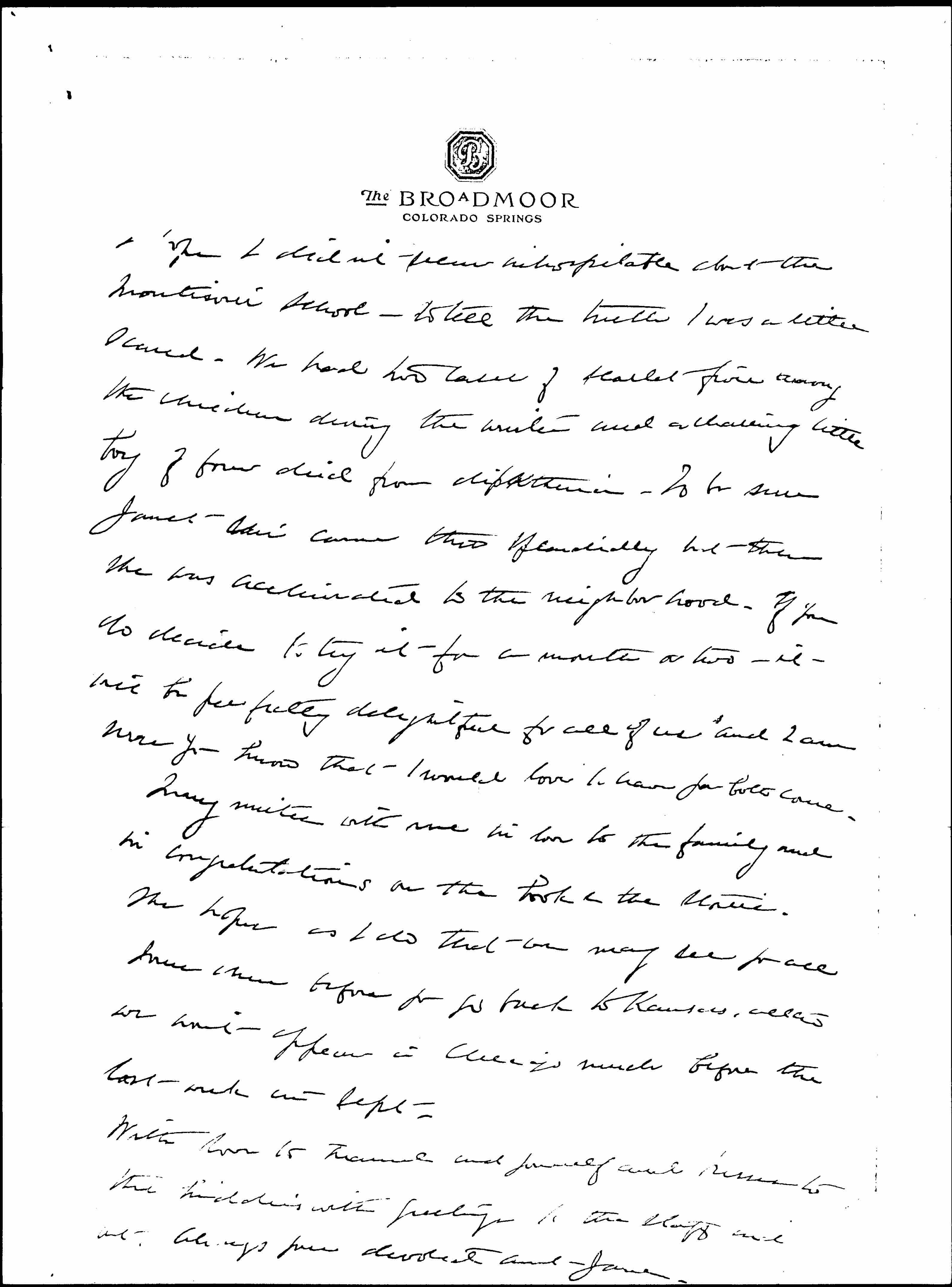 I hope I didn't seem inhospitable about the Montessori school -- to tell the truth I was a little scared. We had two cases of scarlet fever among the children during the winter and a charming little boy of four died from diphtheria. To be sure [Janet's?] son came [through] splendidly but then she was acclimated to the neighborhood. If you do decide to try it for a month or two -- it will be perfectly delightful for all of us and I am sure you know that I would love to have you both come.
