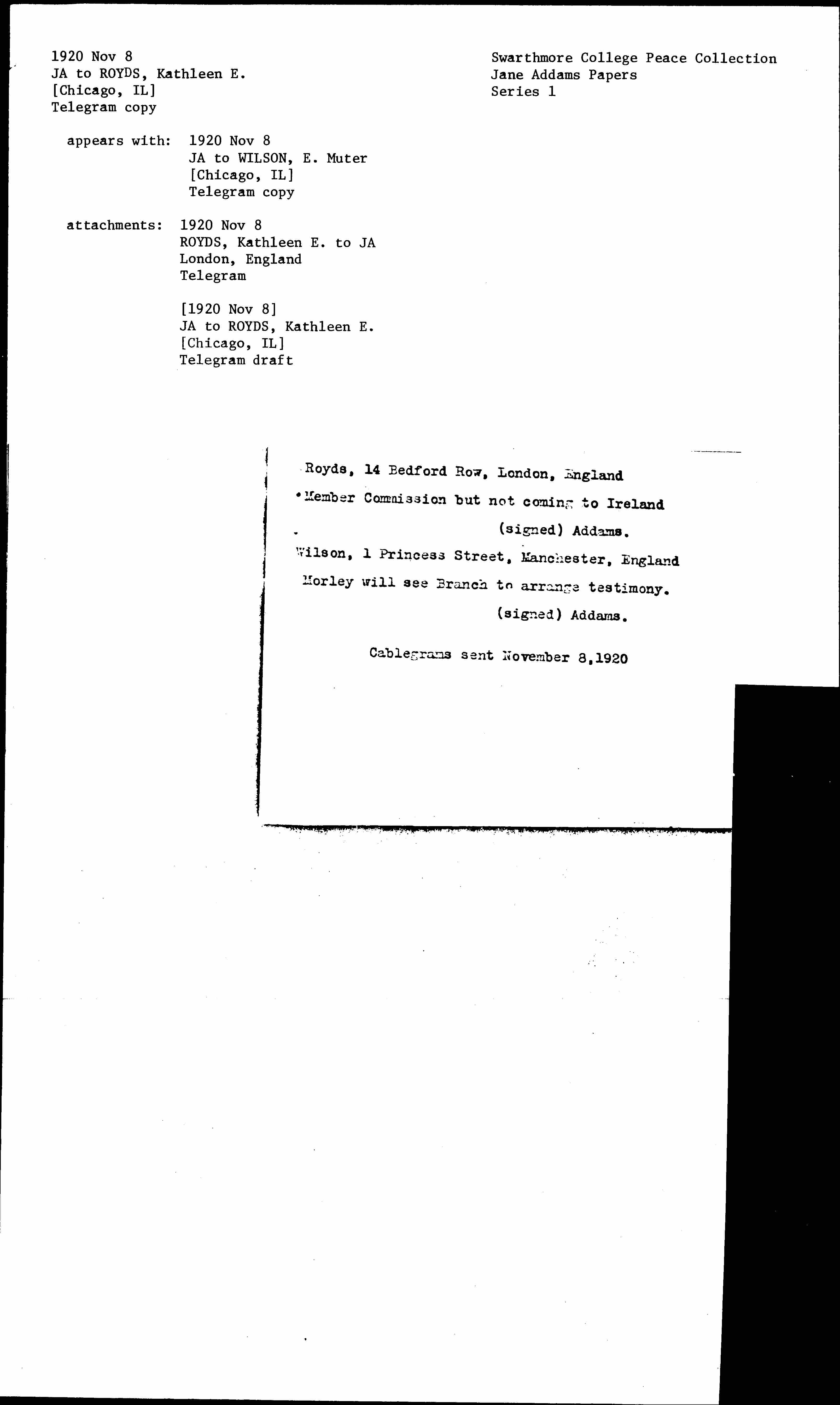 Cablegrams sent November 8, 1920