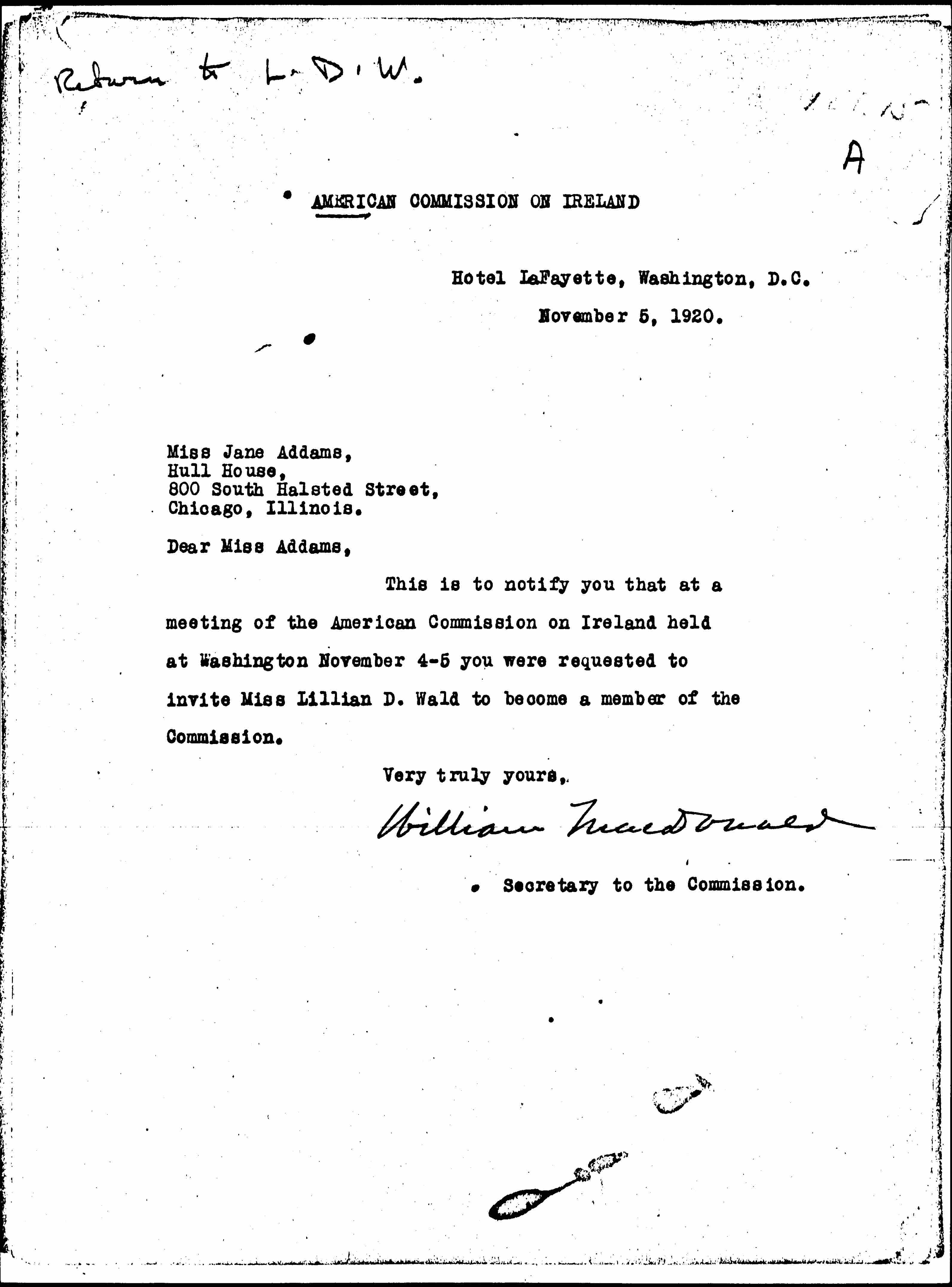 This is to notify you that at a meeting of the American Commission on Ireland held at Washington November 4-5 you were requested to invite Miss Lillian D. Wald to become a member of the Commission.