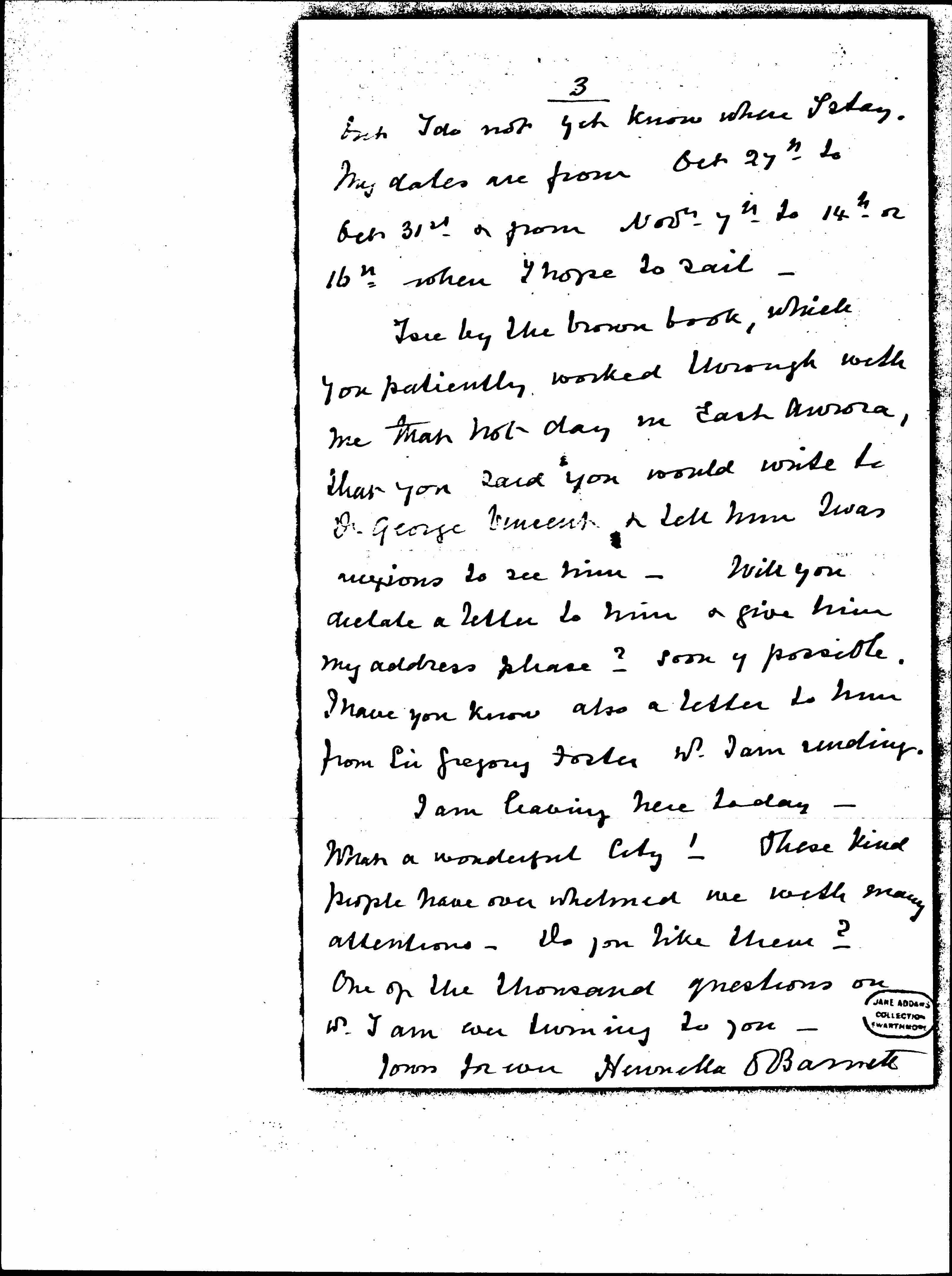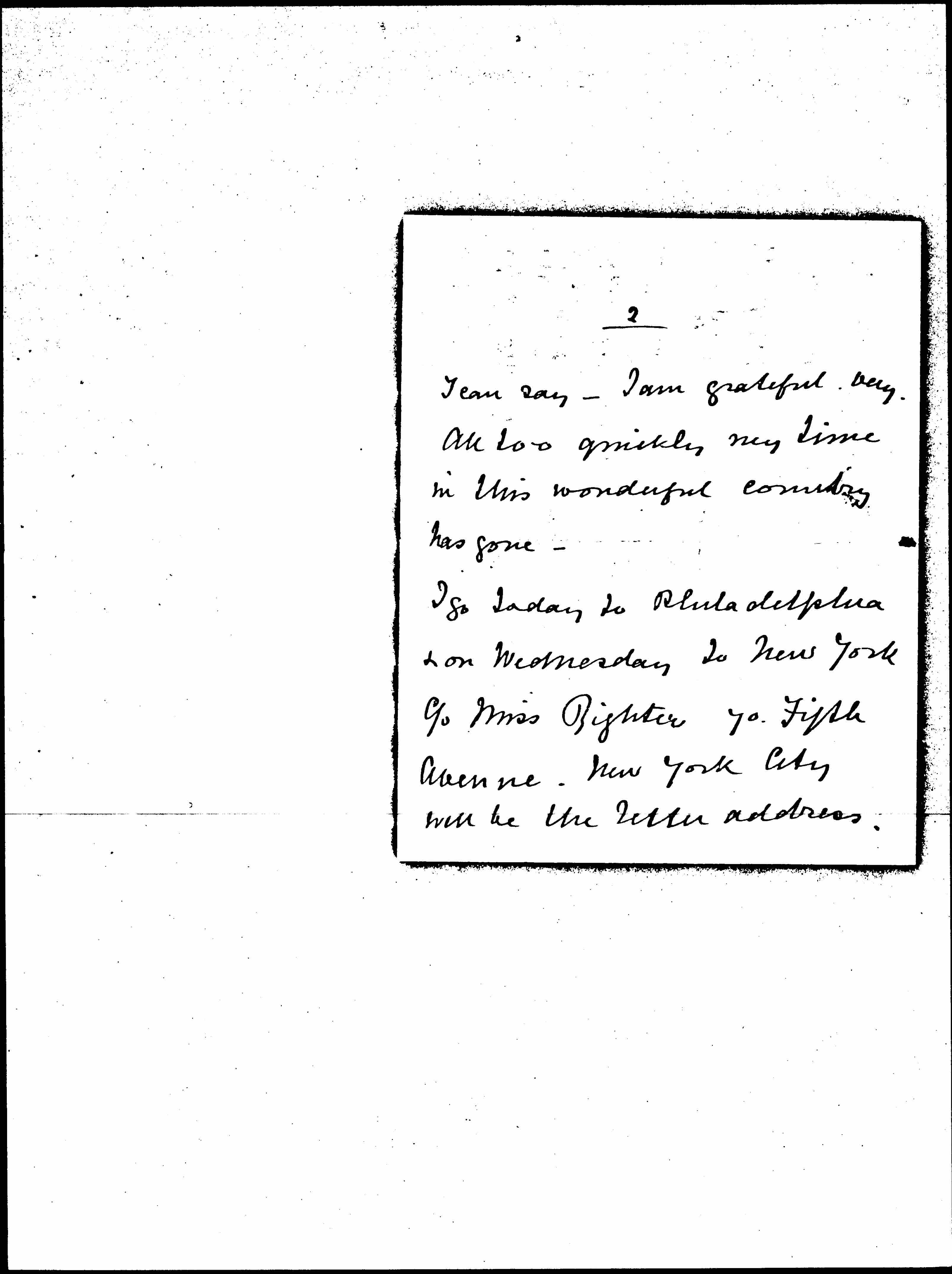 I go today to Philadelphia & on Wednesday to New York c/o Miss Righter 70 Fifth Avenue. New York City will be the letter address, [page 3] but I do not yet know where I stay. My dates are from Oct 27th to Oct 31st & from Nov 7th to 14th or 16th when I hope to sail --
