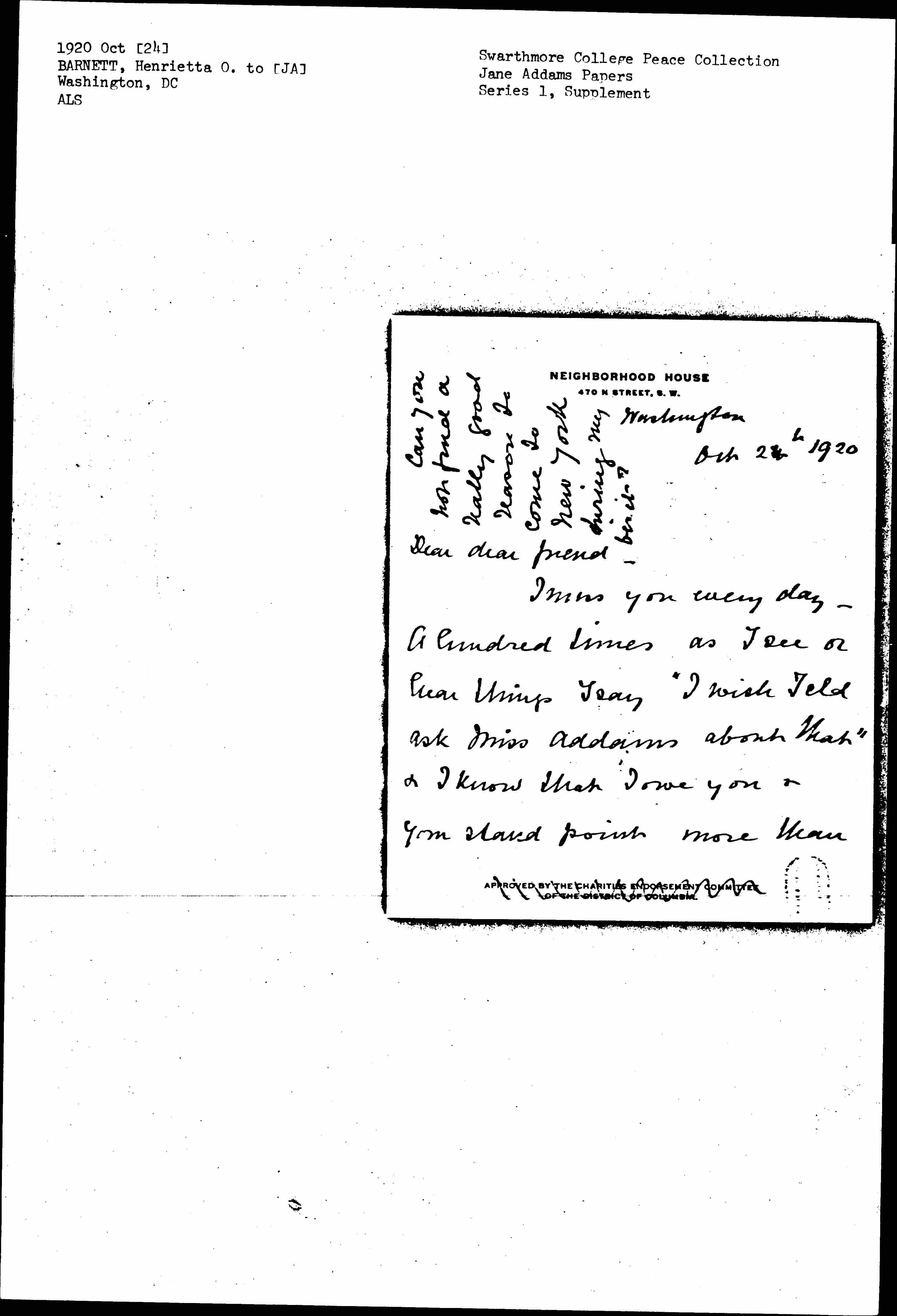 I miss you every day -- A hundred times as I see or hear things I say "I wish I cld ask Miss Addams about that" & I know that I owe you & your standpoint more than [page 2] I can say -- I am grateful very. All too quickly my time in this wonderful country has gone--